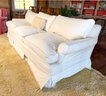 White slip cover over floral, down filled sofa.