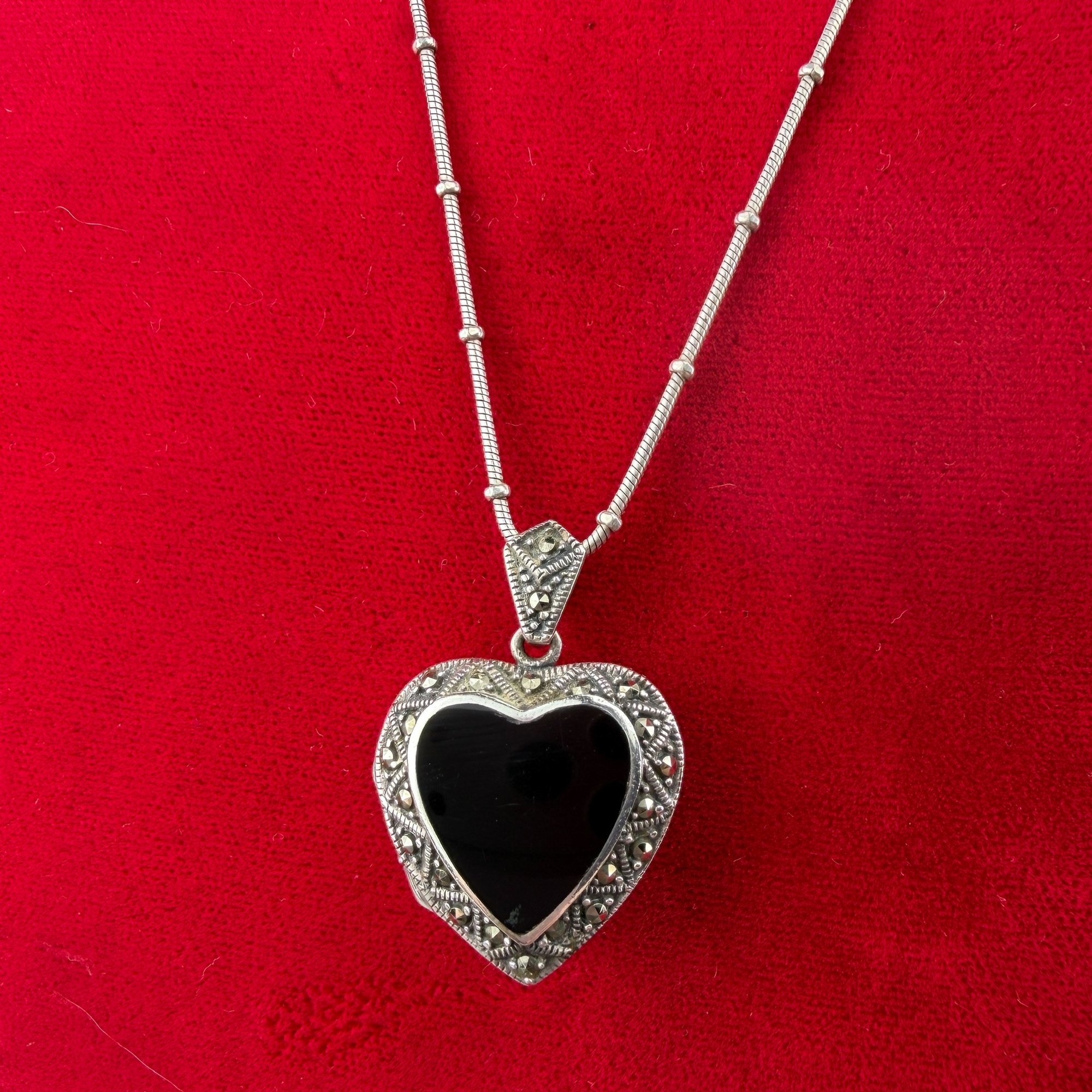 Sterling silver chain holding a luxurious heart shaped locket pendant with central onyx heartand a sterling silver and marcasite border.