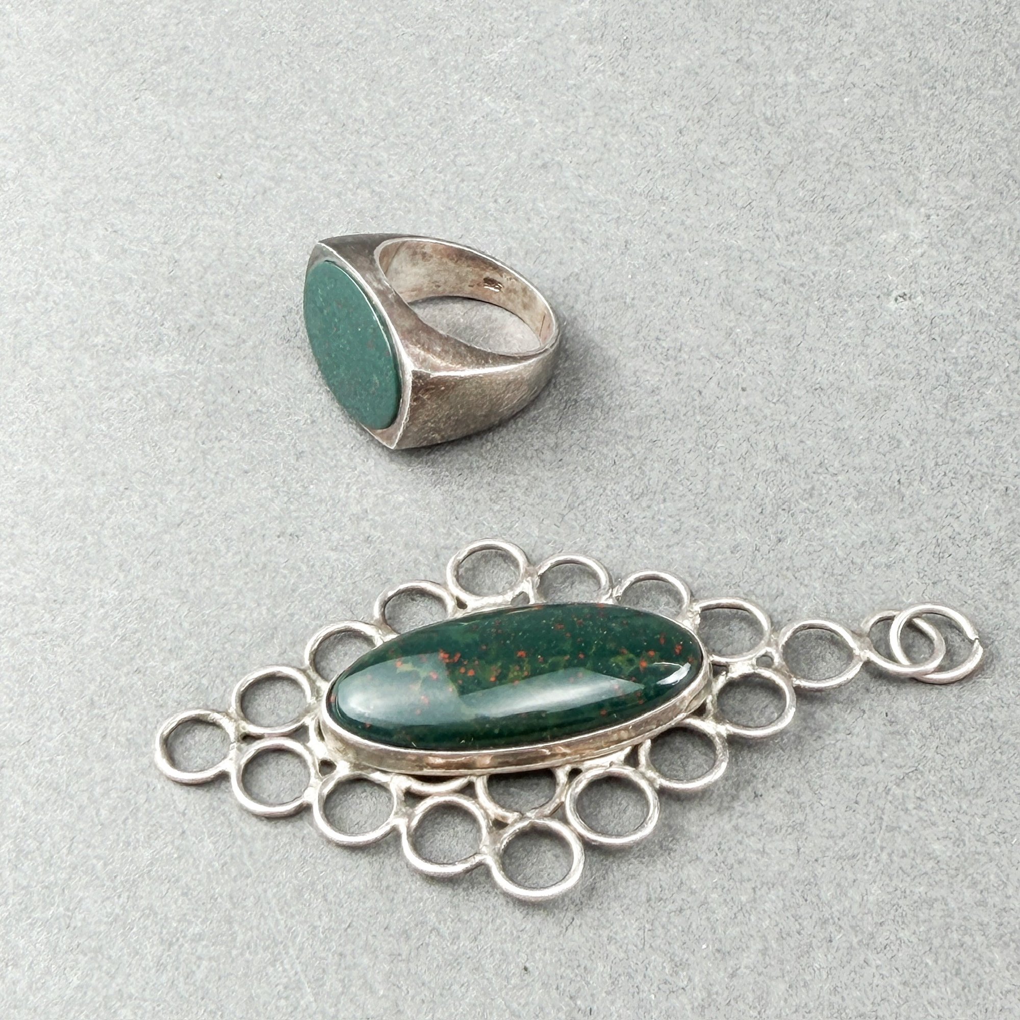 Sterling Silver and bloodstone jasper signet ring and Pendant comprised of circles surrounding oval cabochon bloodstone jasper.