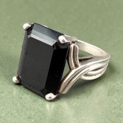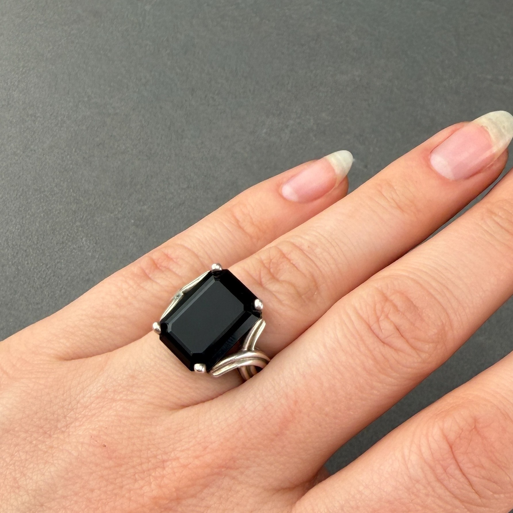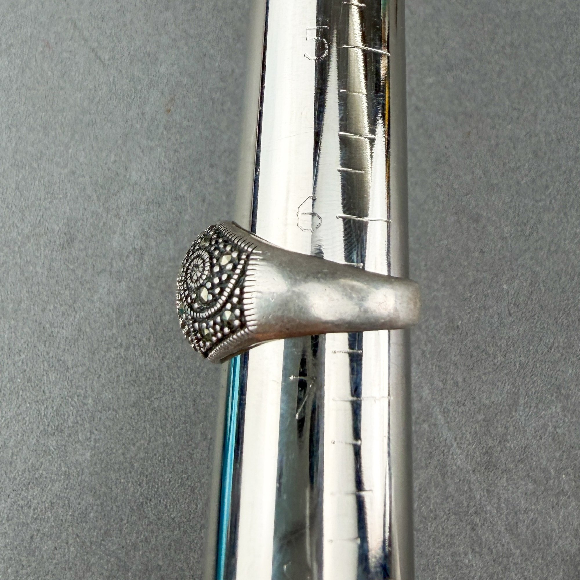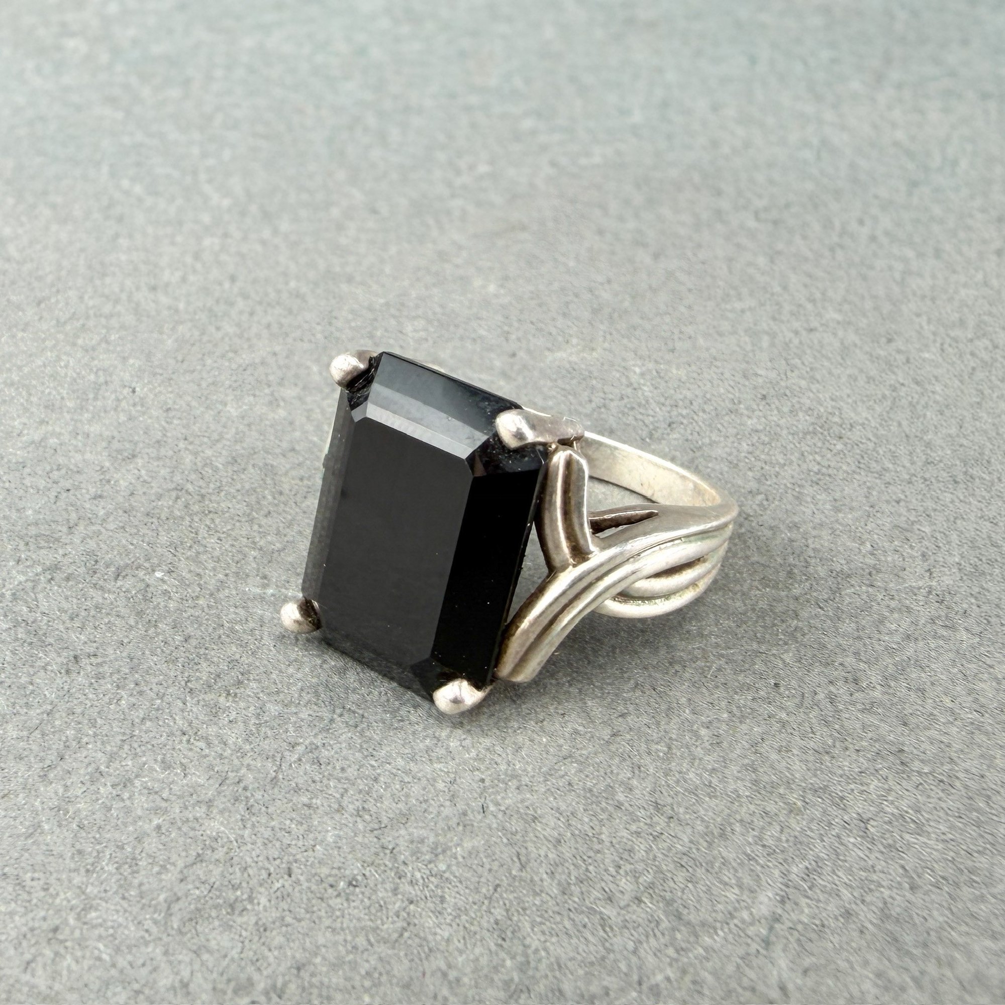 (2) Sterling silver cocktail style rings with black onyx and prong setting and marcasite