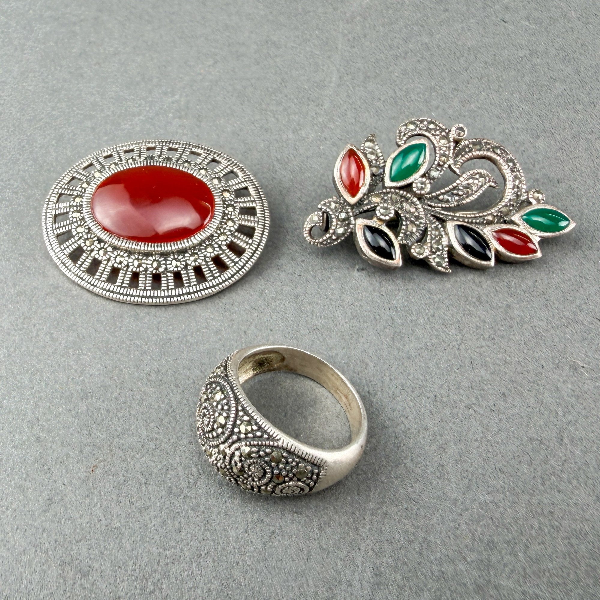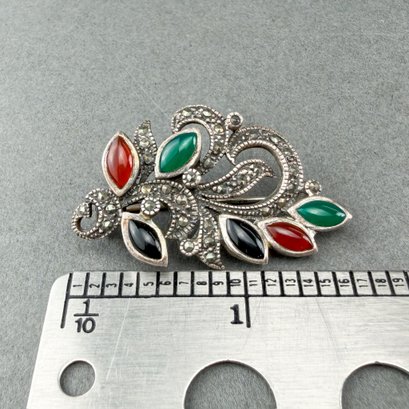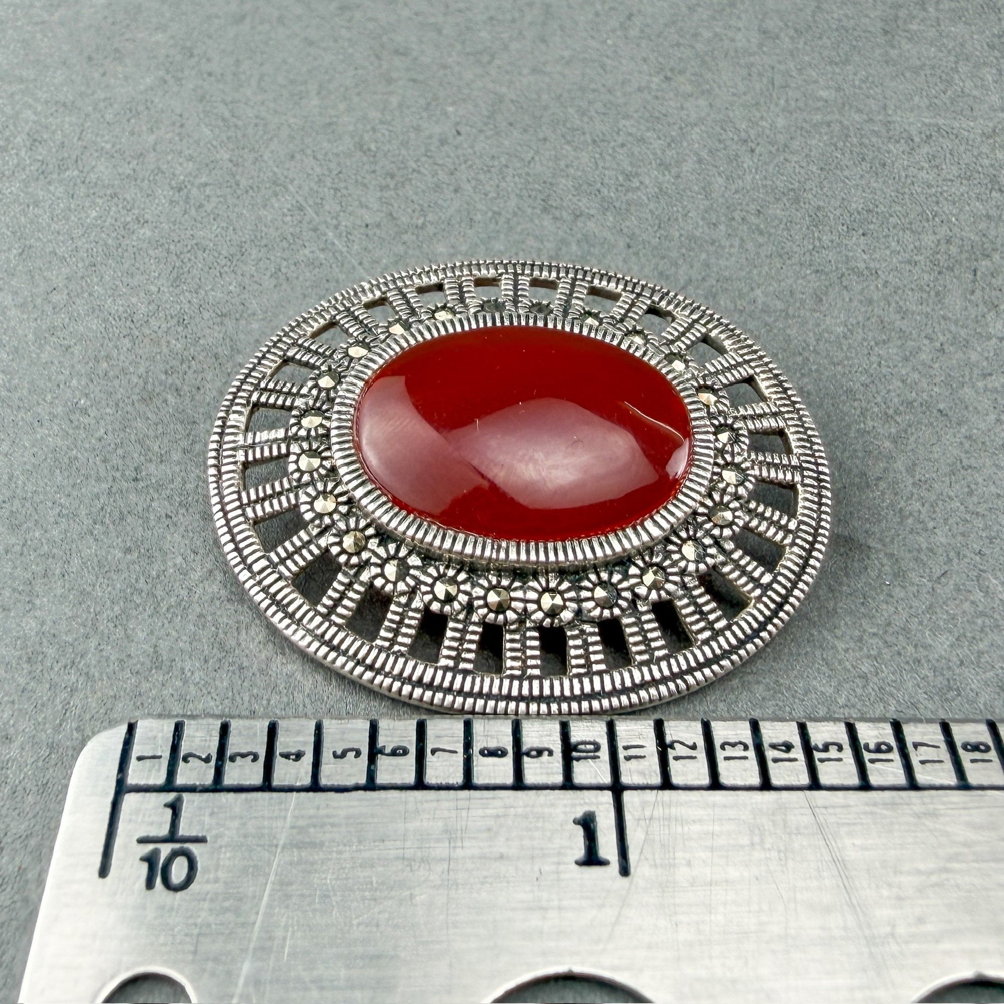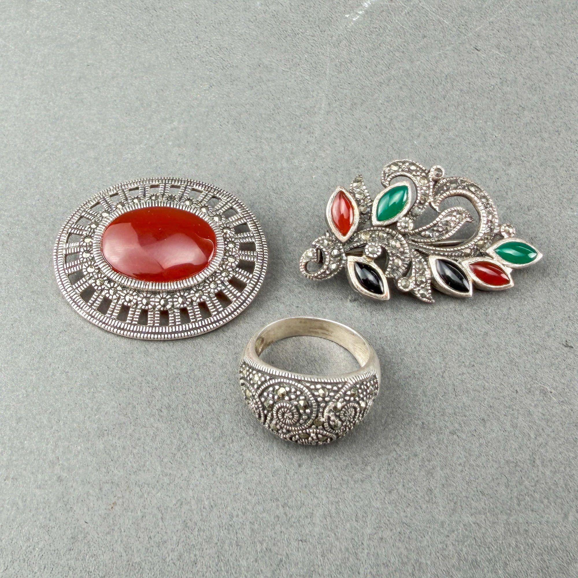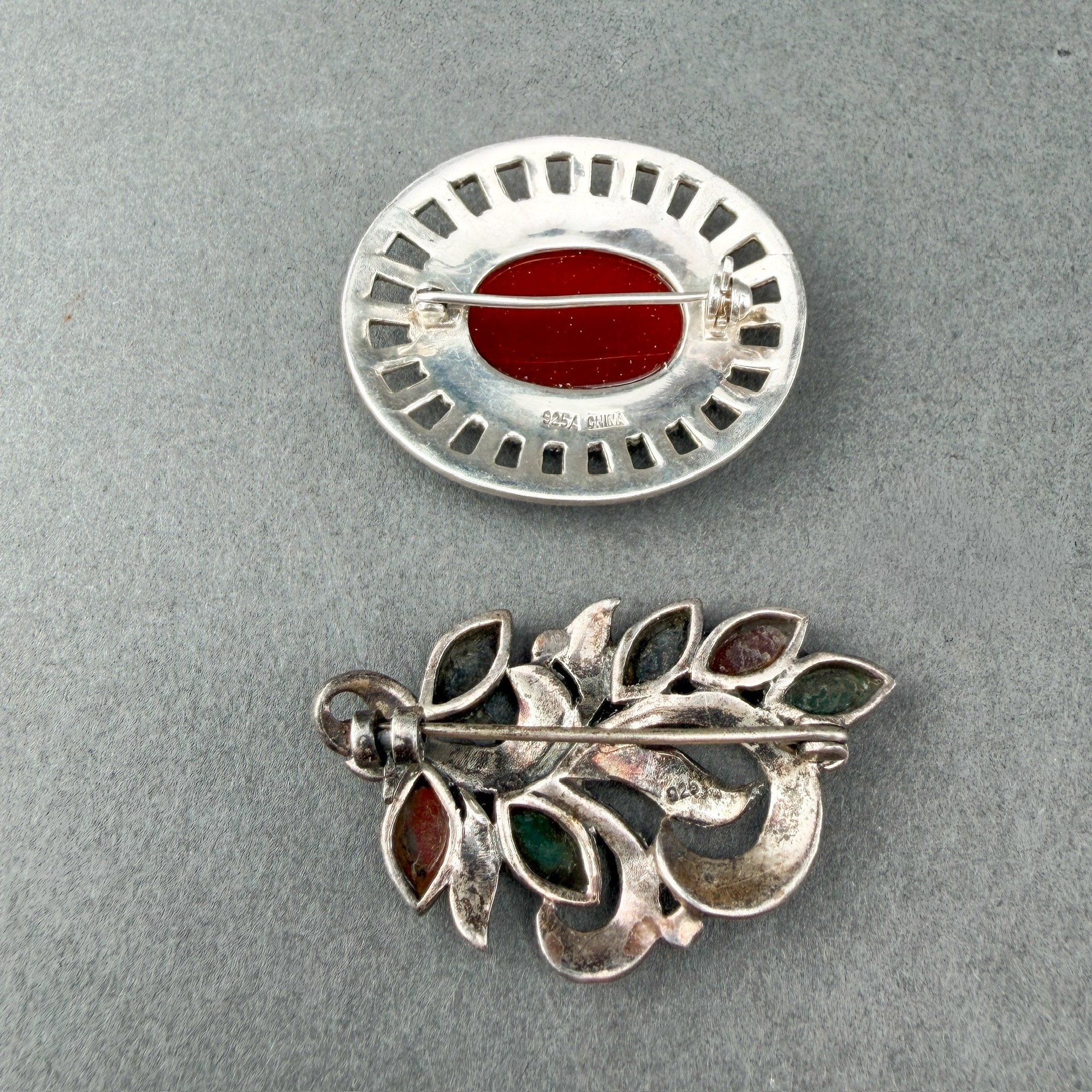(2) brooches. One Carnelian oval with marcasite surround and one featuring carnelian as well as black and green onyx set in sterling silver