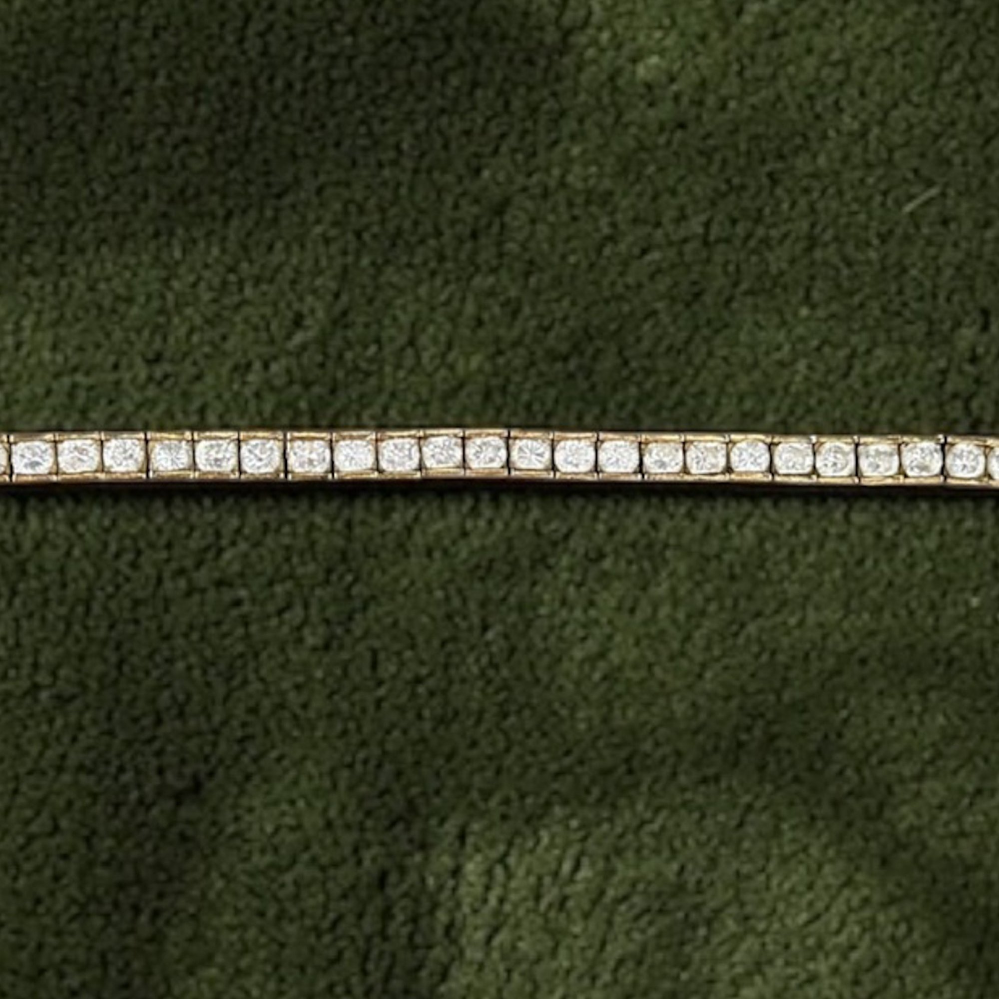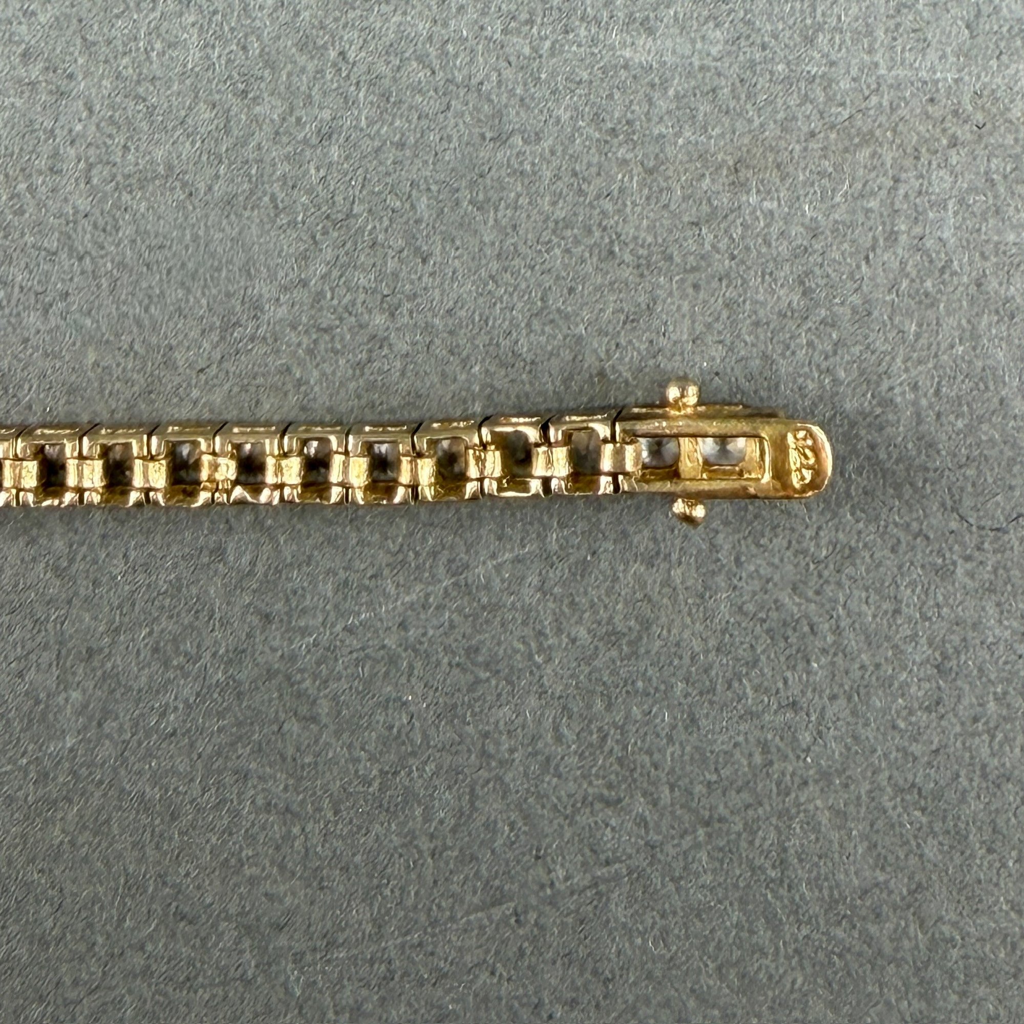 Classic tennis bracelet in gold tone plate sterling silver and diamond like stones. Stones untested.