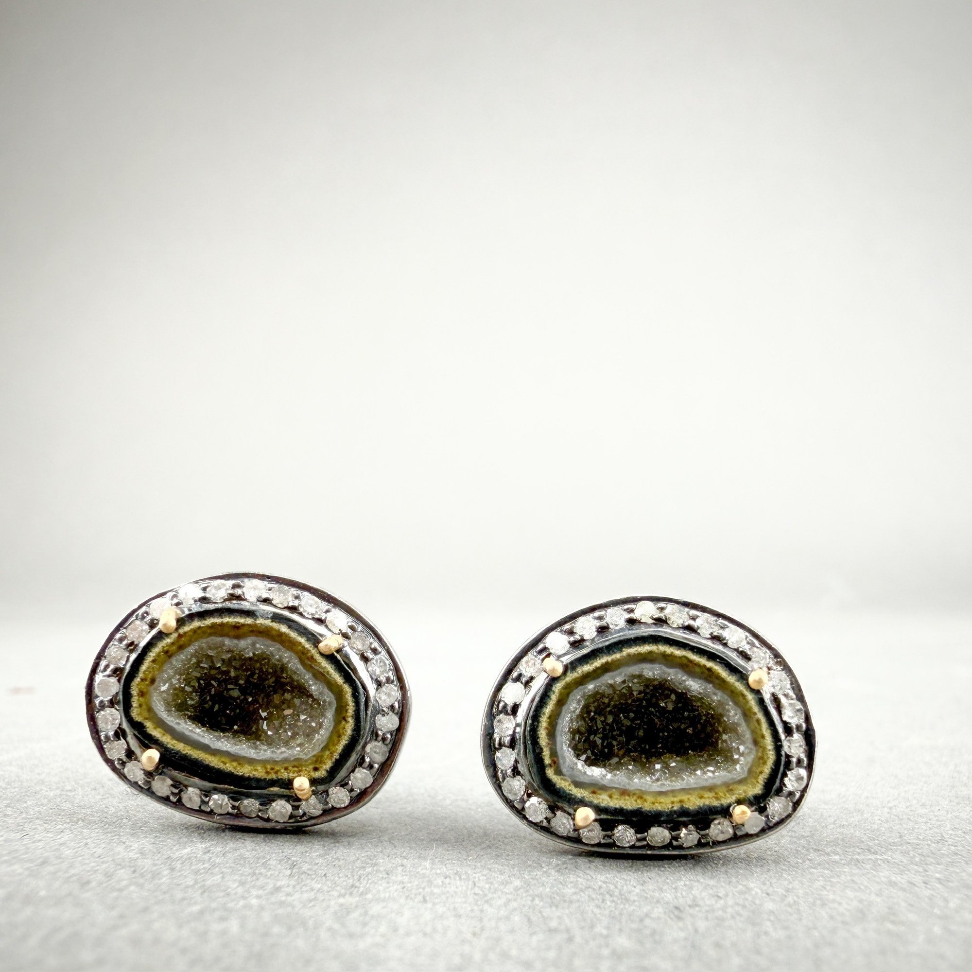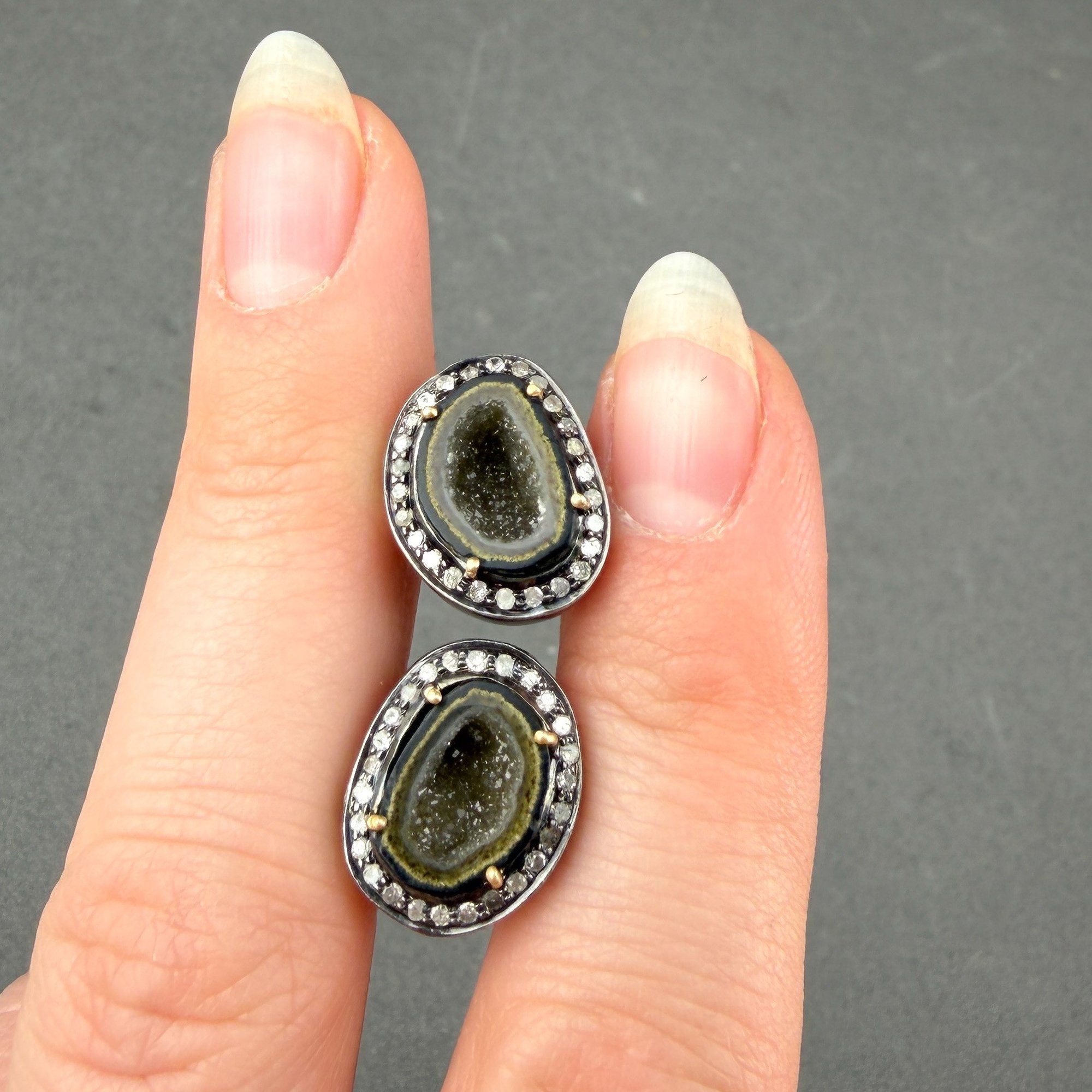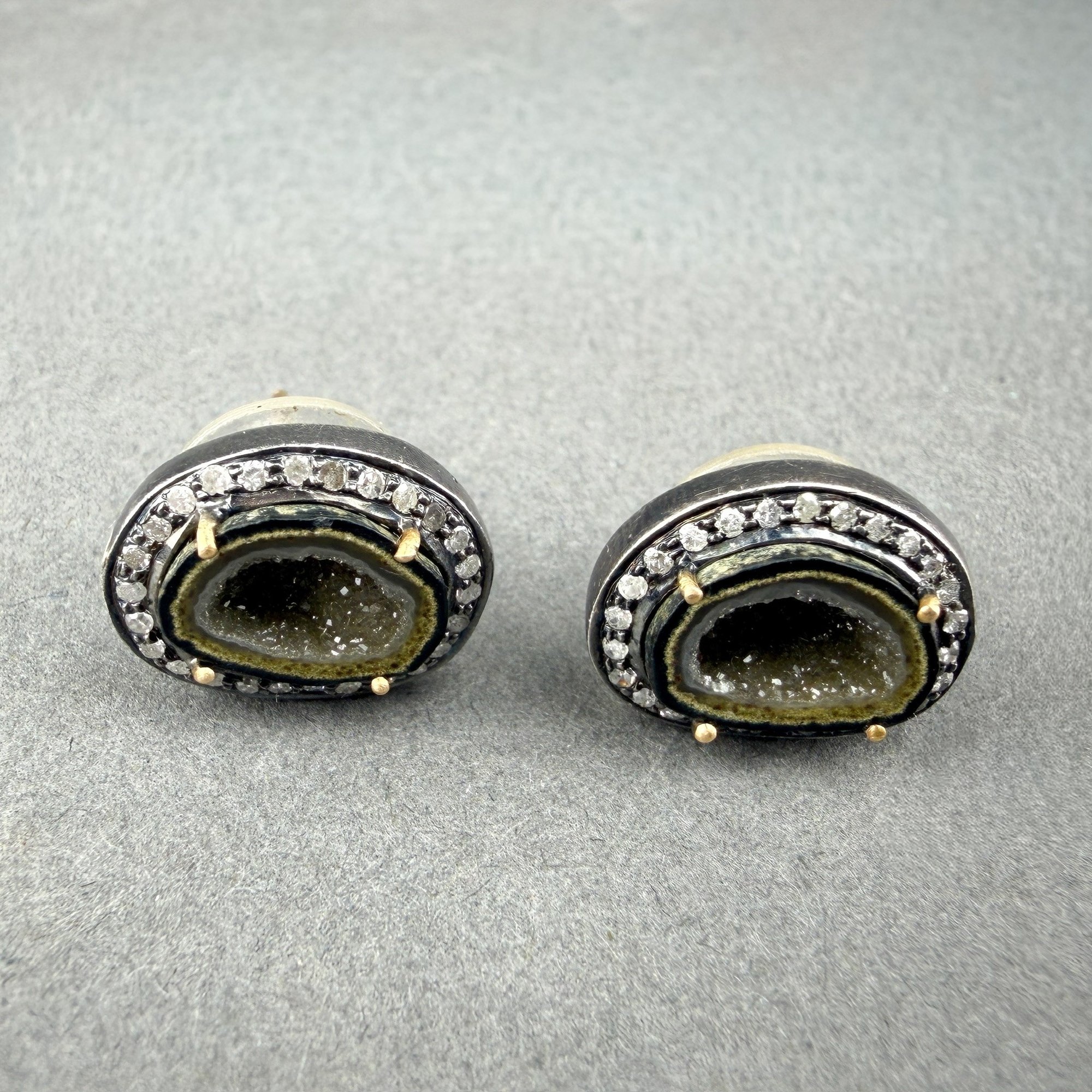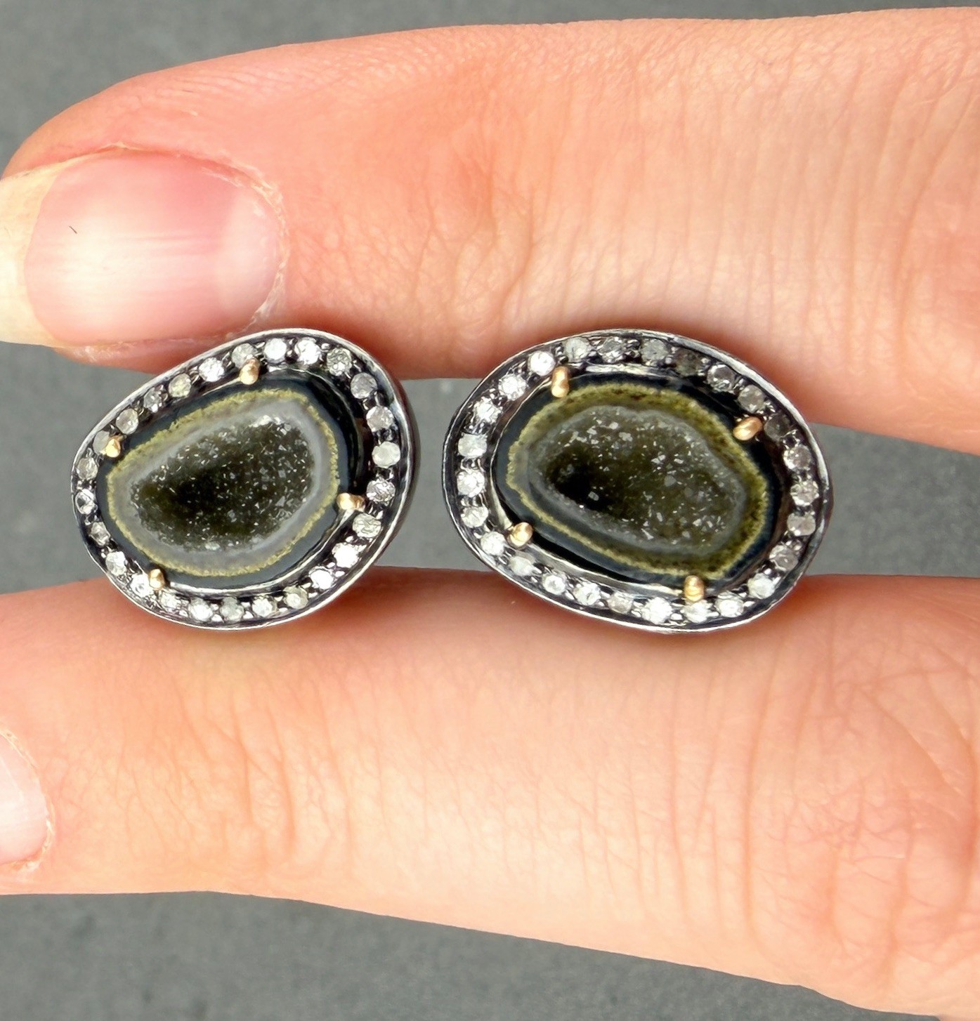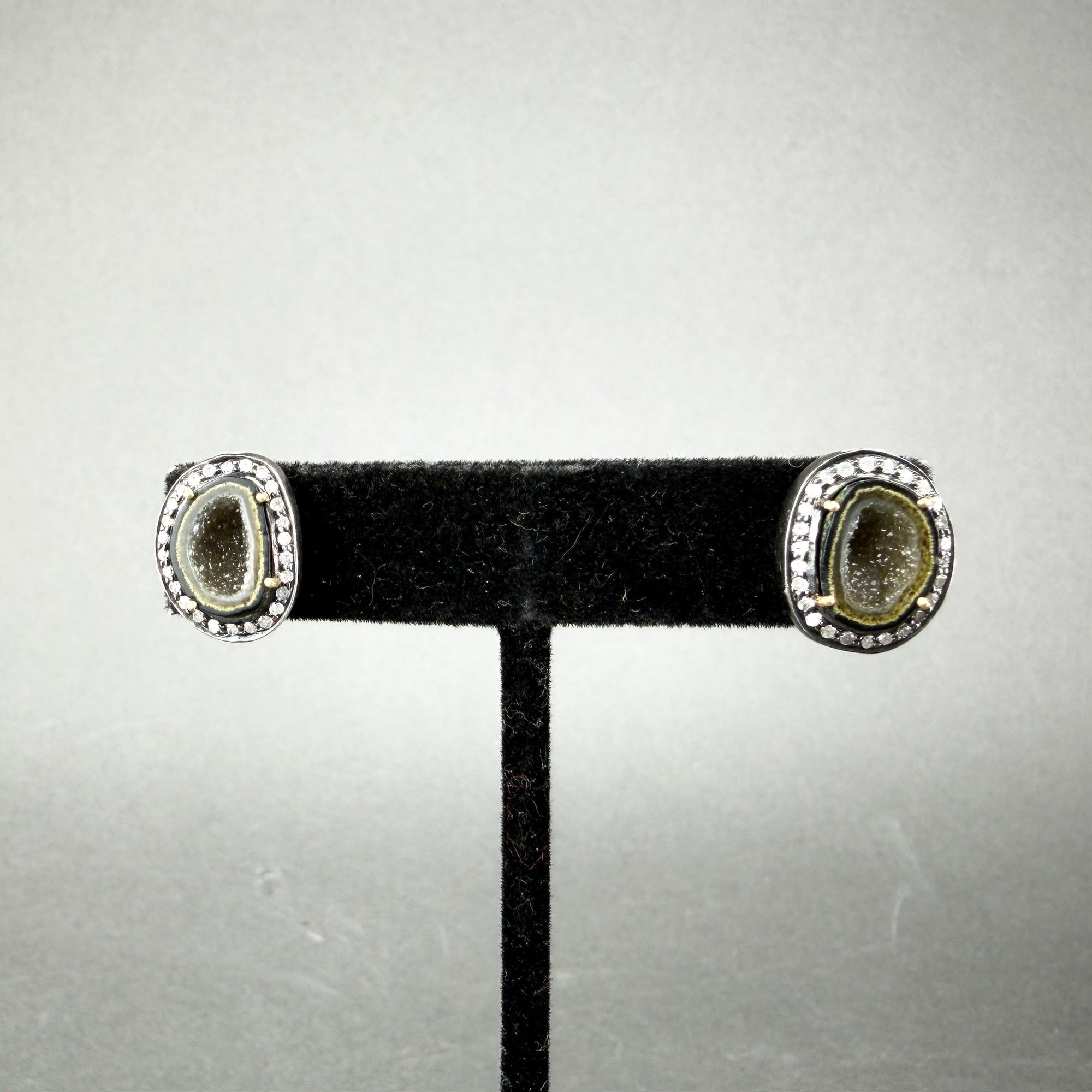 Striking post style earrings comprised of pave diamonds encircling a geode all set in sterling silver.