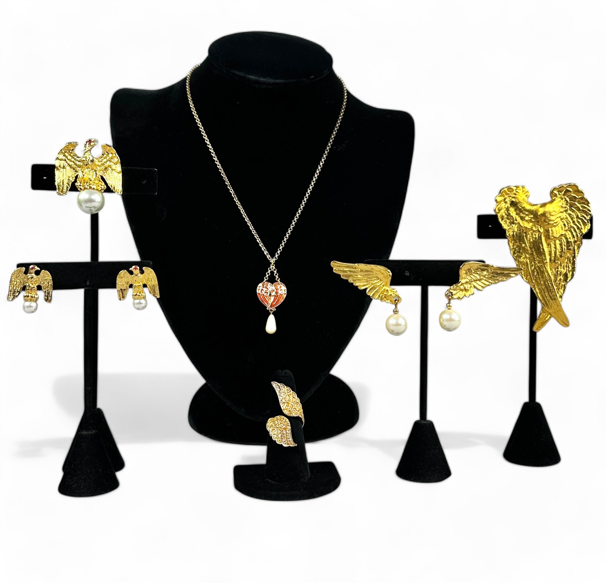 Vintage New, Earrings, Rings, Pins and Necklace in gold tone by Ann hand, Tunque NYC and