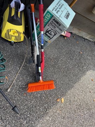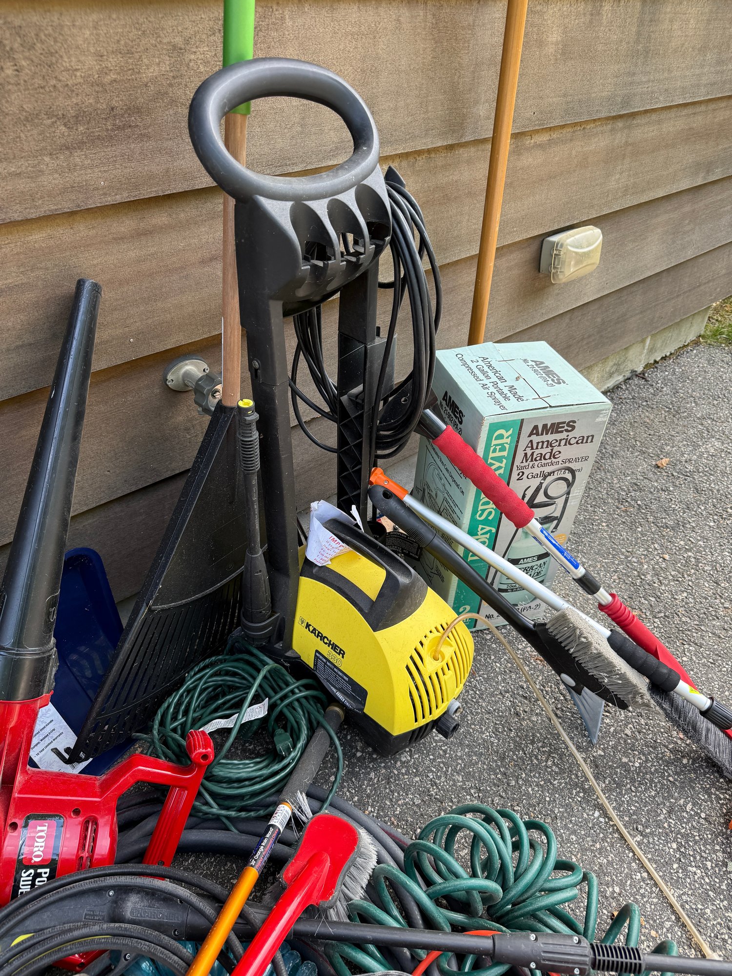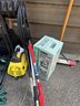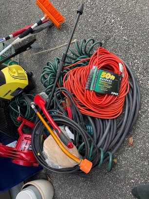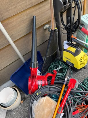 Storage Rack And Assorted Lot Of Tools, Hoses, Cords, Leaf Blower And Maintenance Help!