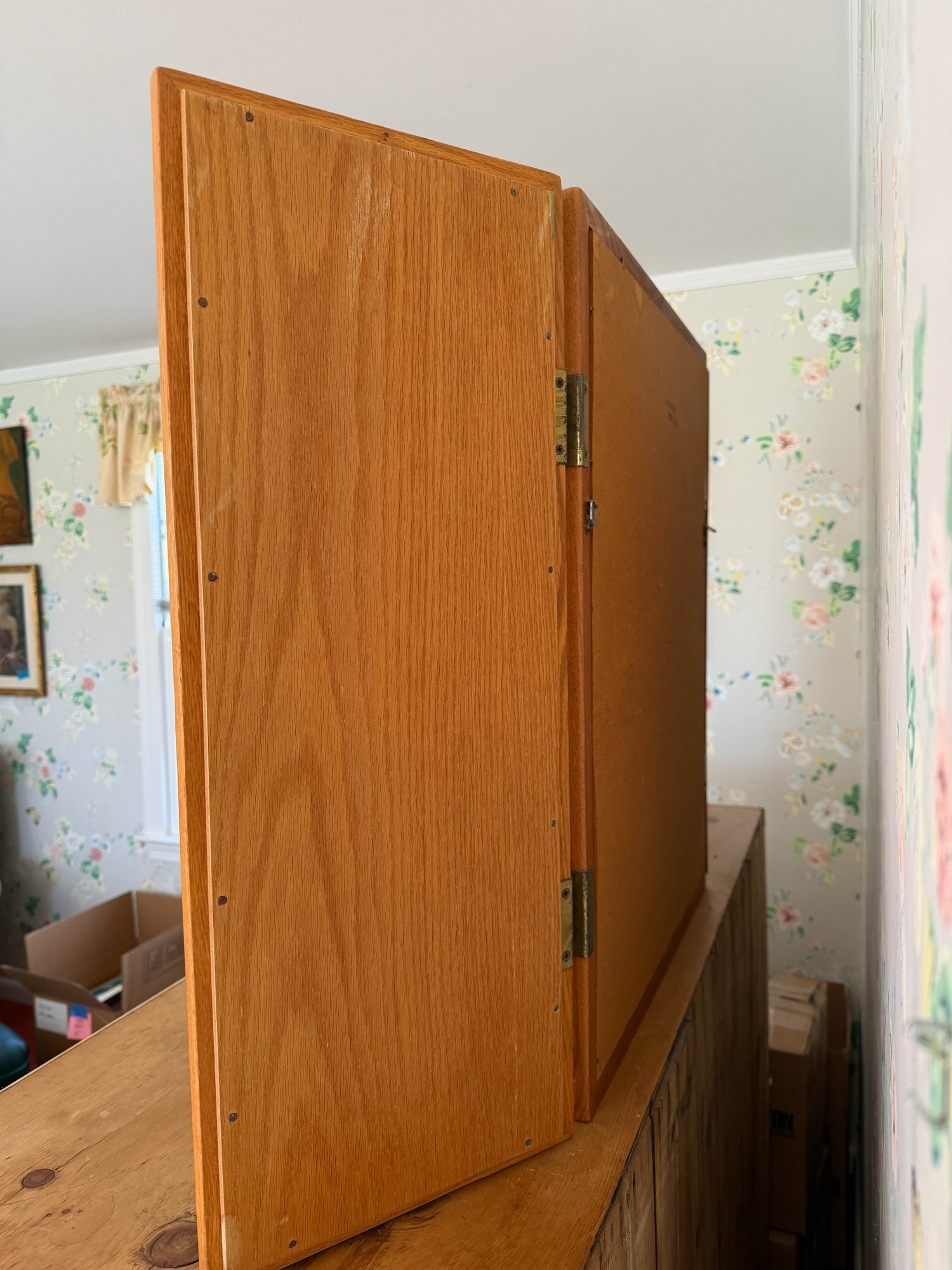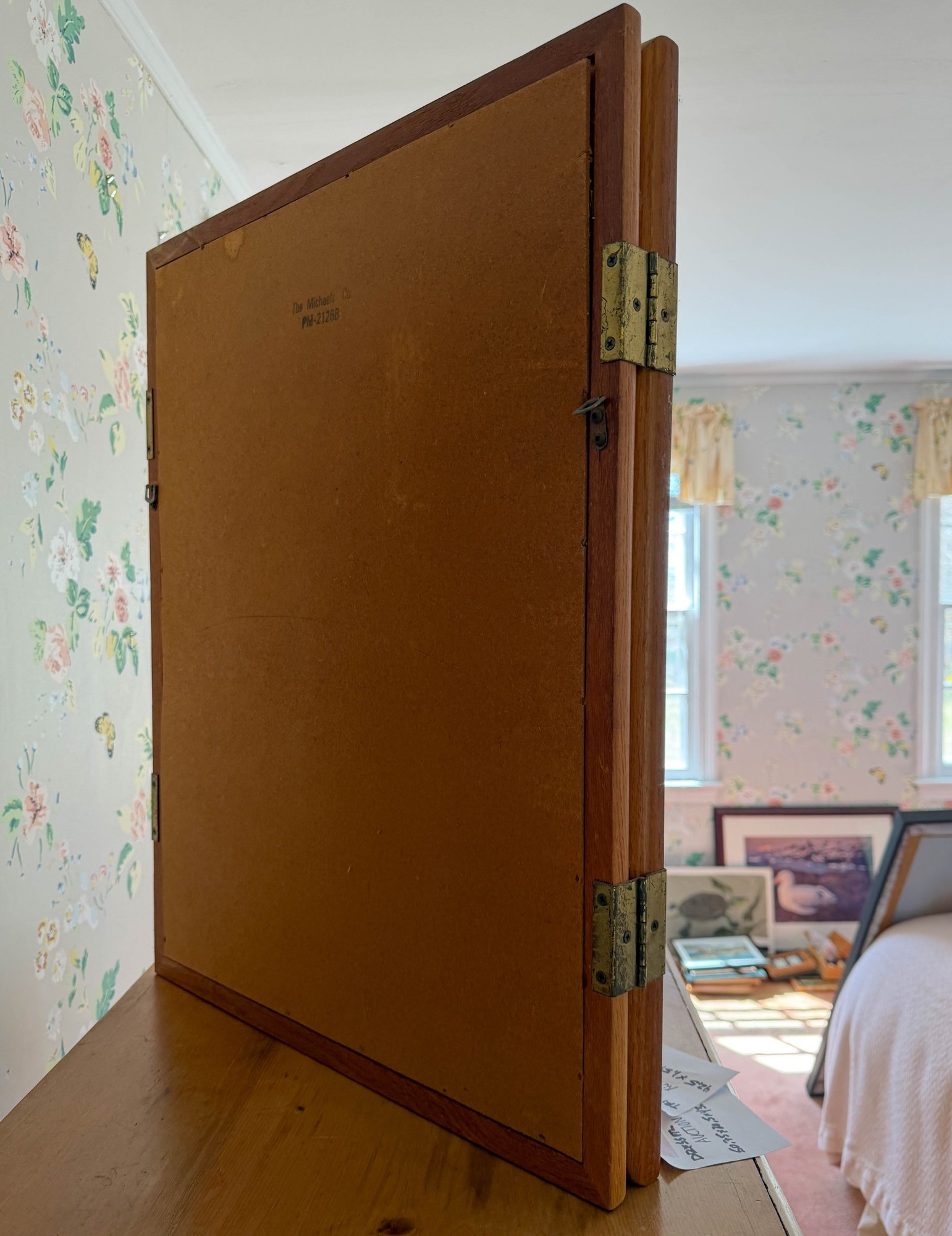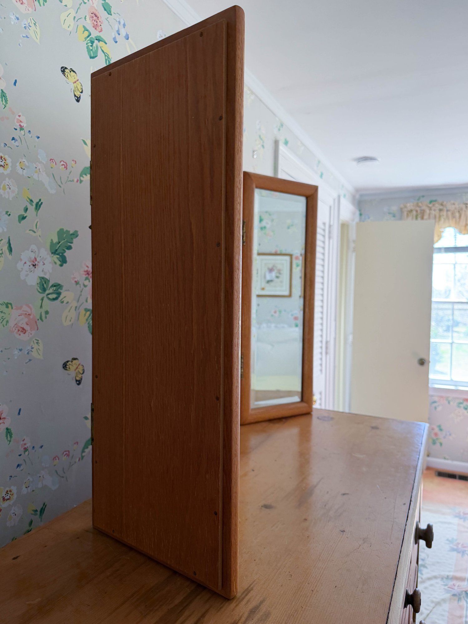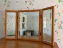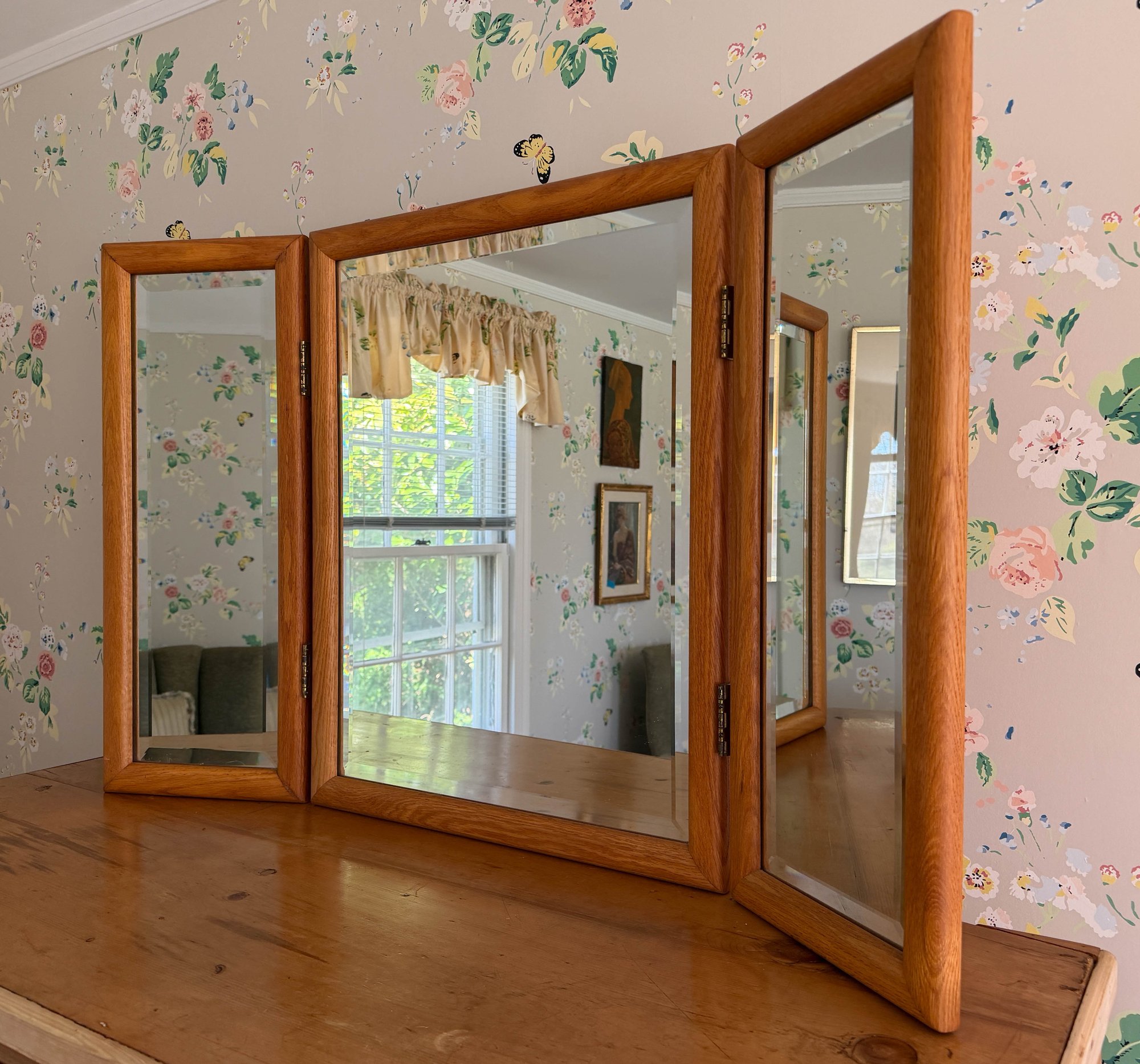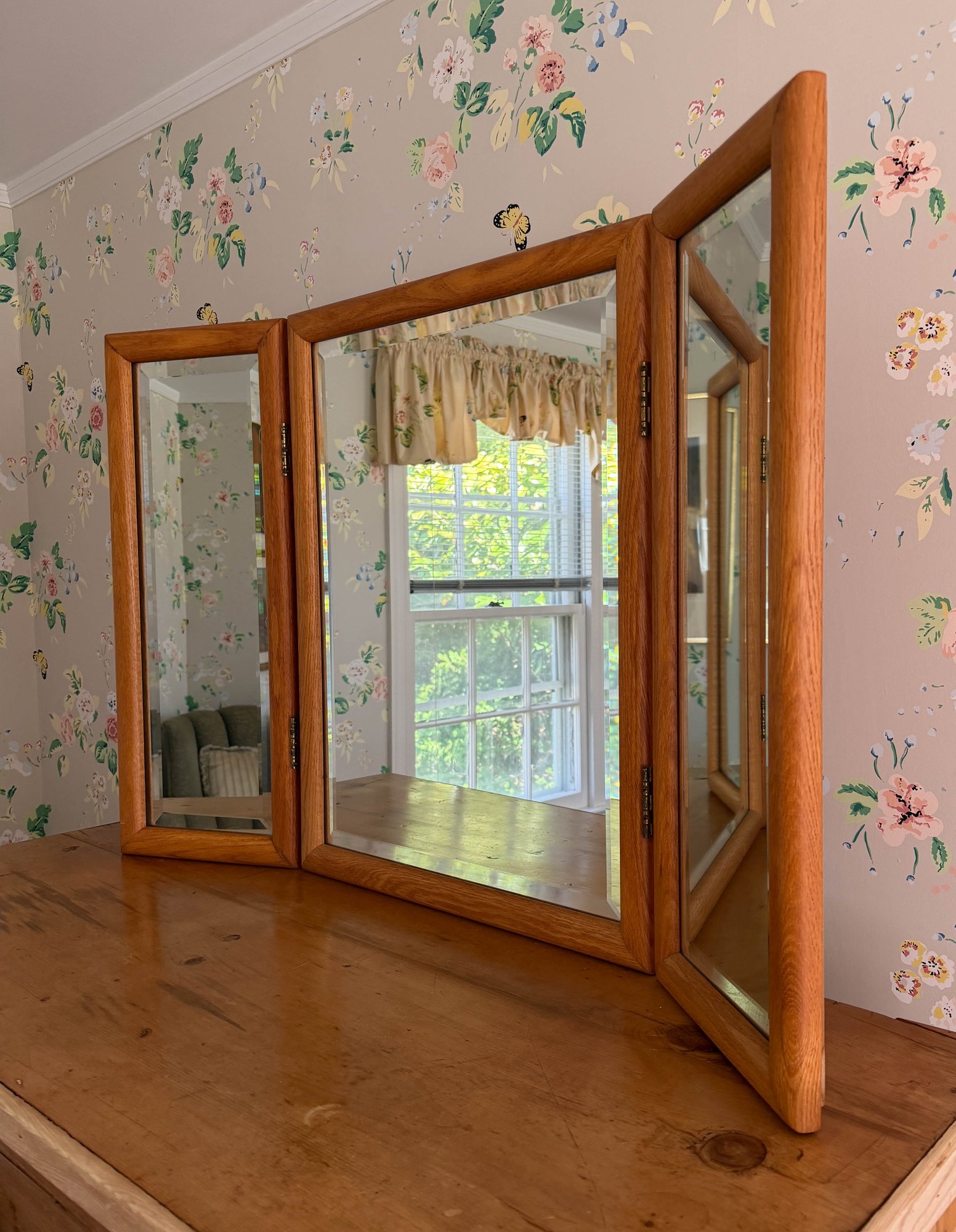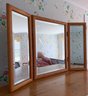 Solid wood framed and backed tri fold mirror with beveled glass.