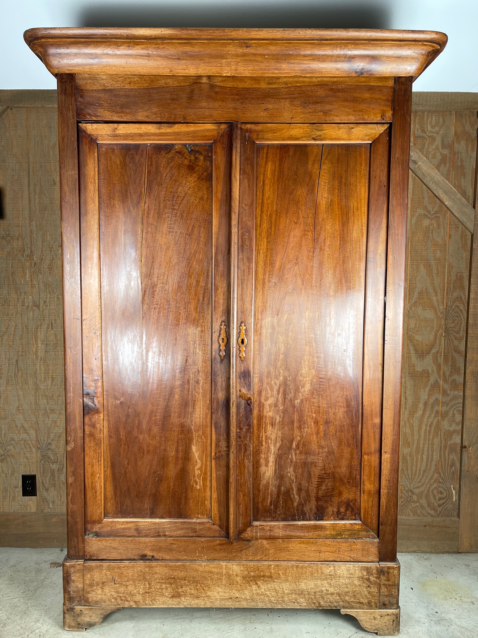 Fantastic French tall armoire. Two door and three shelf wardrobe armoire. All around perfect antique piece. Used for storage, gun case, bar, or wardrobe. Lots of space!