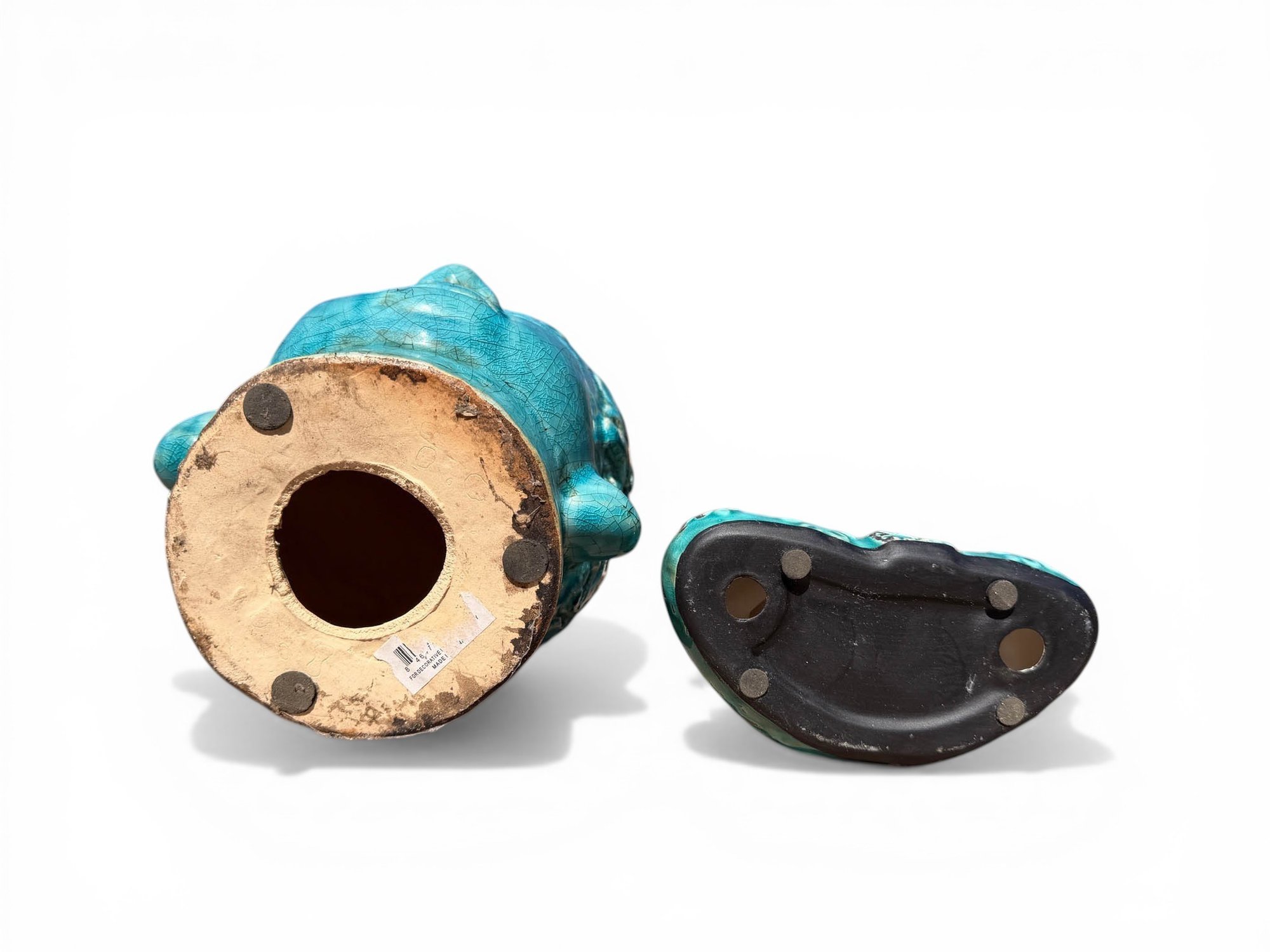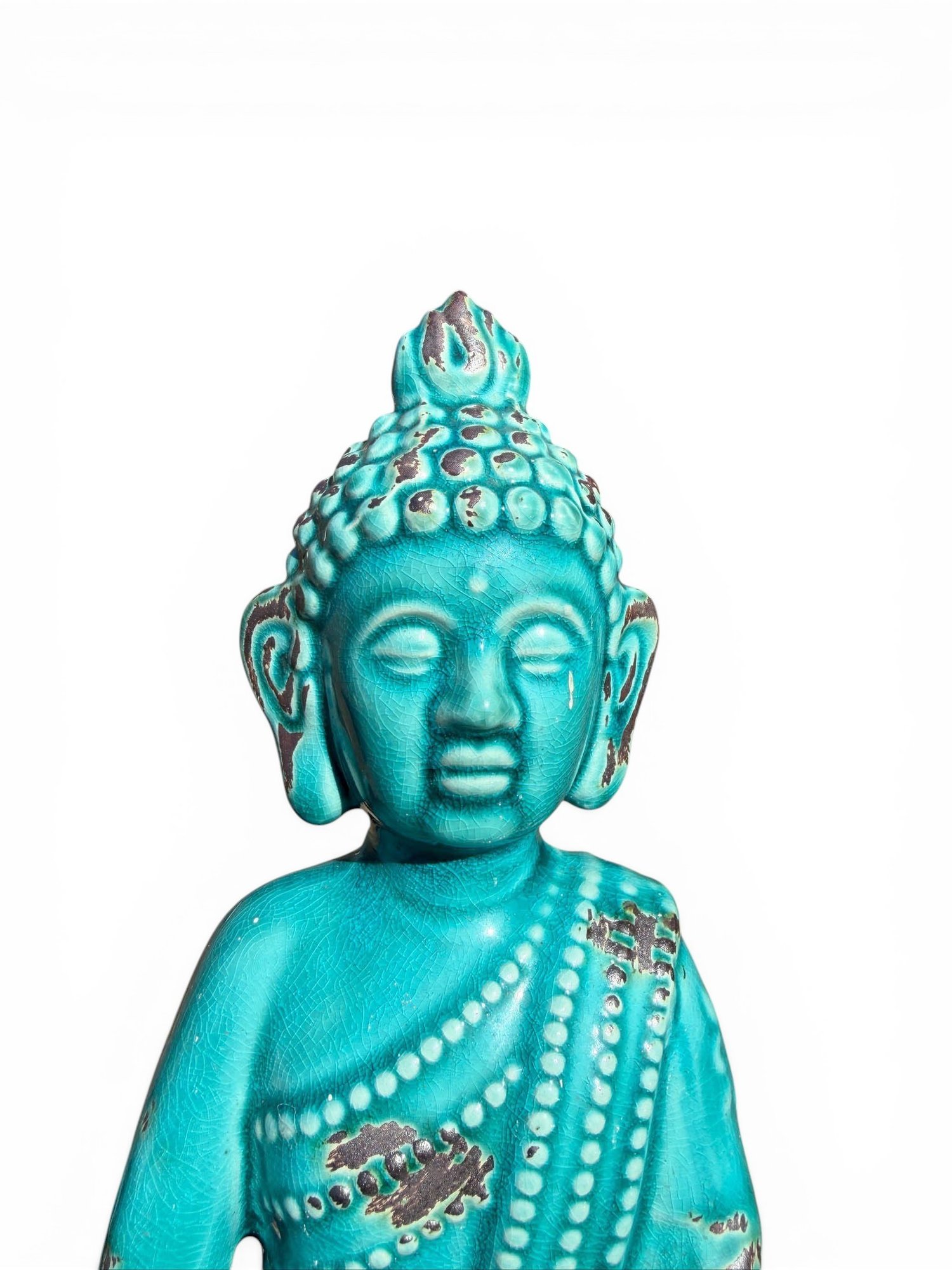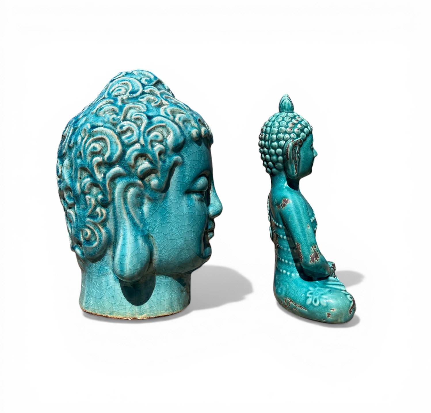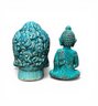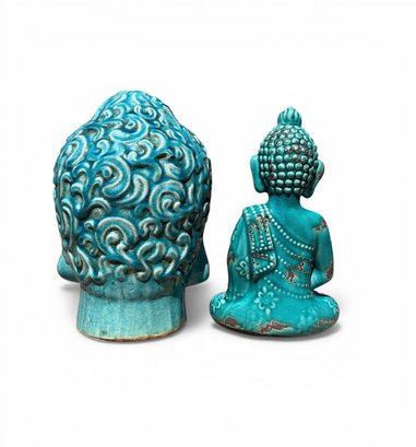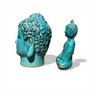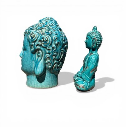 TERRACOTTA SITTING BUDDHA AND HEAD IN TURQUOISE GLAZE