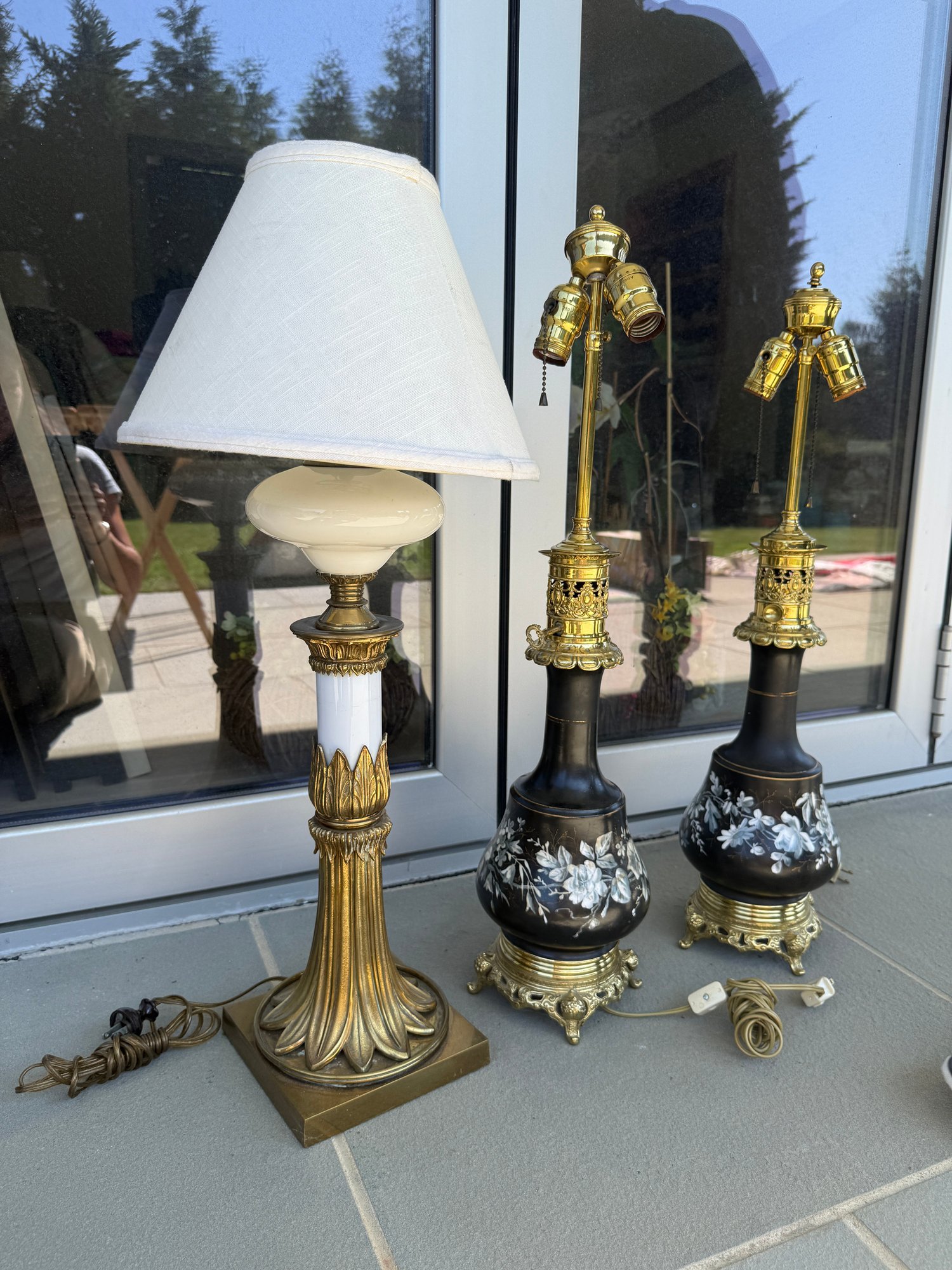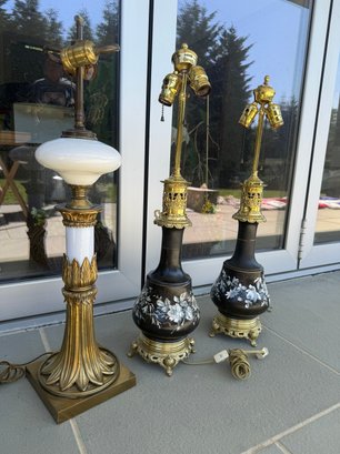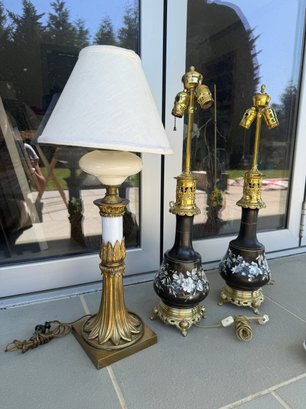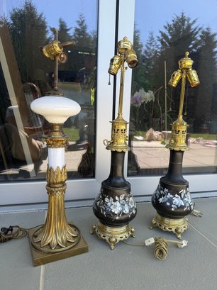 Three Gilt Bronze And Porcelain Or Glass Table Lamps
