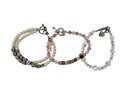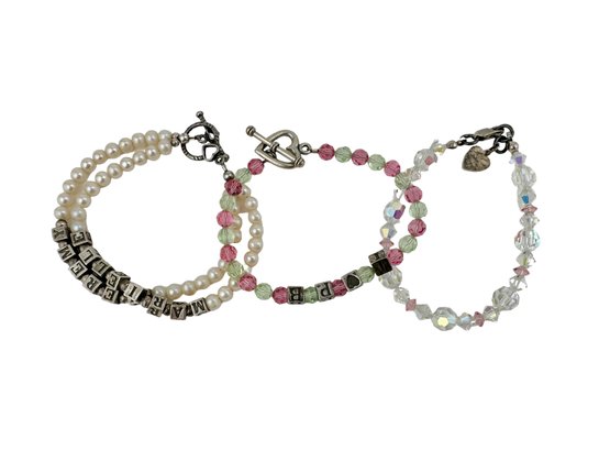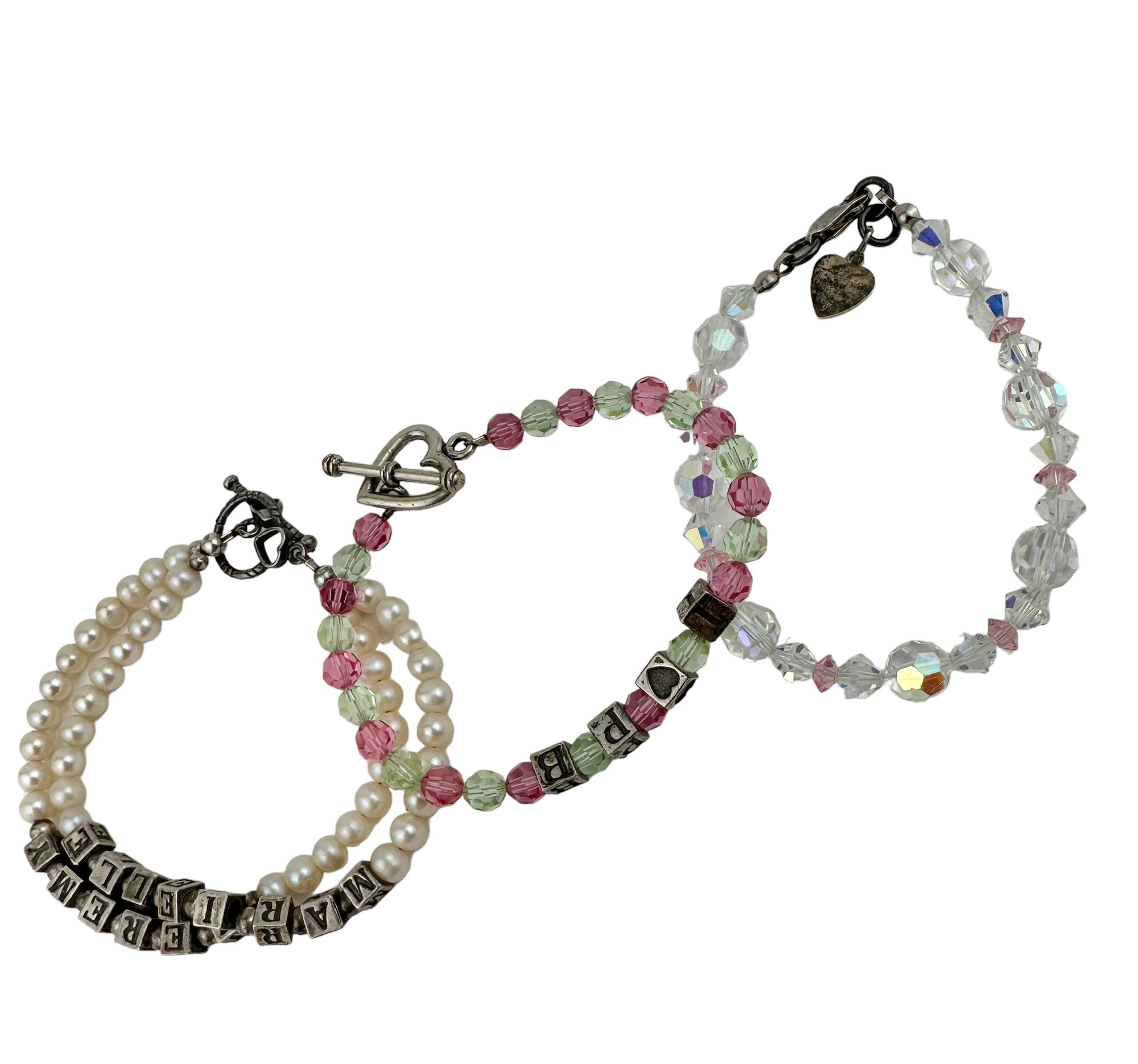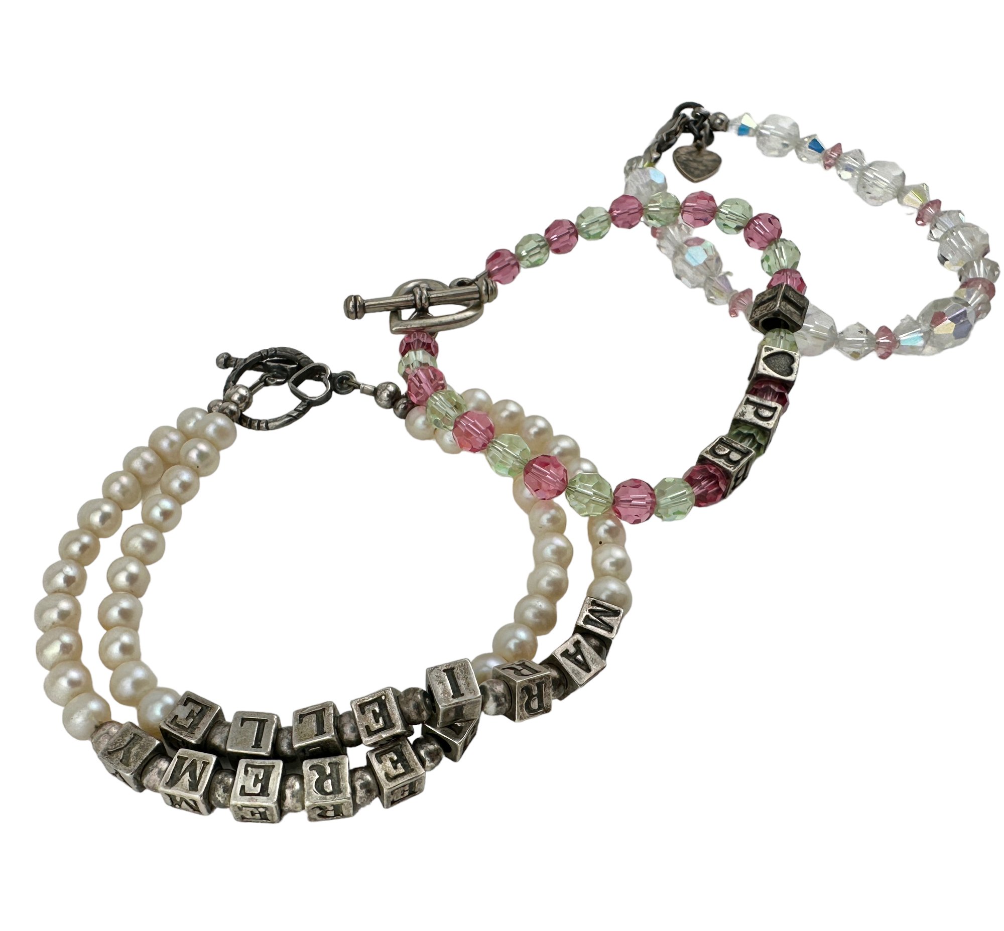 Pink and Green Bracelet measures 7 1/2" Long, sterling silver heart eye and toggle clasp with four sterling block charms