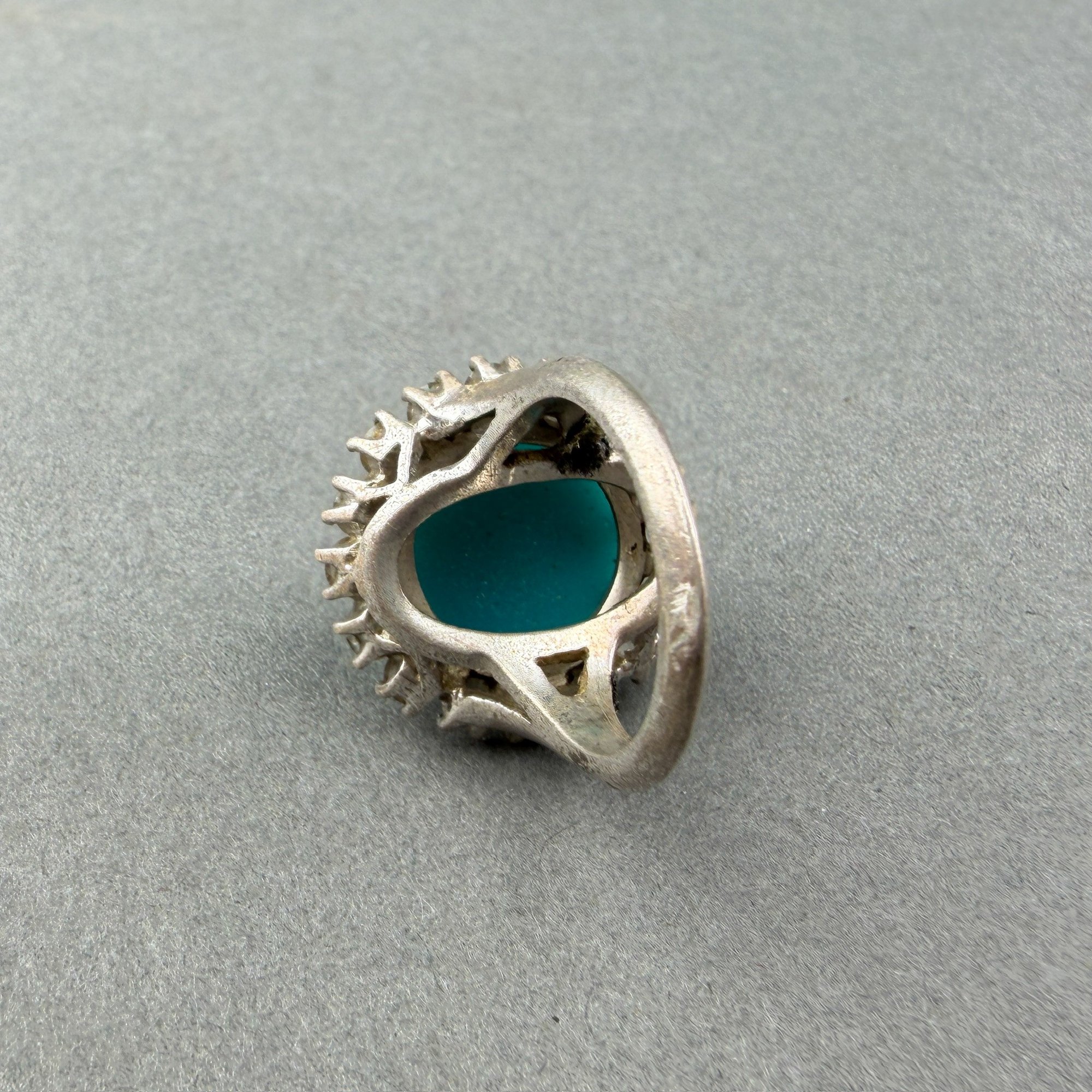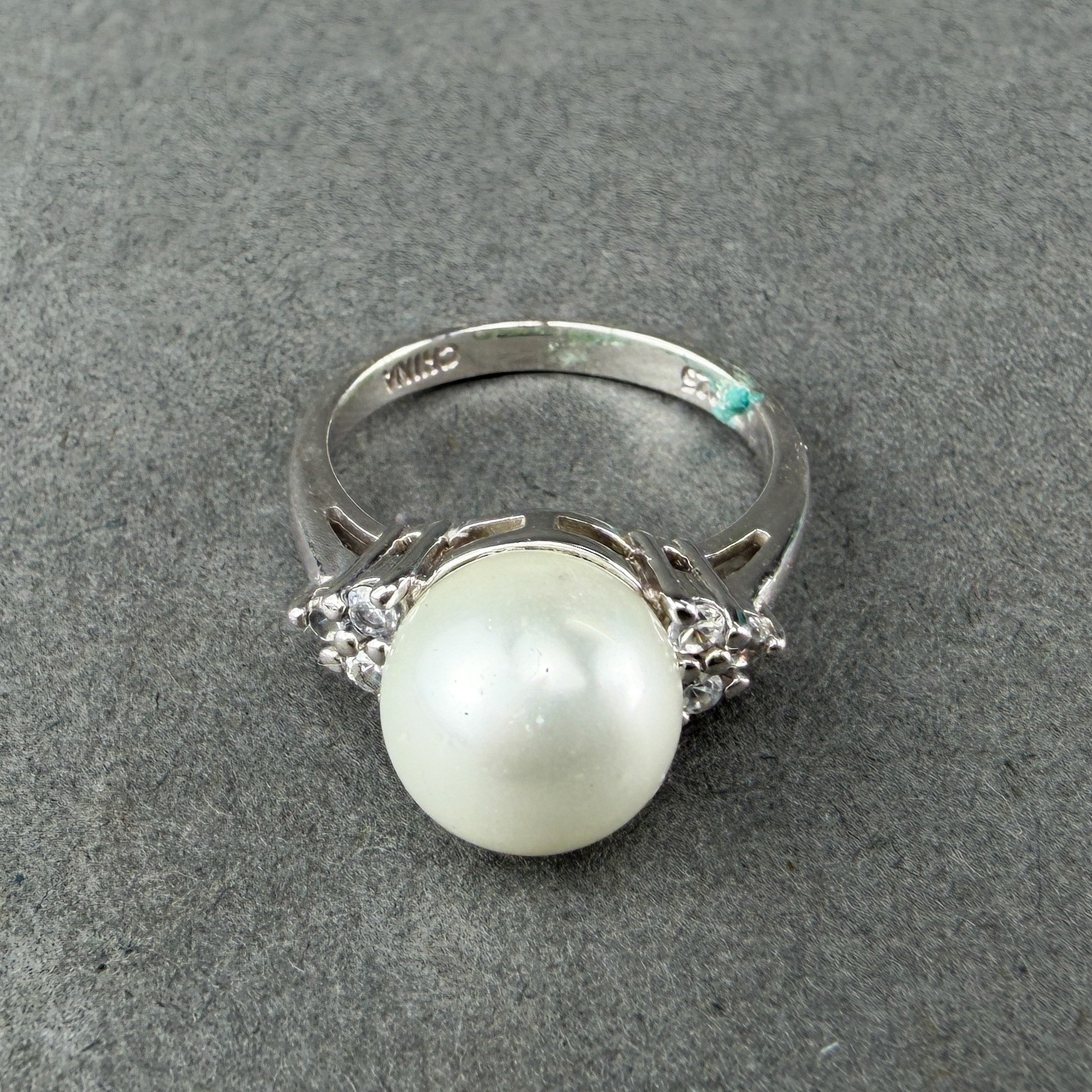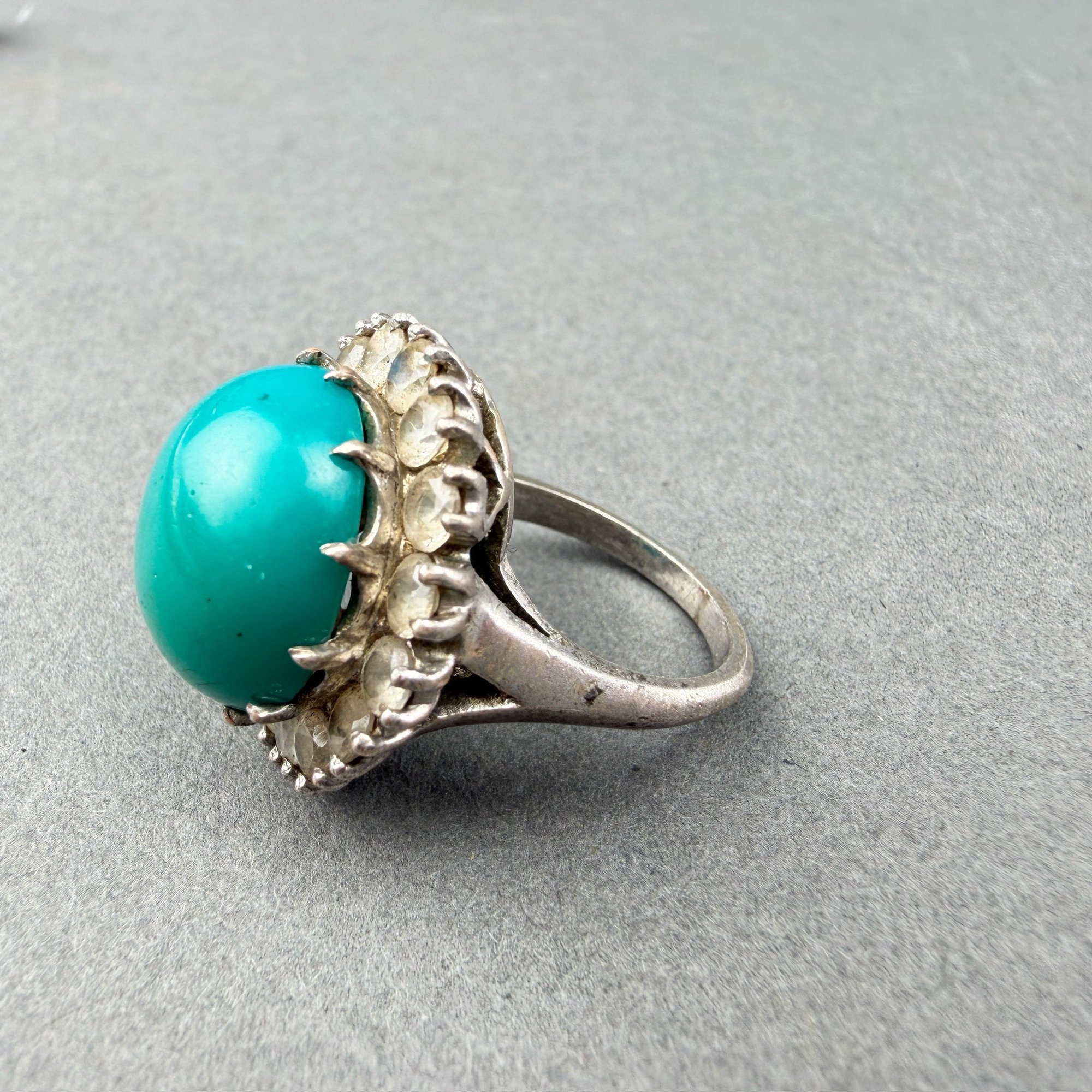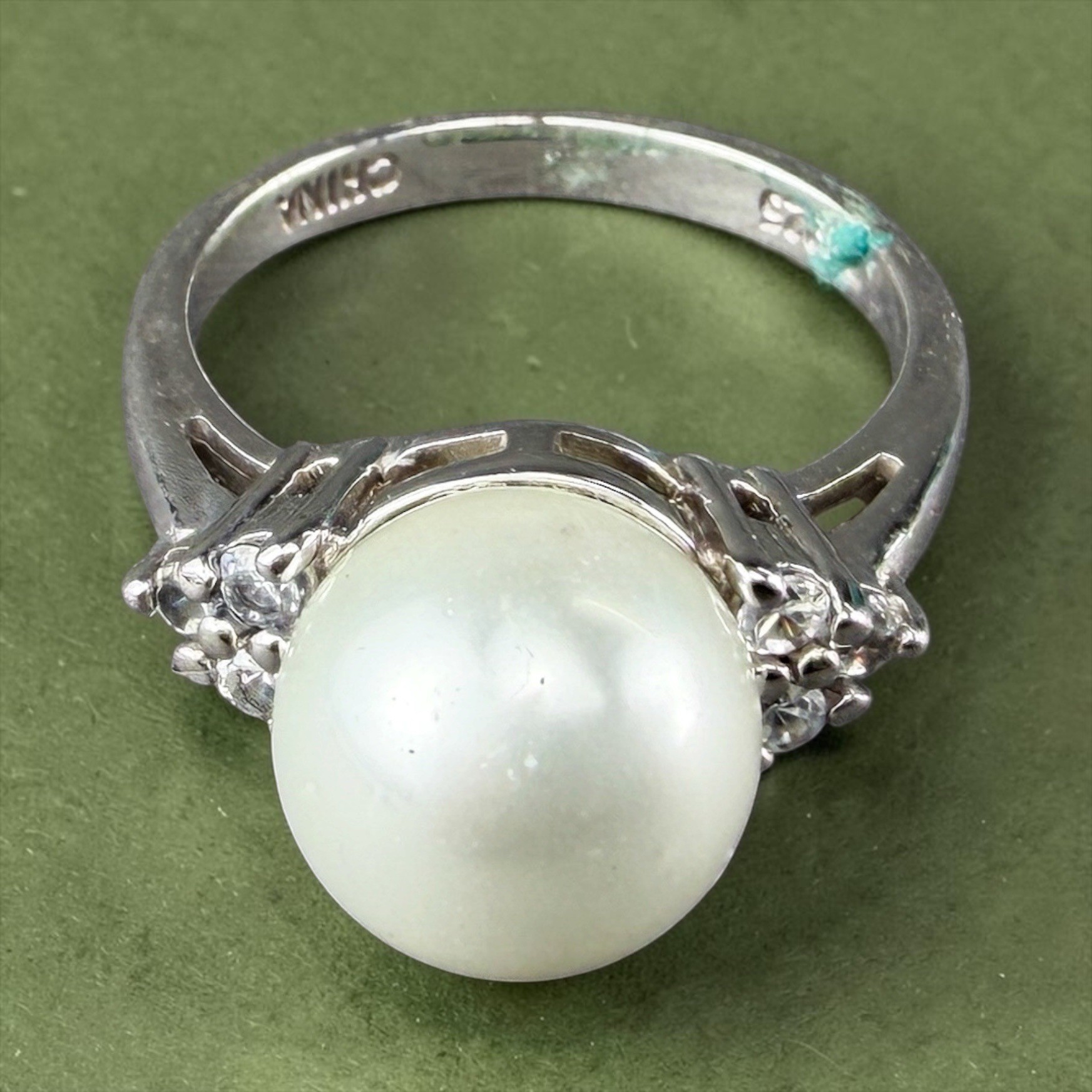 Rings are sterling silver with pearl and turquoise stones flanked or surrounded by rhinestones.