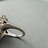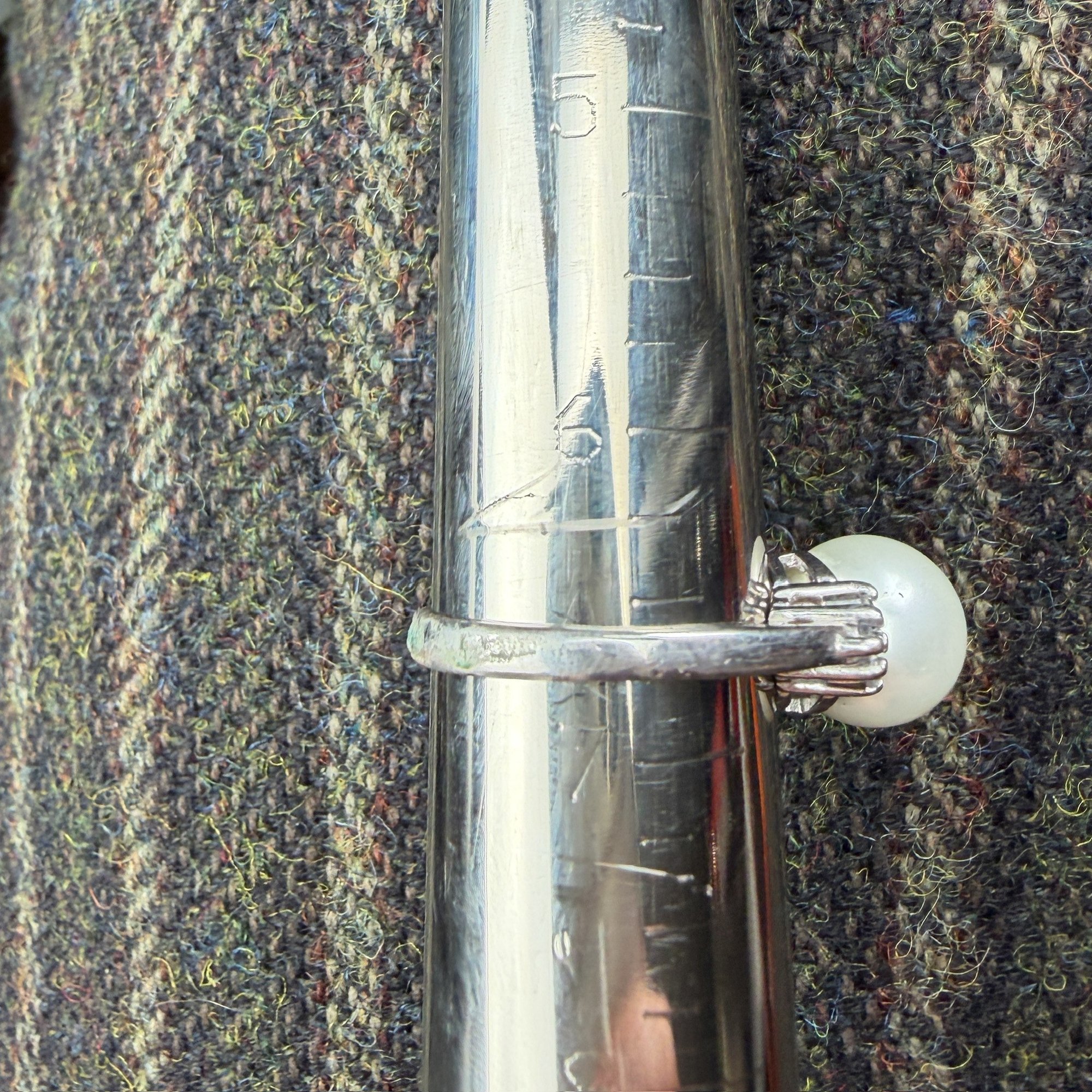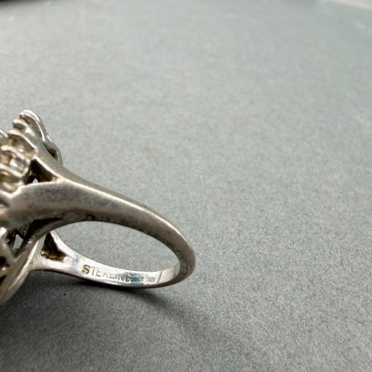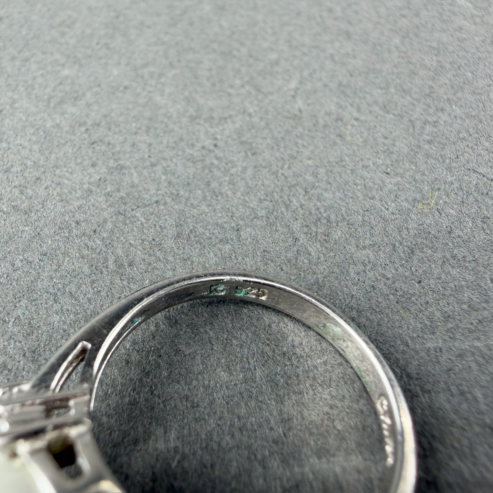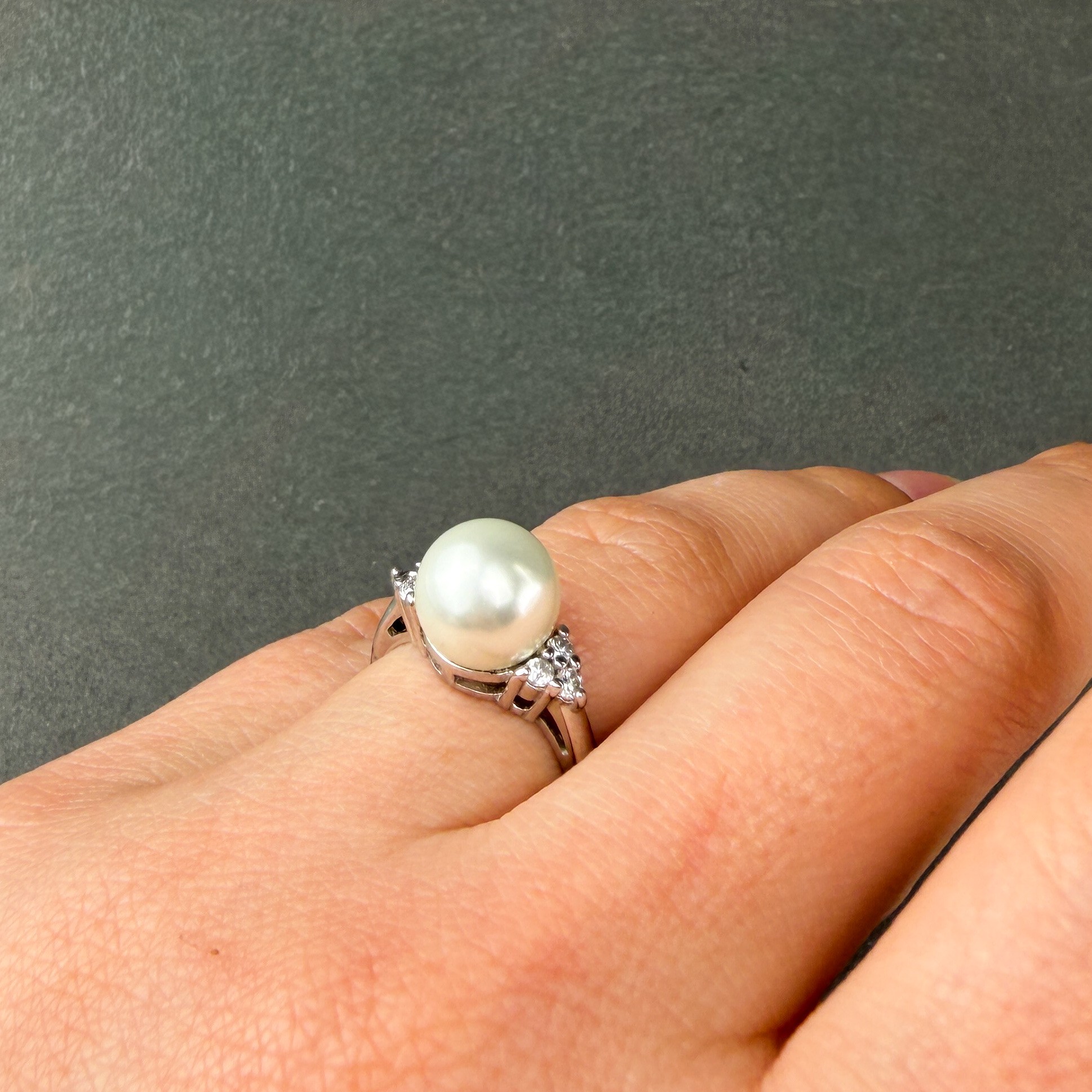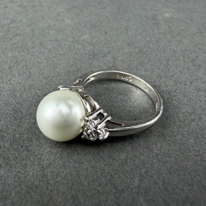 Rings are sterling silver with pearl and turquoise stones flanked or surrounded by rhinestones.