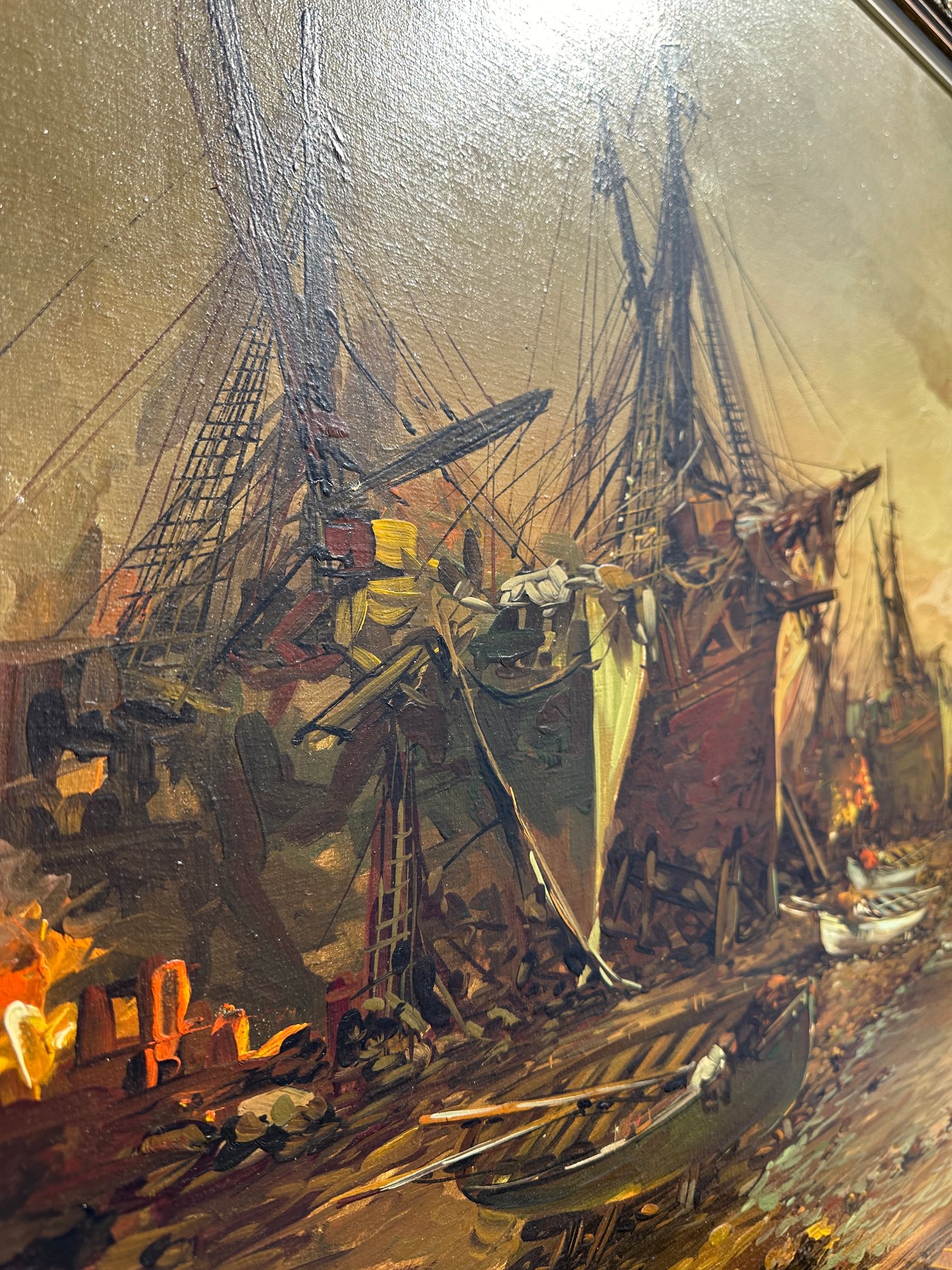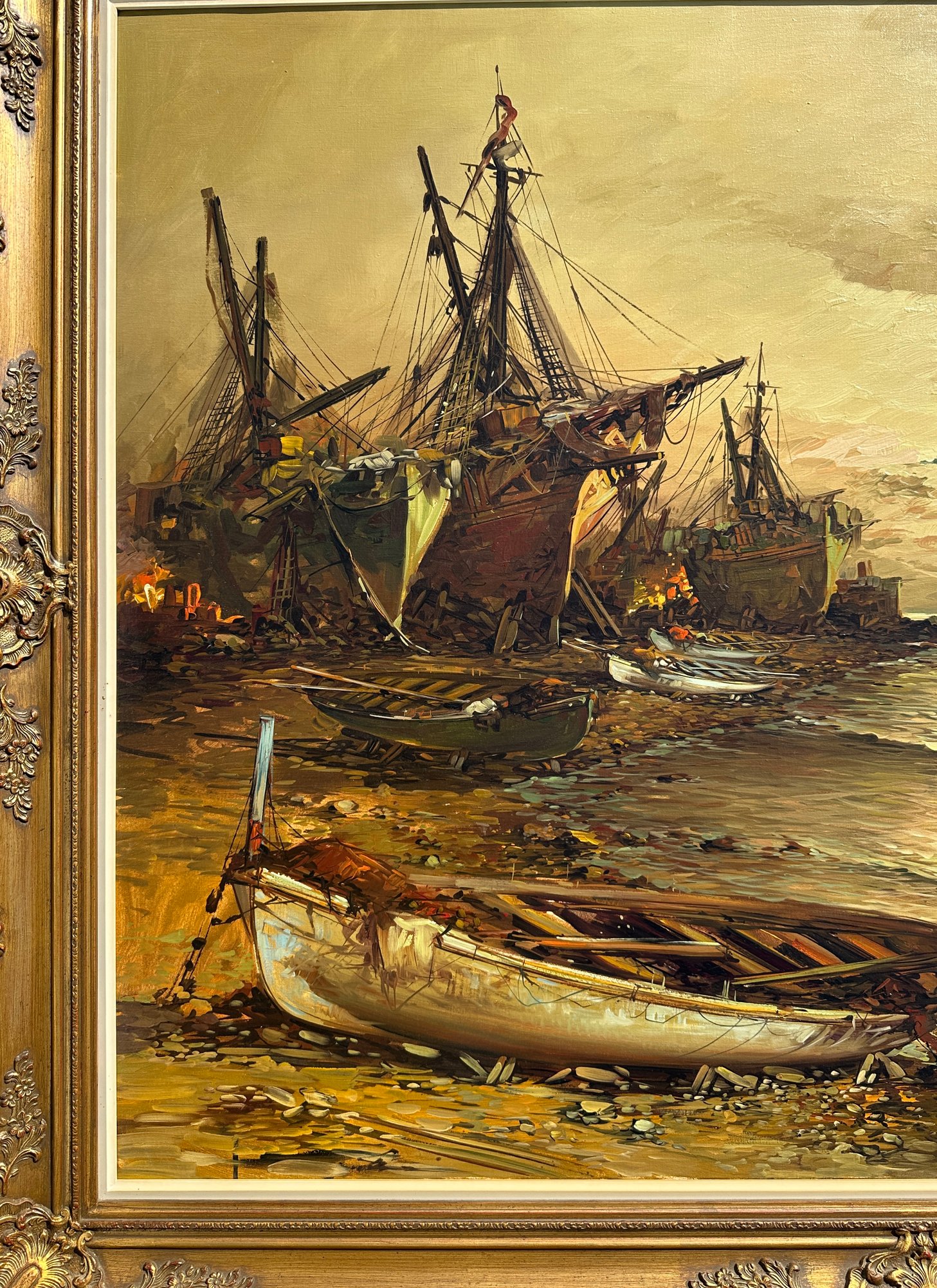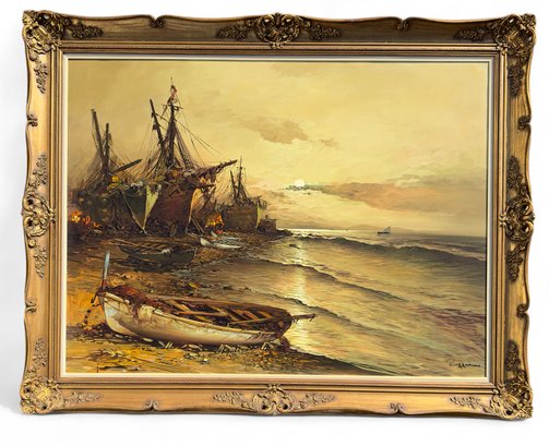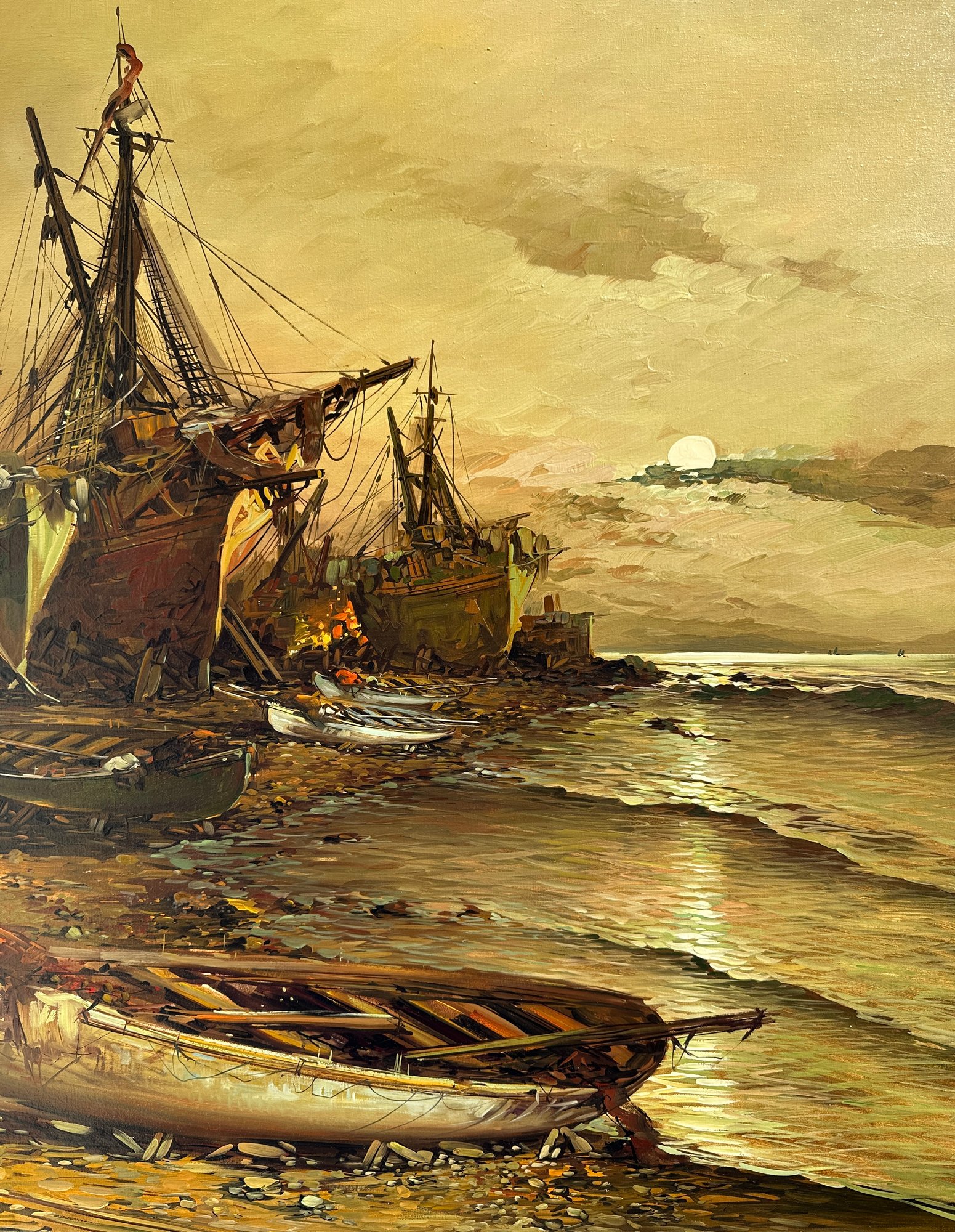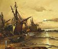 Original Painting, Oil on Canvas of ships washed ashore with large clipper ships in the background.
