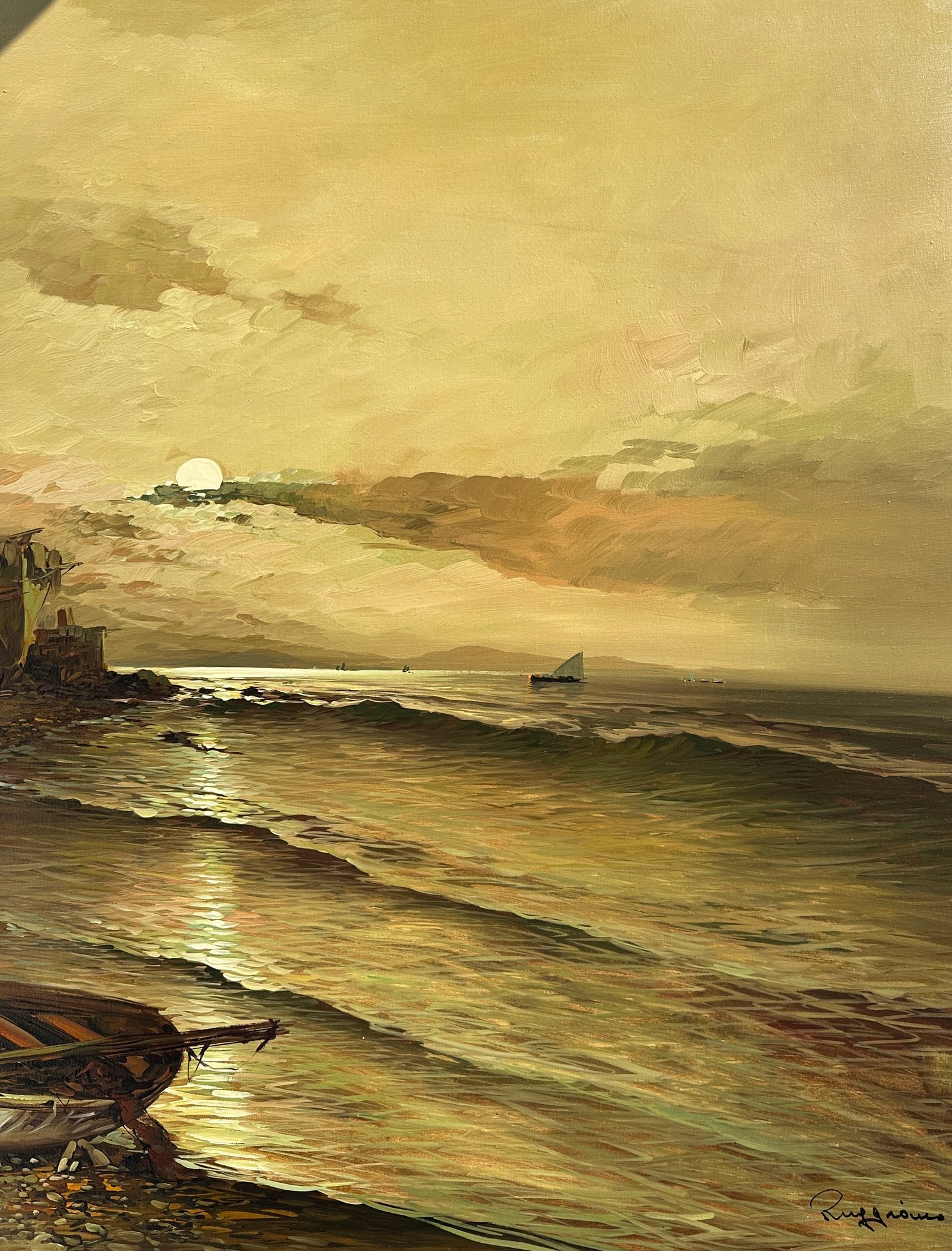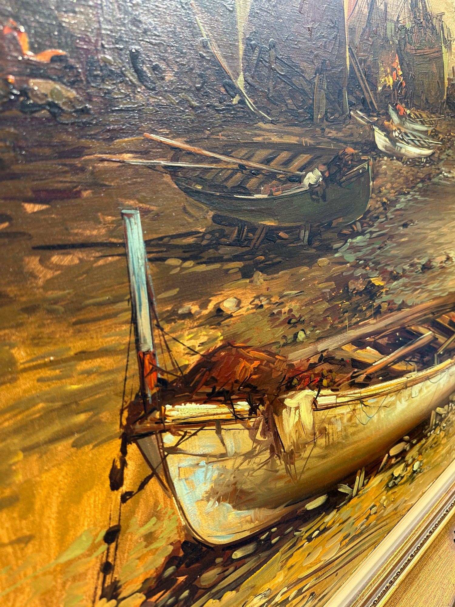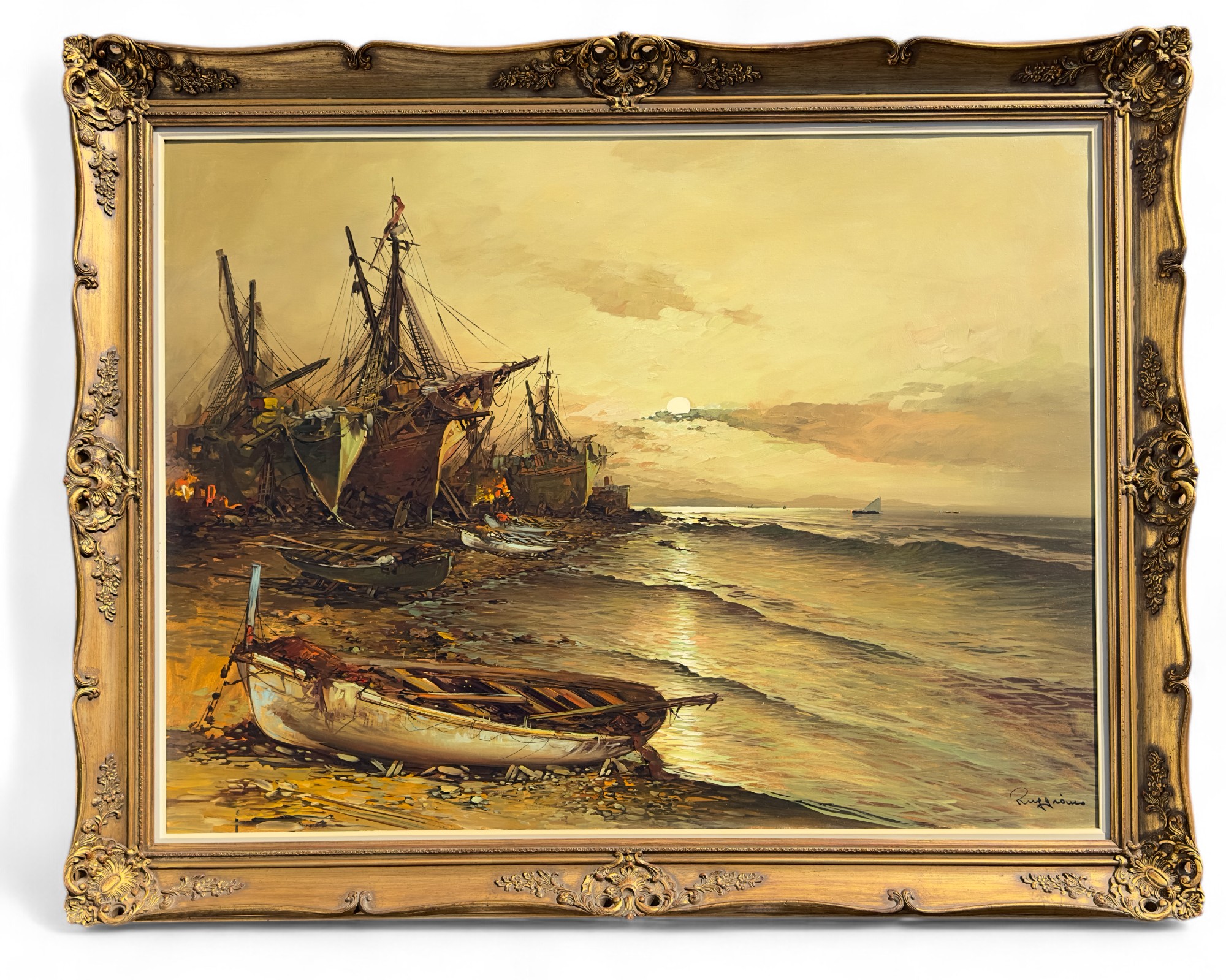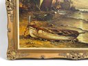 Original Painting, Oil on Canvas of ships washed ashore with large clipper ships in the background.