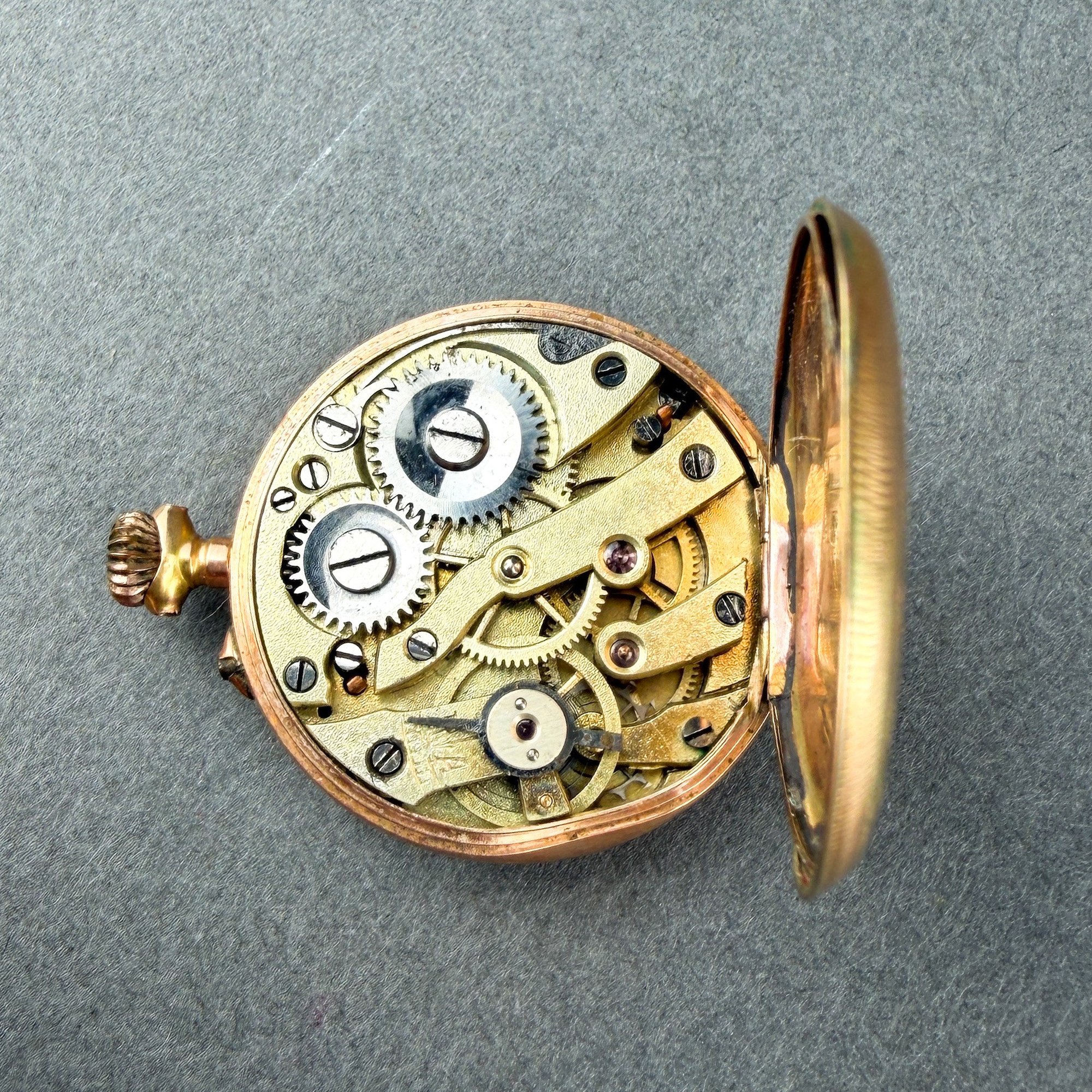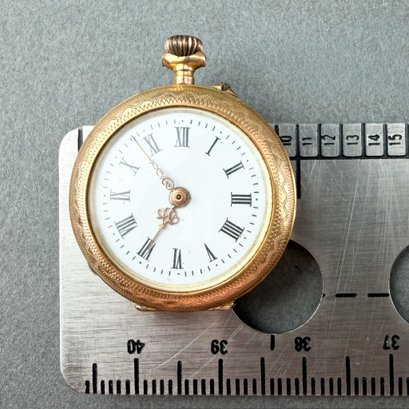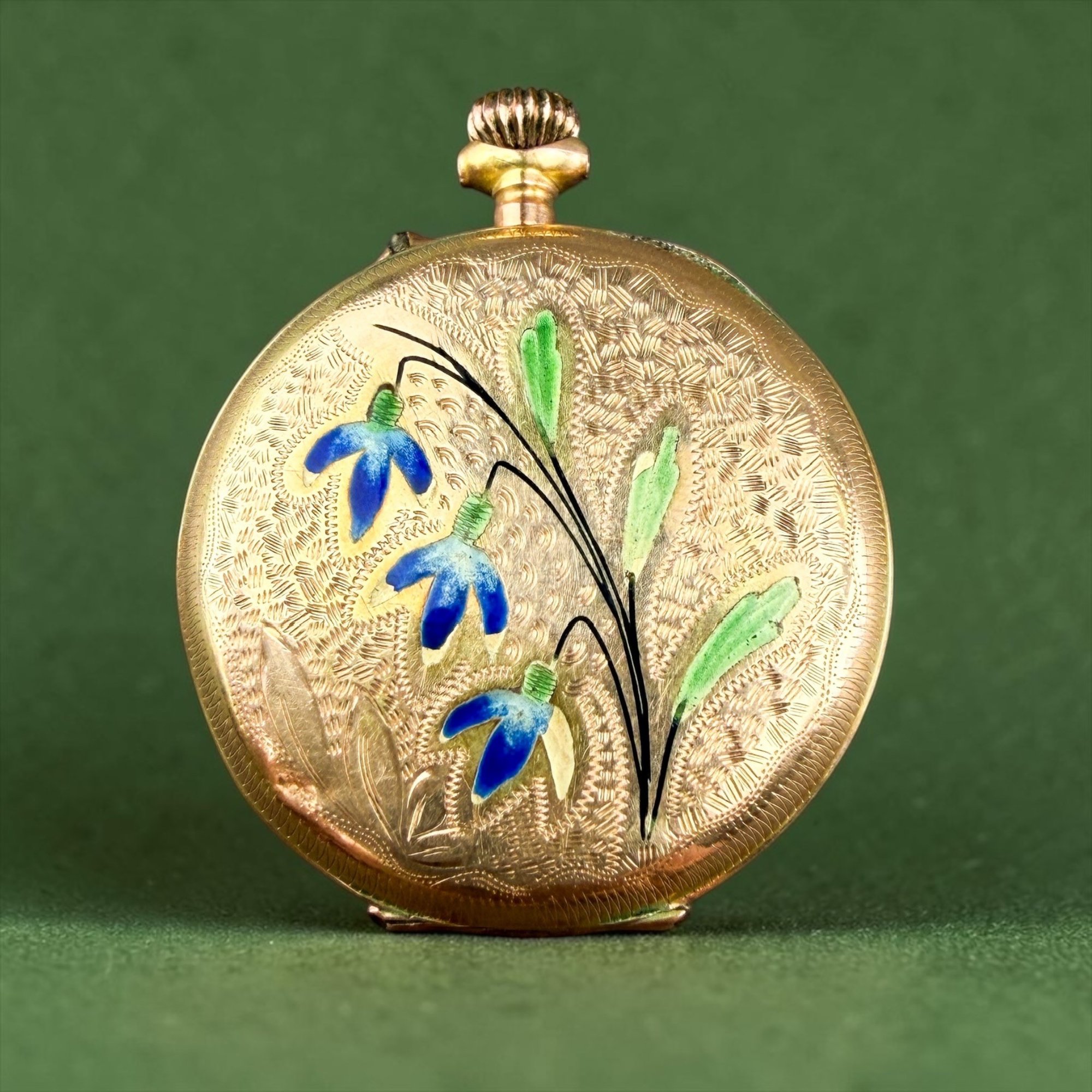 Phenomenal lily of the valley type floral motif painted in blue and green enamel on a petite lady's pocket watch. Most likely British in origin.