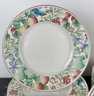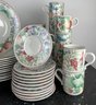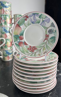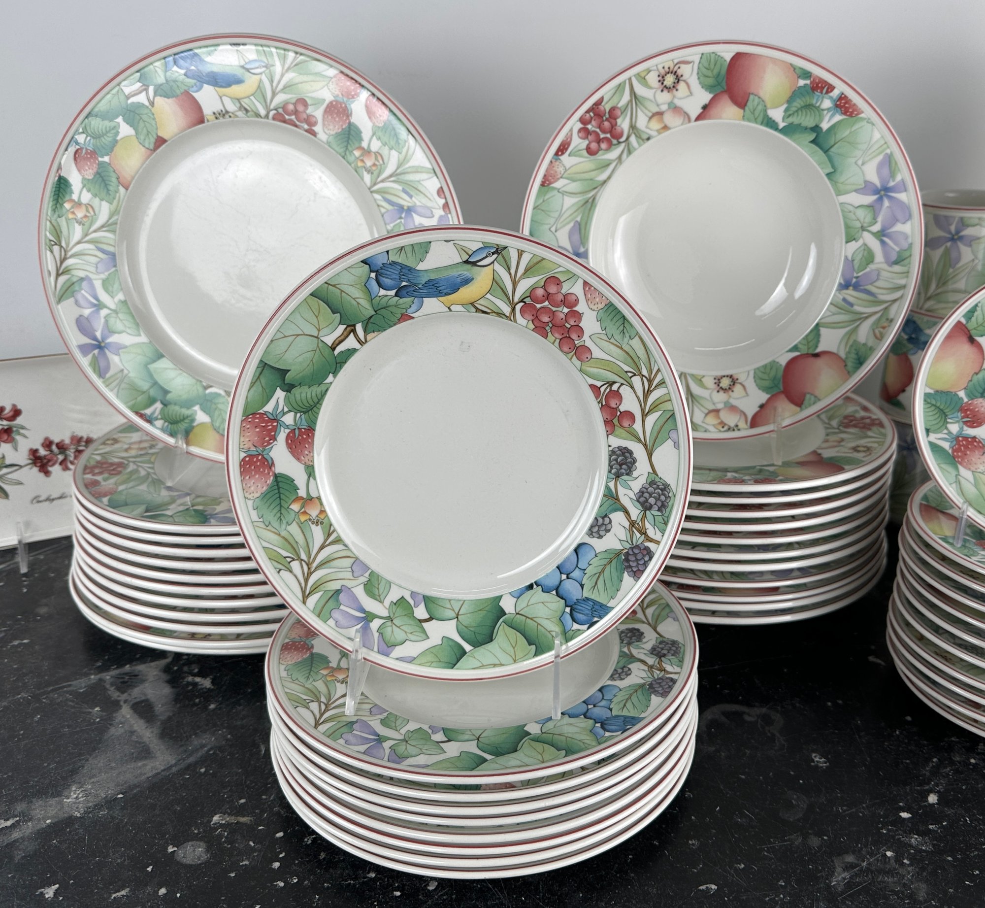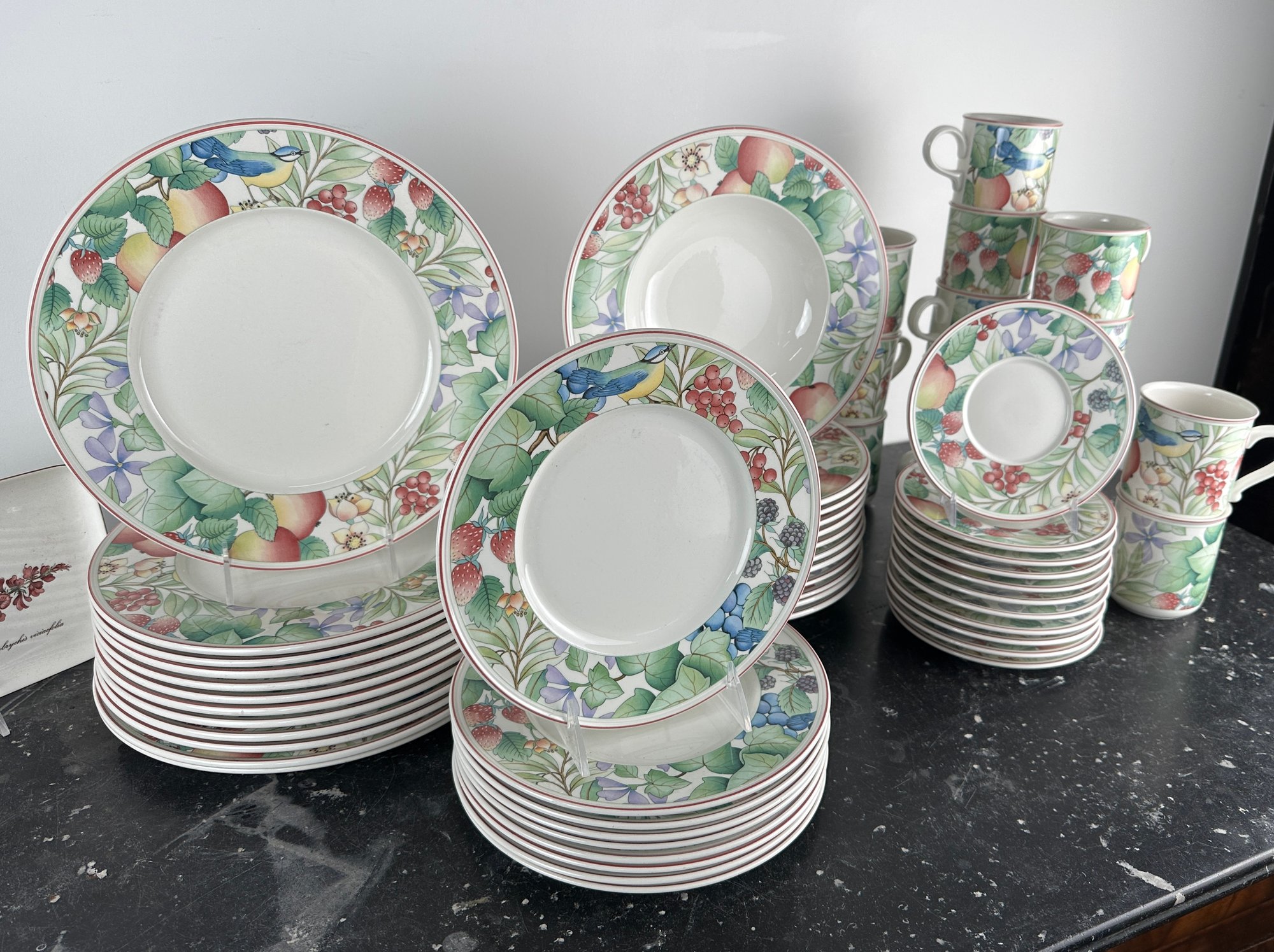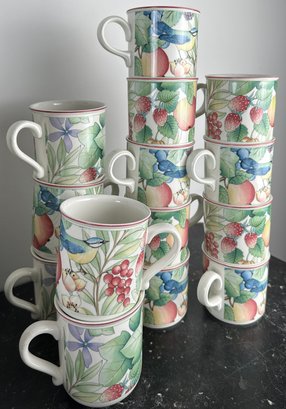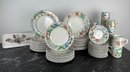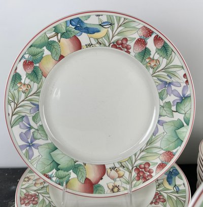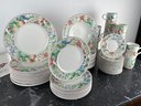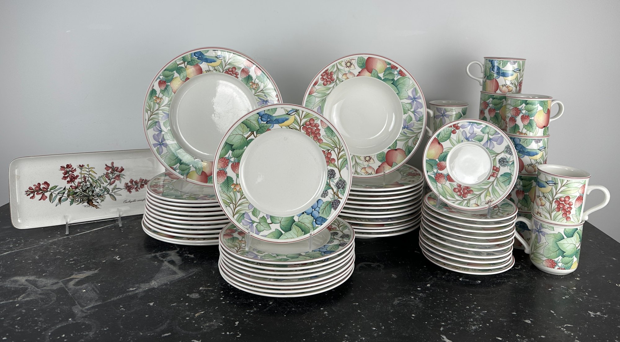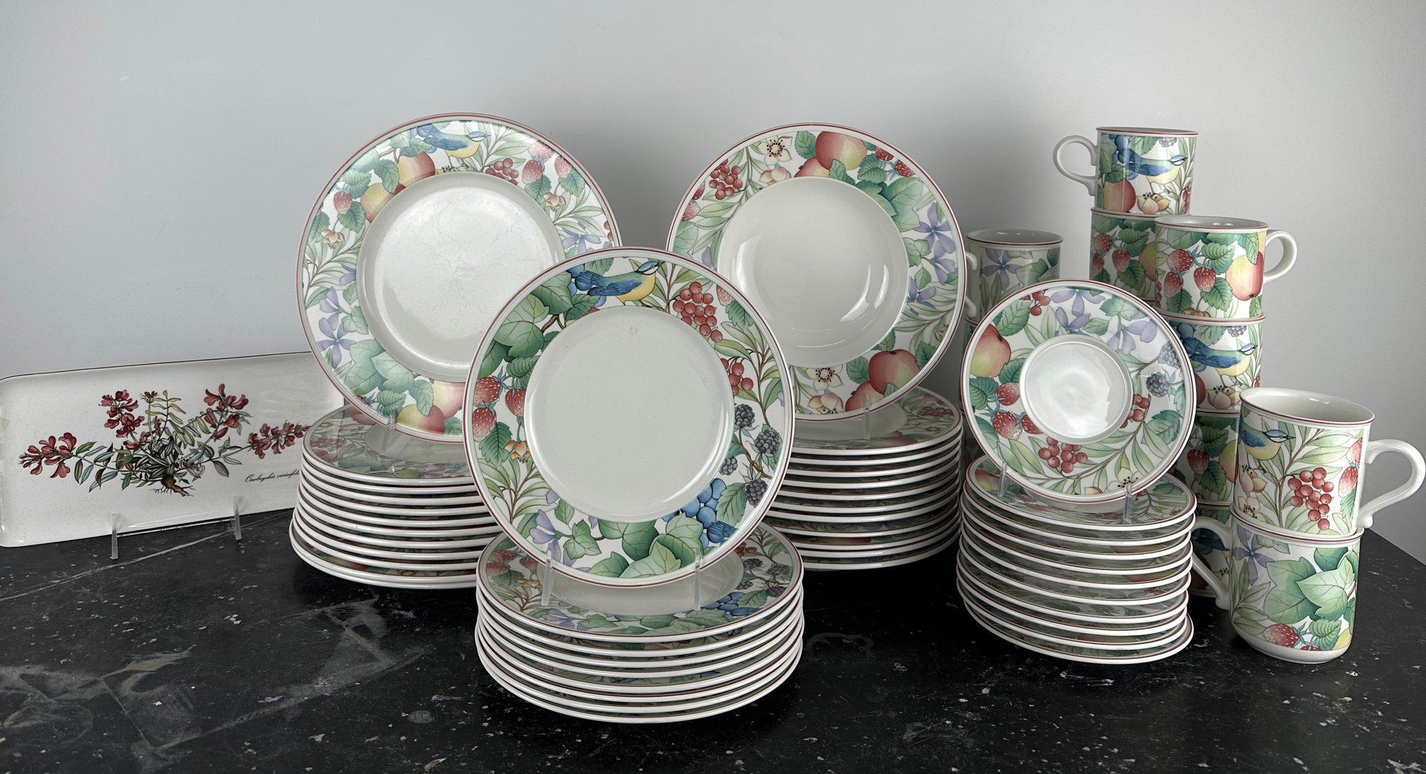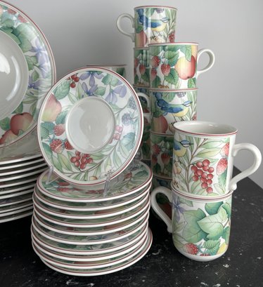 Mugs, bowls salad plates, saucers twodifferent types of mubs and a servin dish separate from the collection