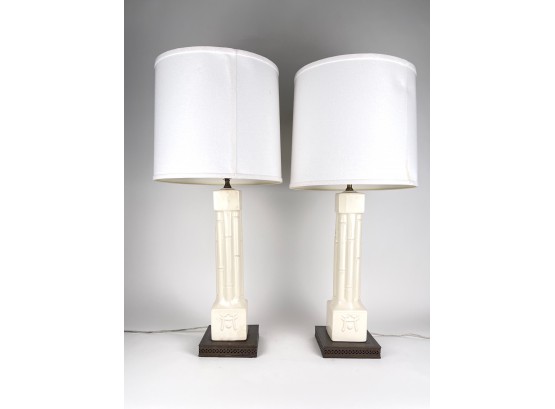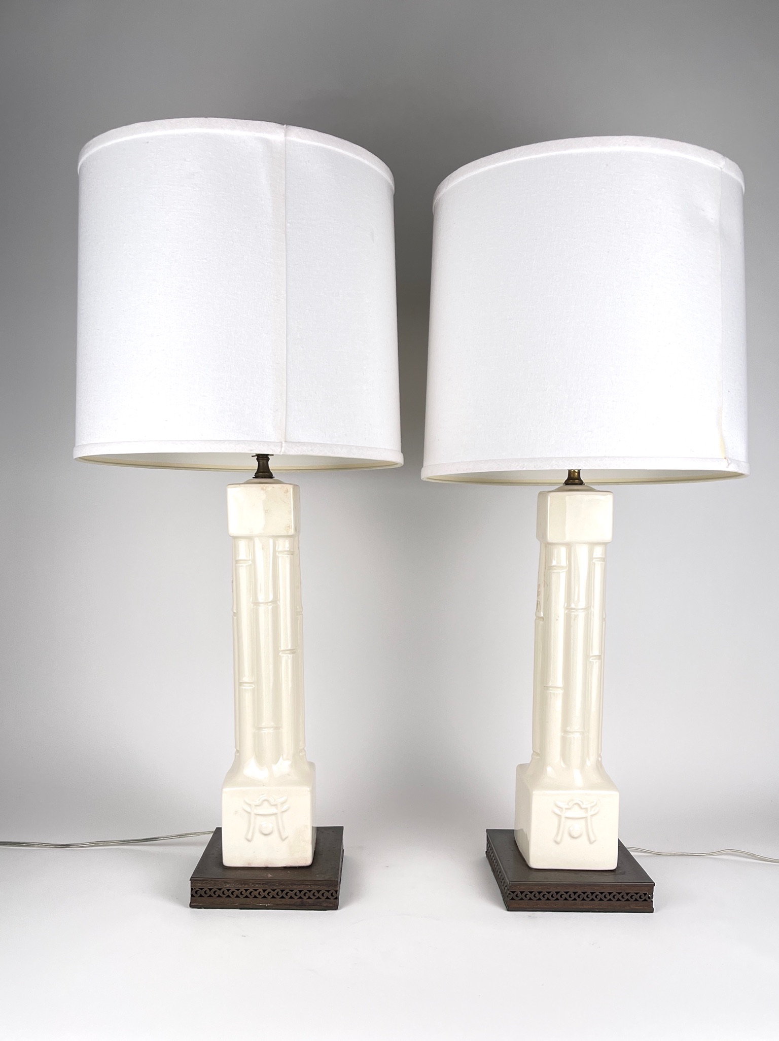 Chinese of Asian, Pair of tall table lamps on bronze reticulated base with green felt bottoms and white shades.