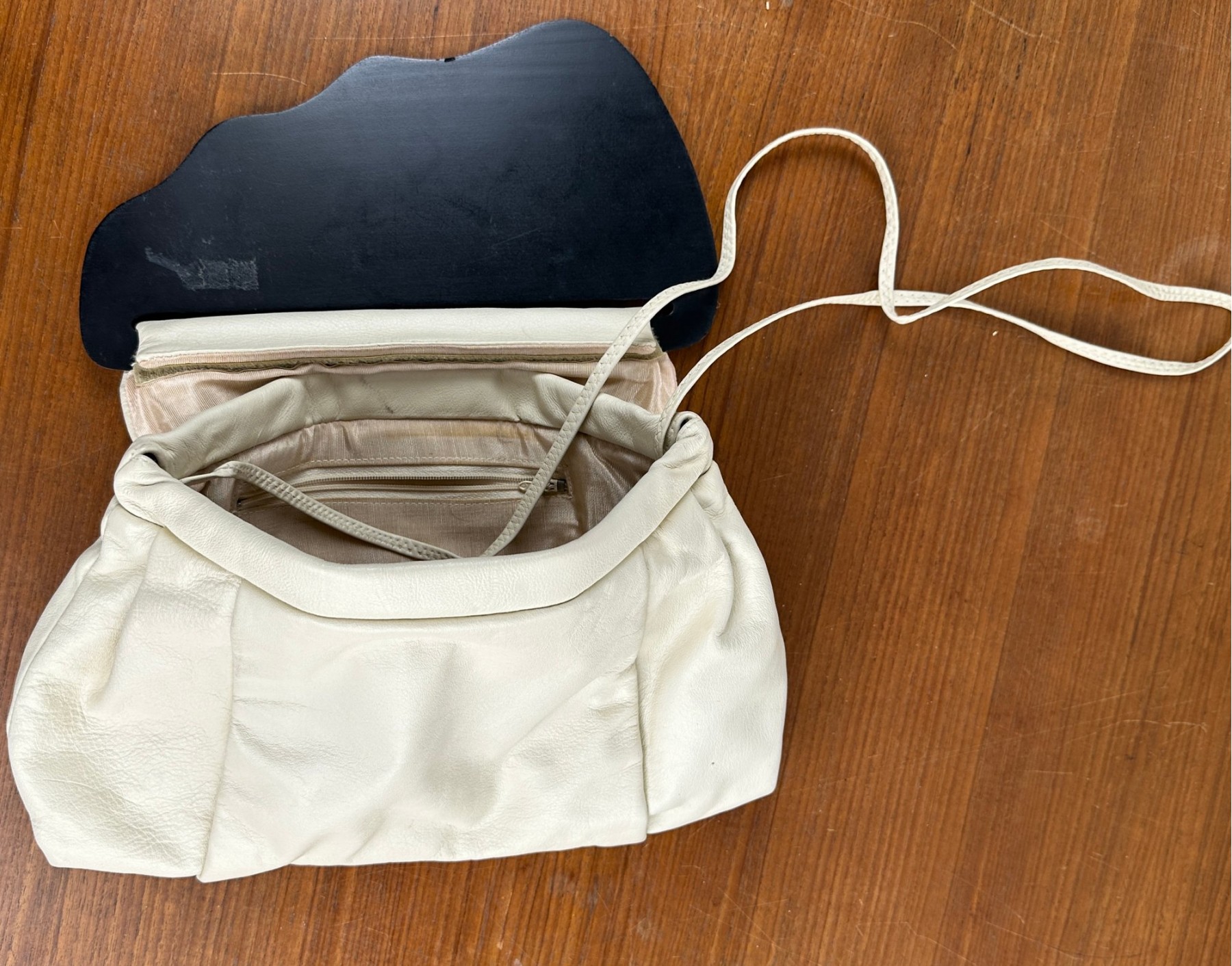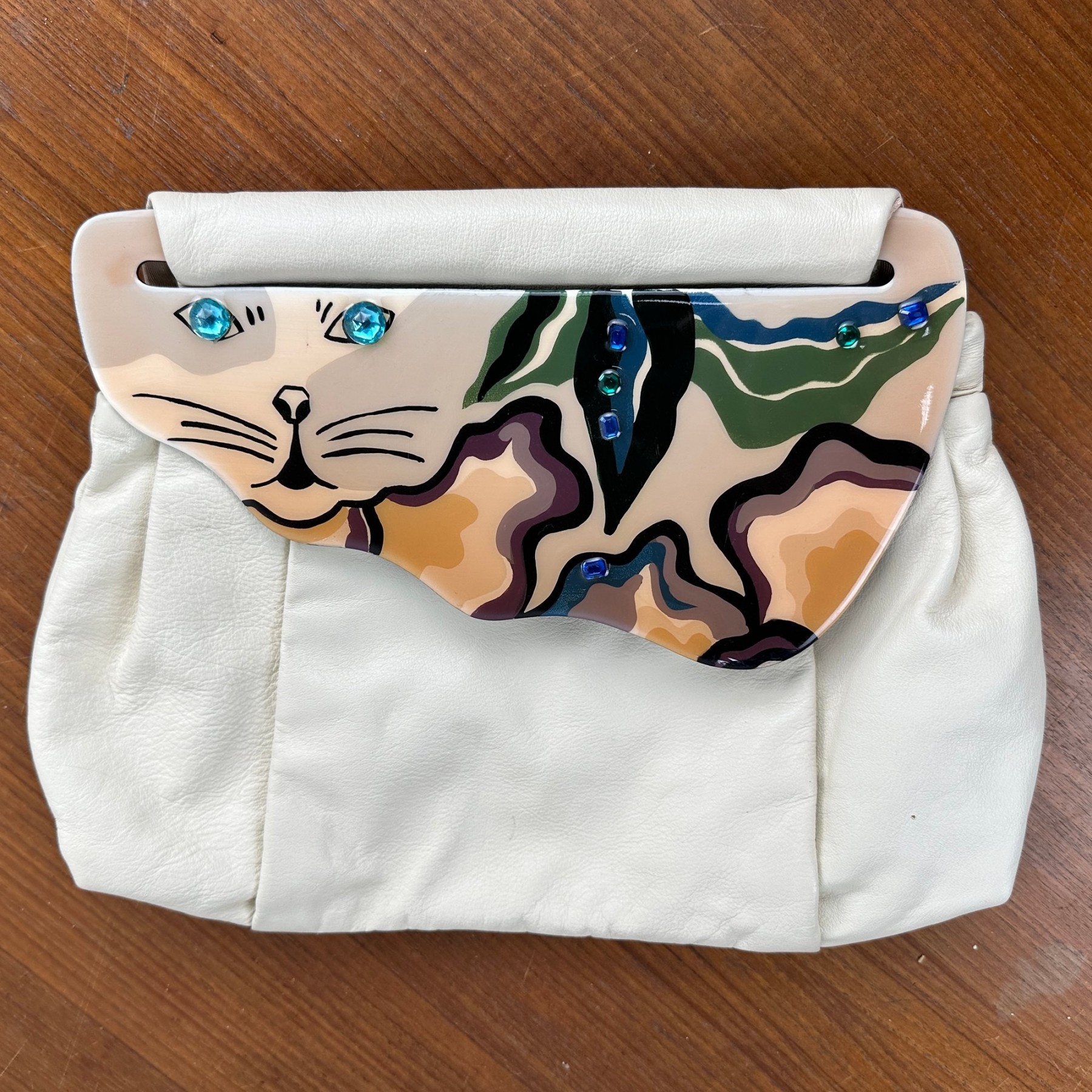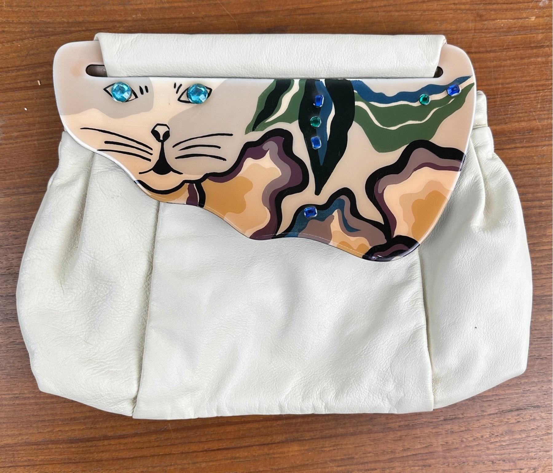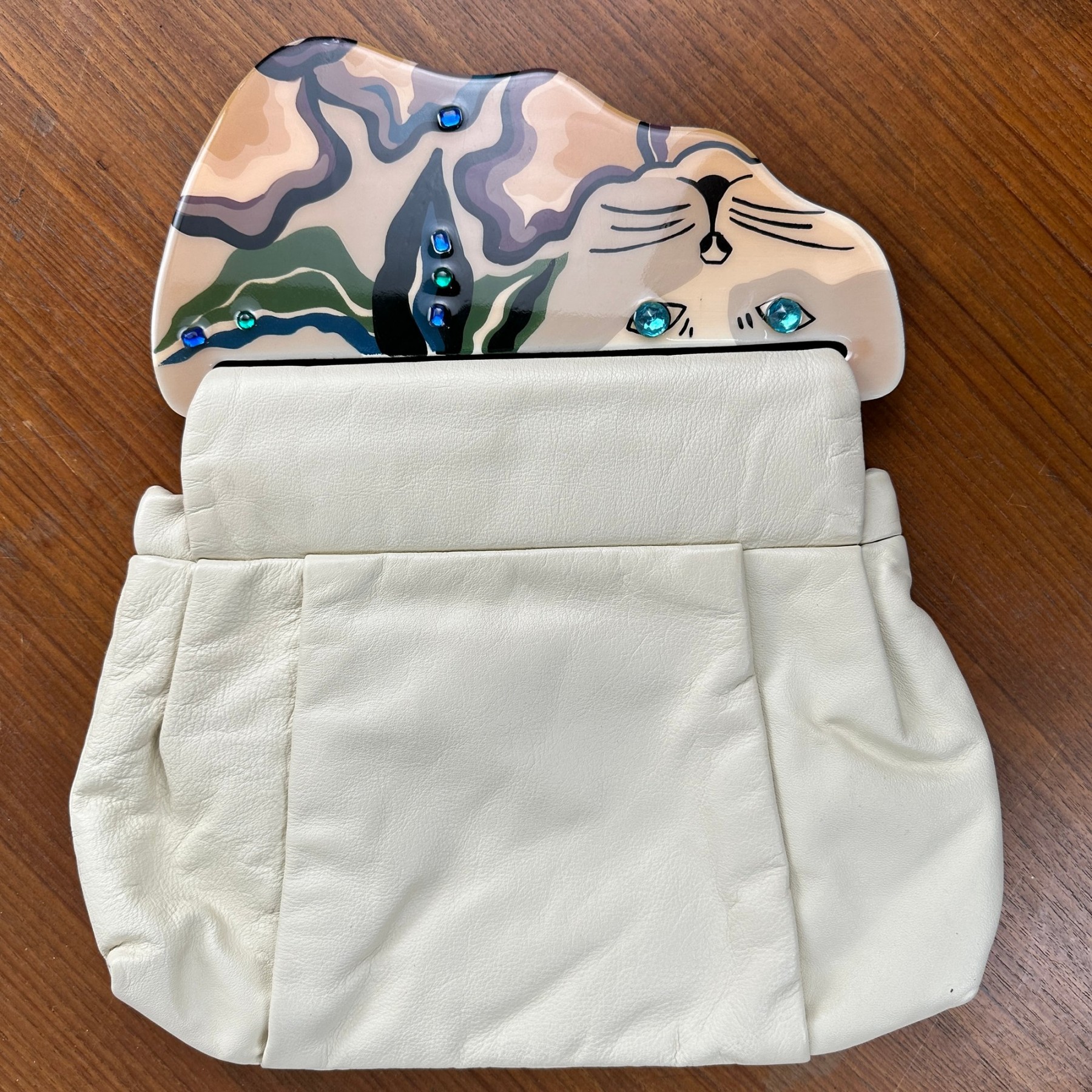 cross body strap inside. off white leather and resin or acrylic top with rhinestone eyes