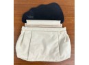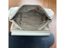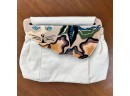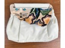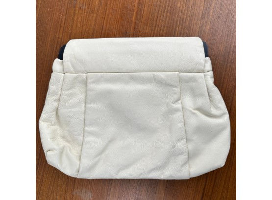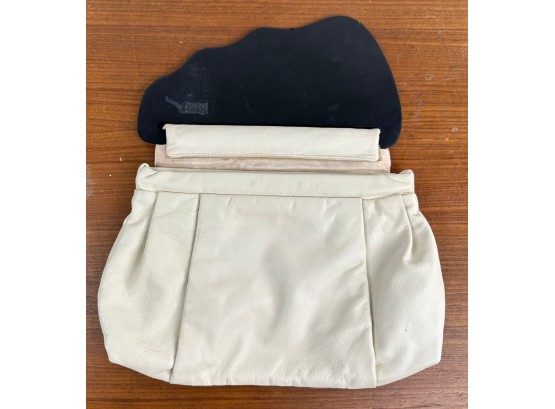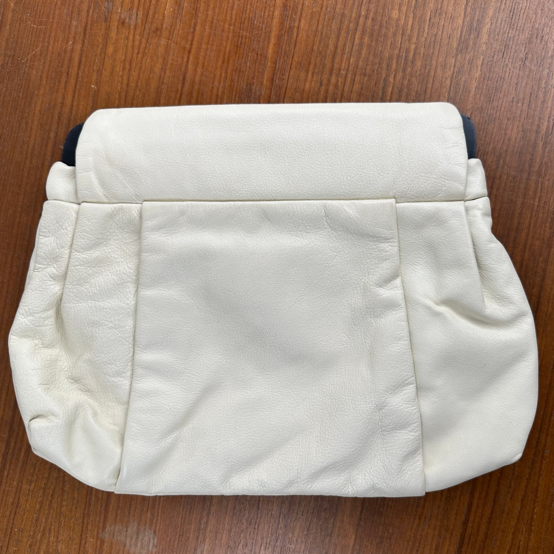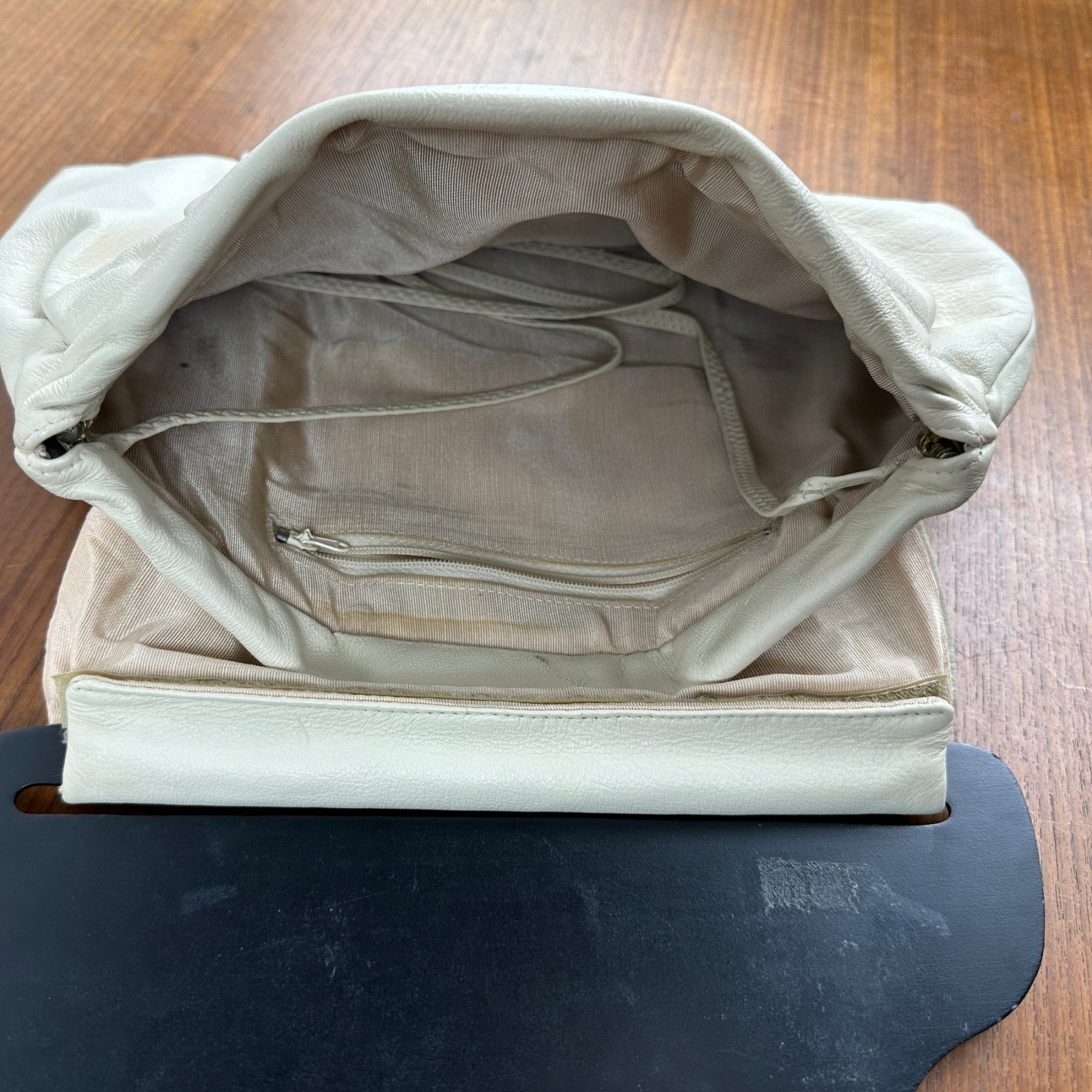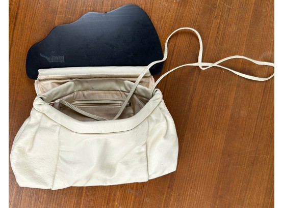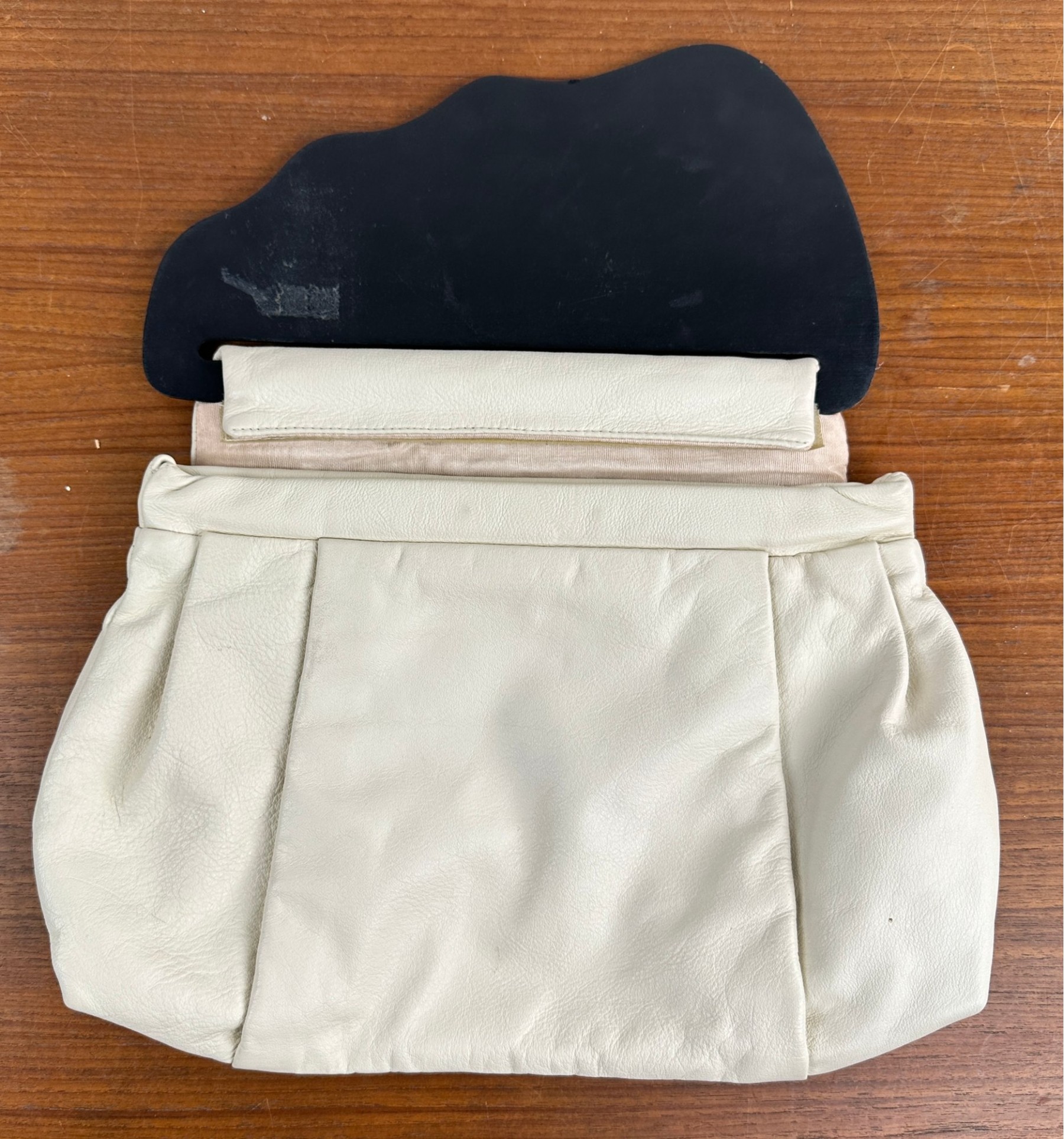 cross body strap inside. off white leather and resin or acrylic top with rhinestone eyes