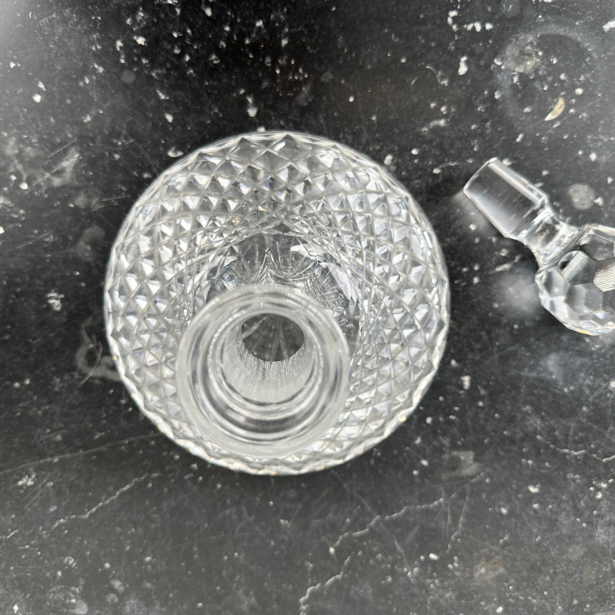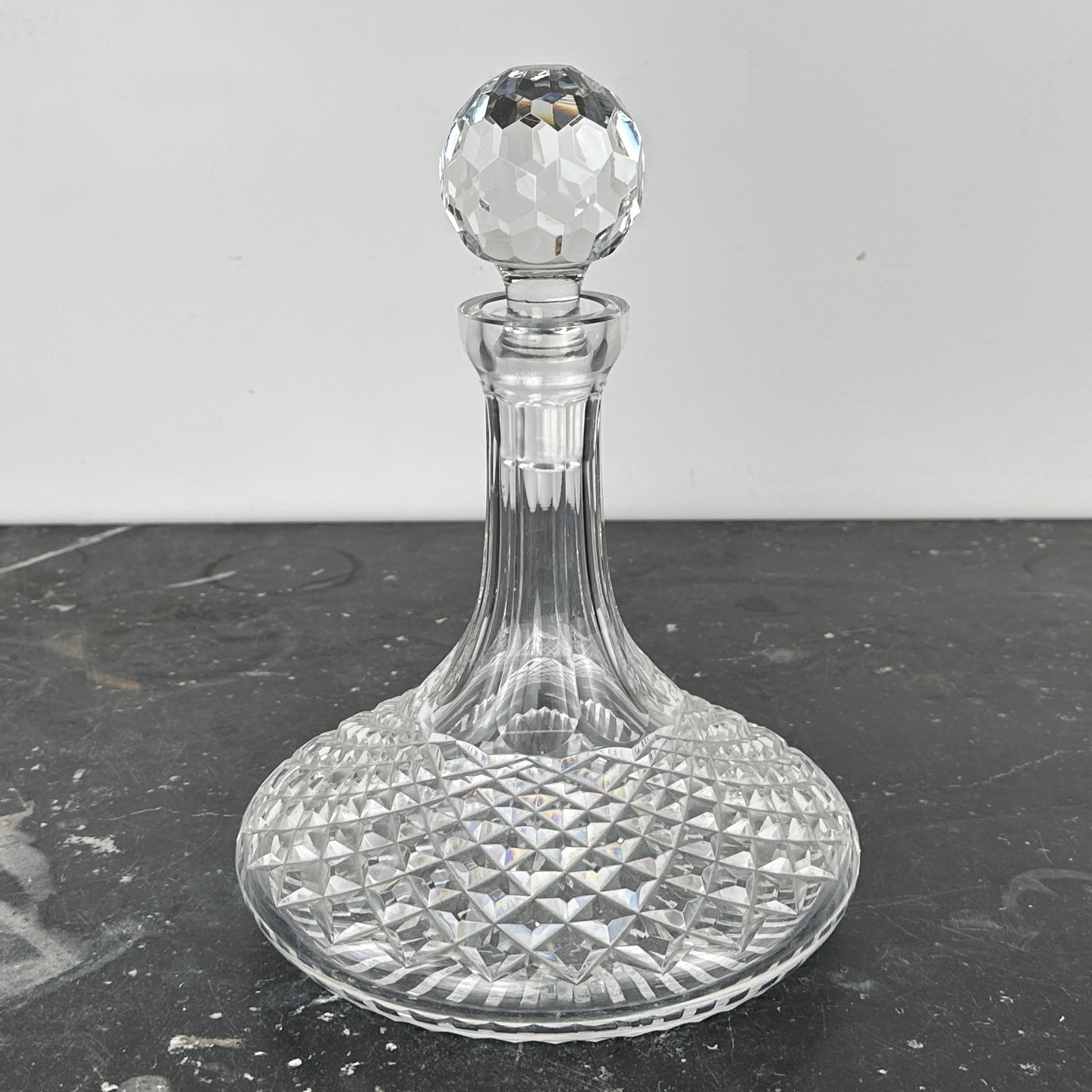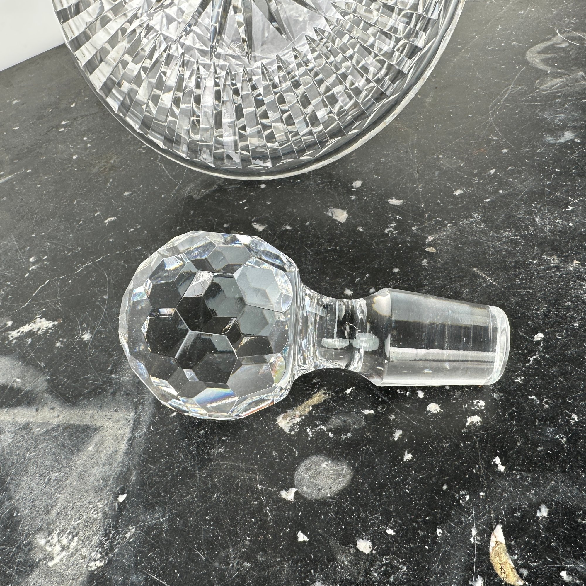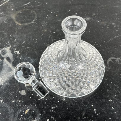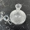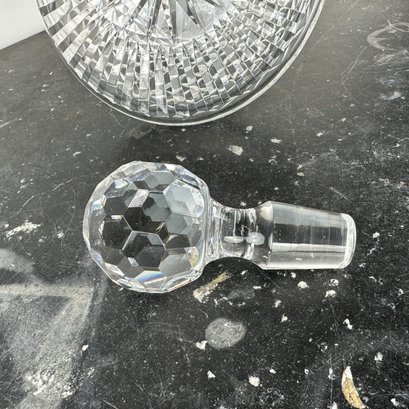 Heavy cut crystal decanter measures 7 1/8" H x 7 1/4" Diameter; 9 3/4" H with stopper.