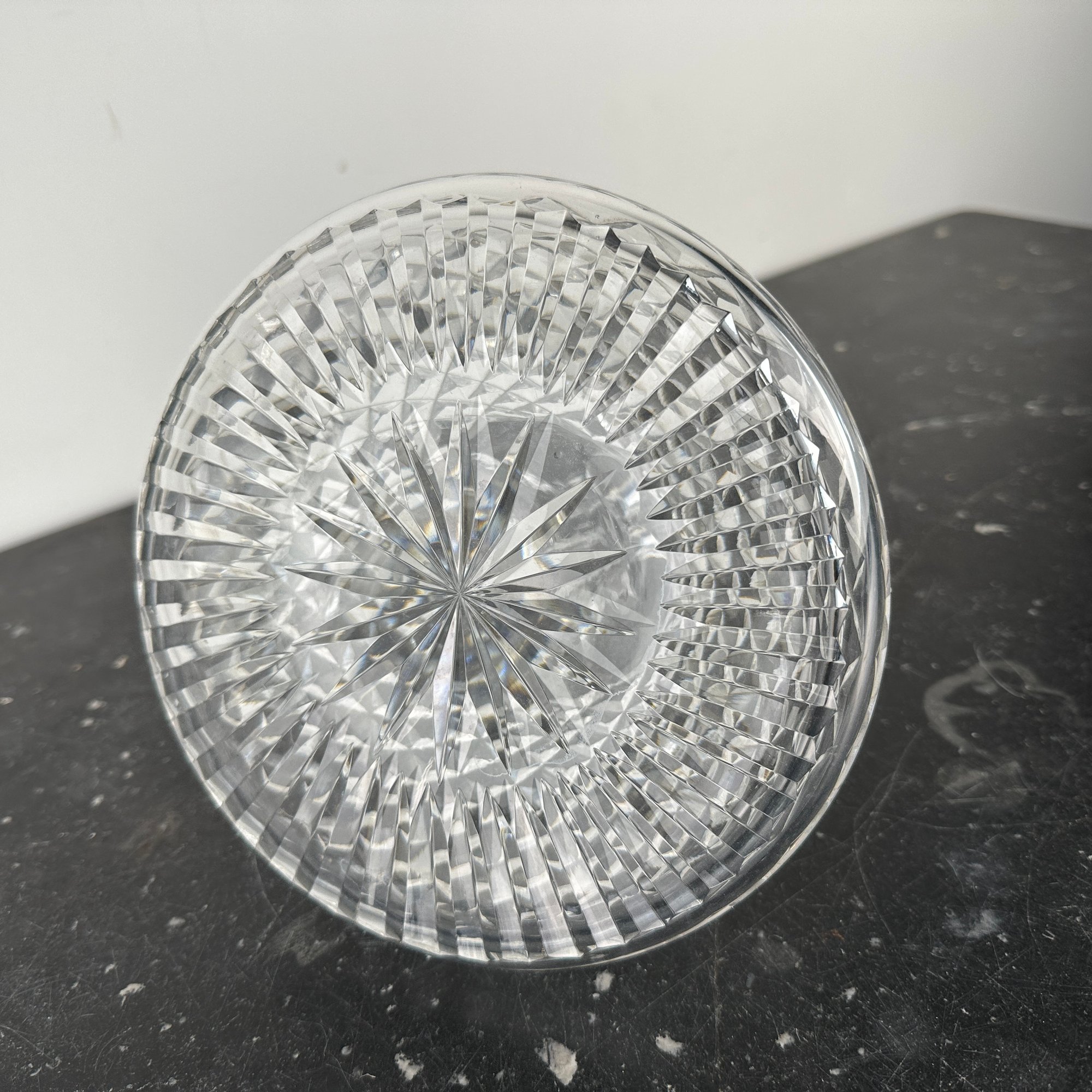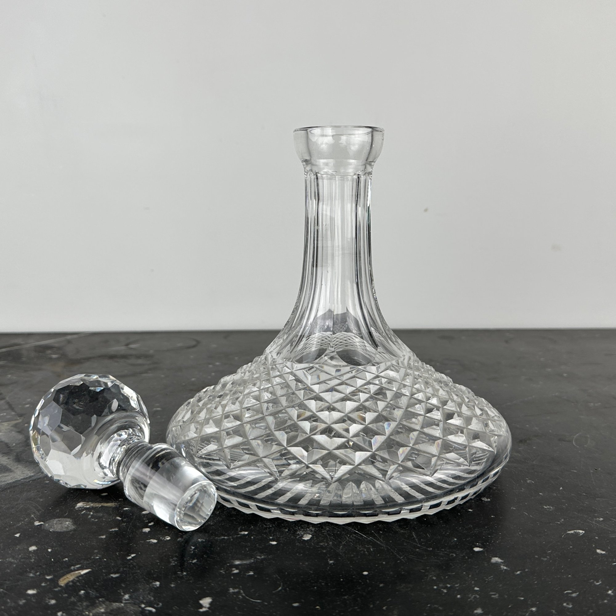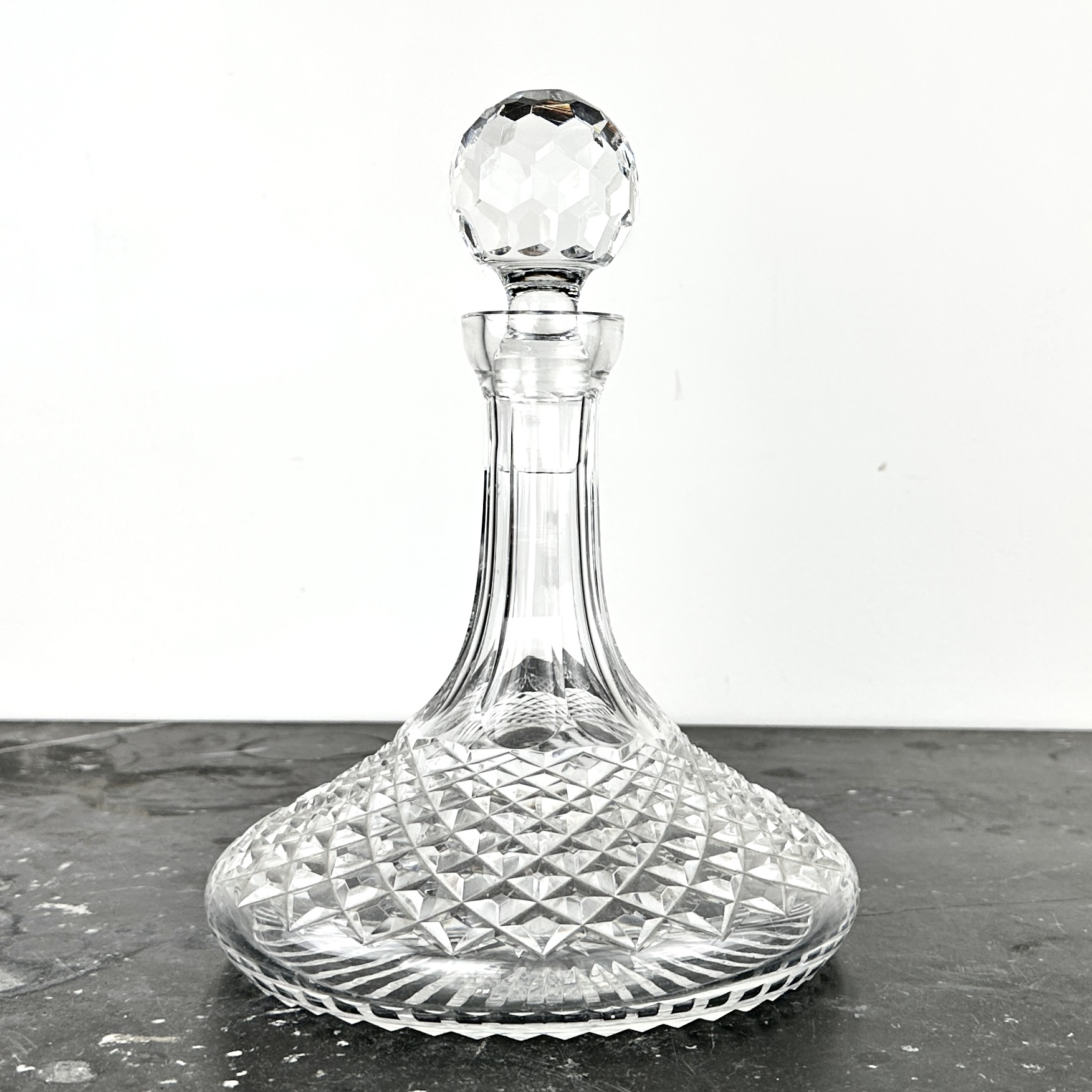 Heavy cut crystal decanter measures 7 1/8" H x 7 1/4" Diameter; 9 3/4" H with stopper.