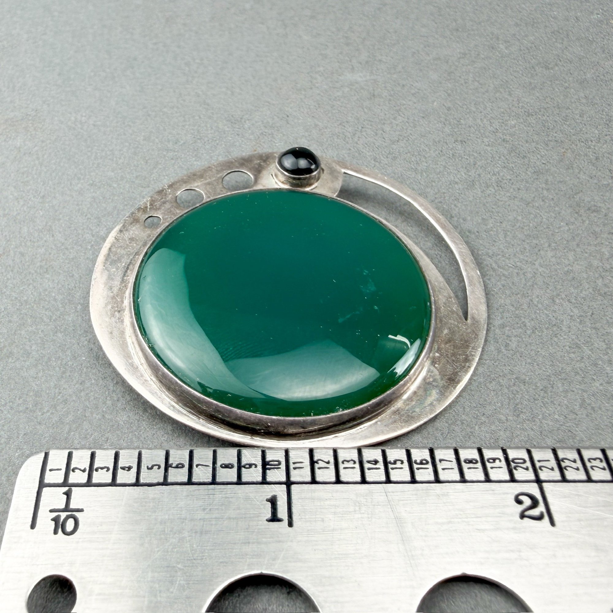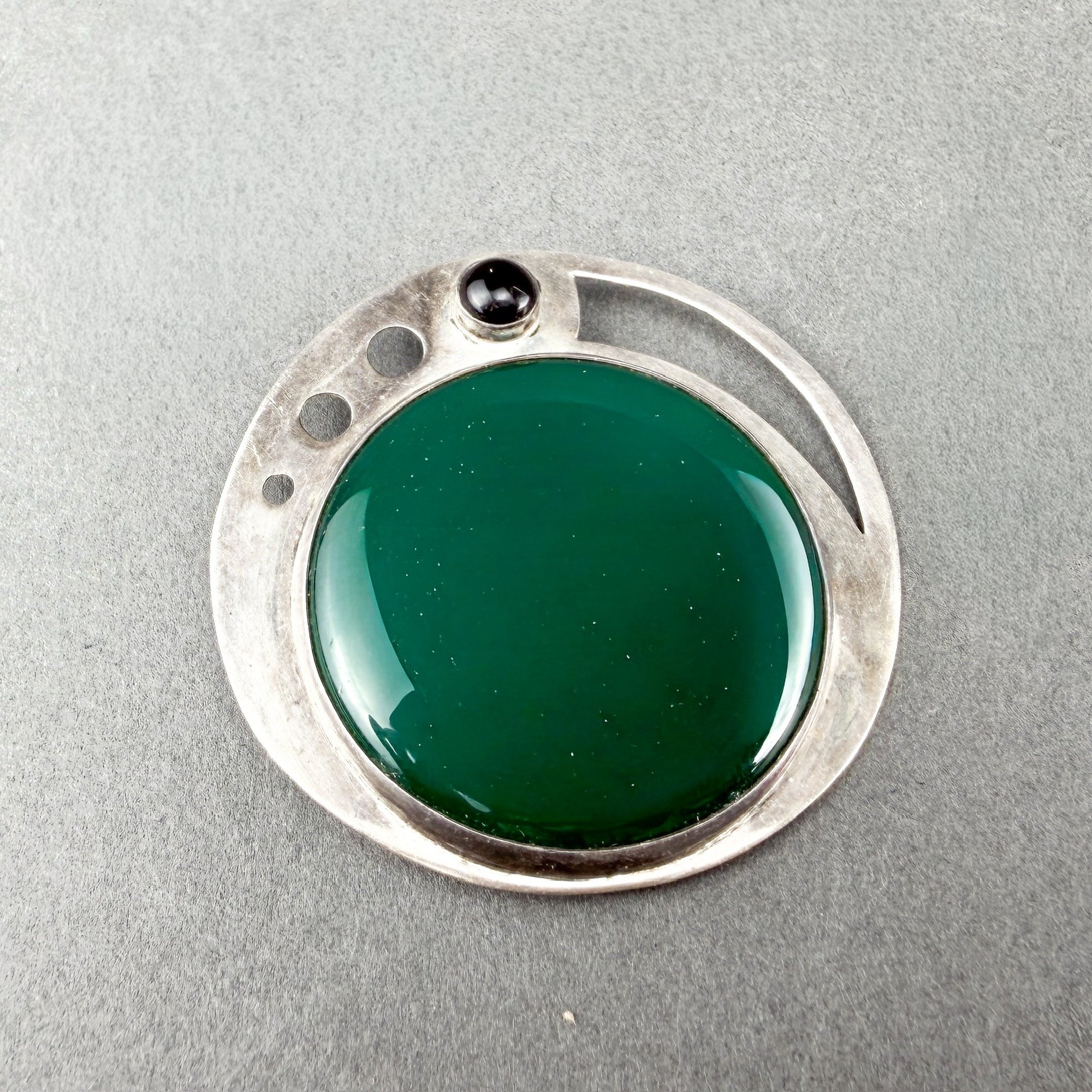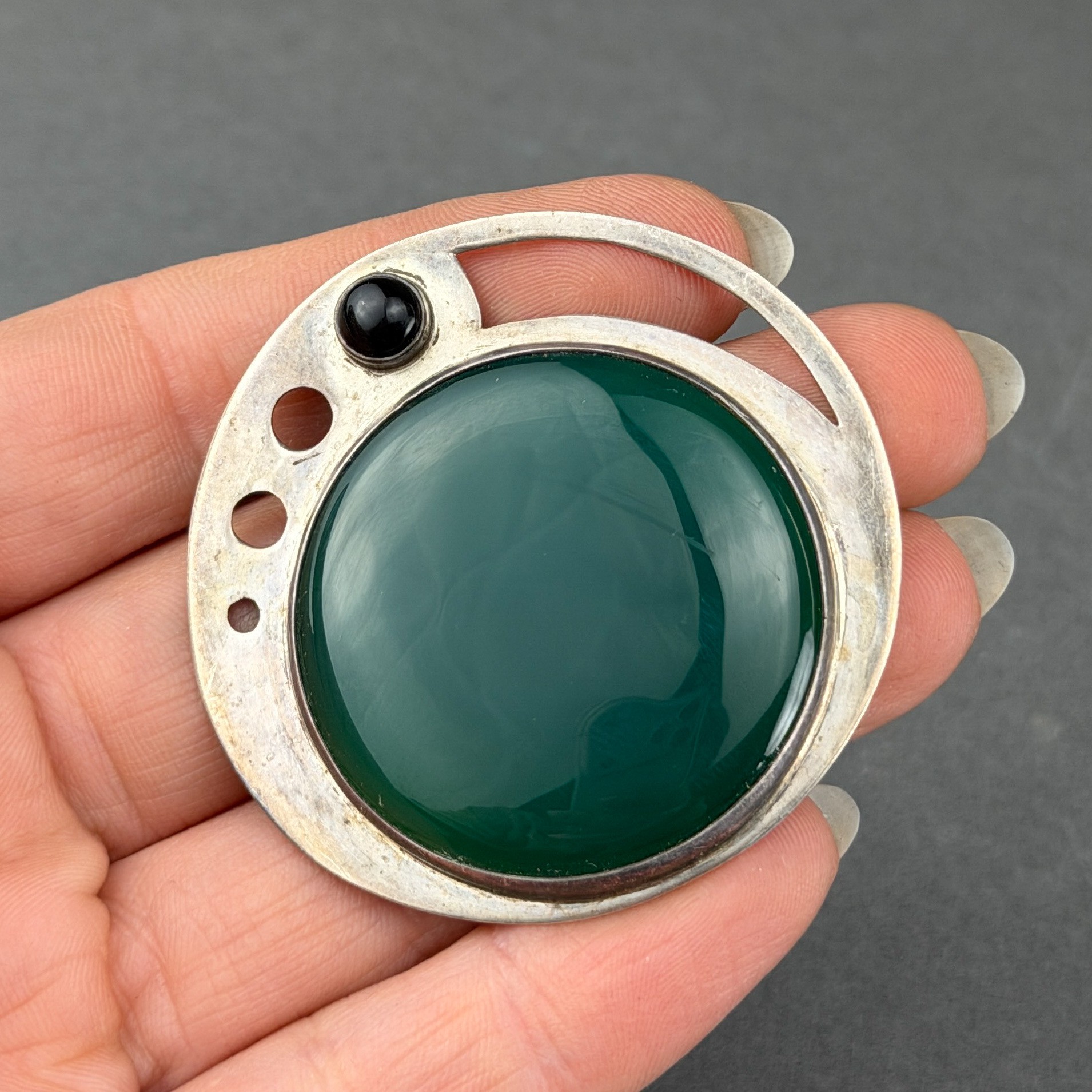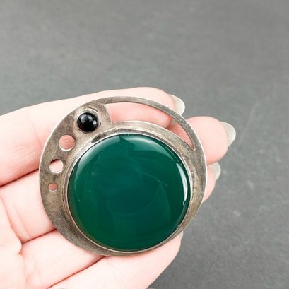 Viennese succession style sterling silver and green agate brooch or pin.