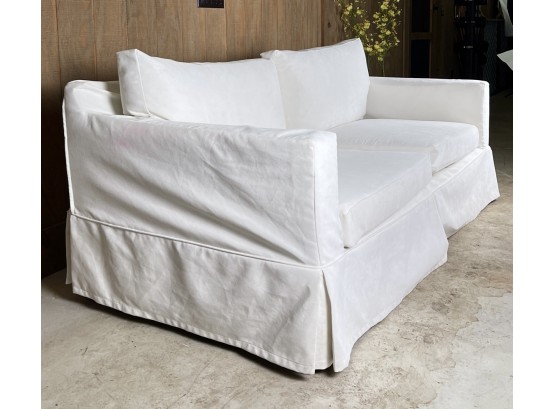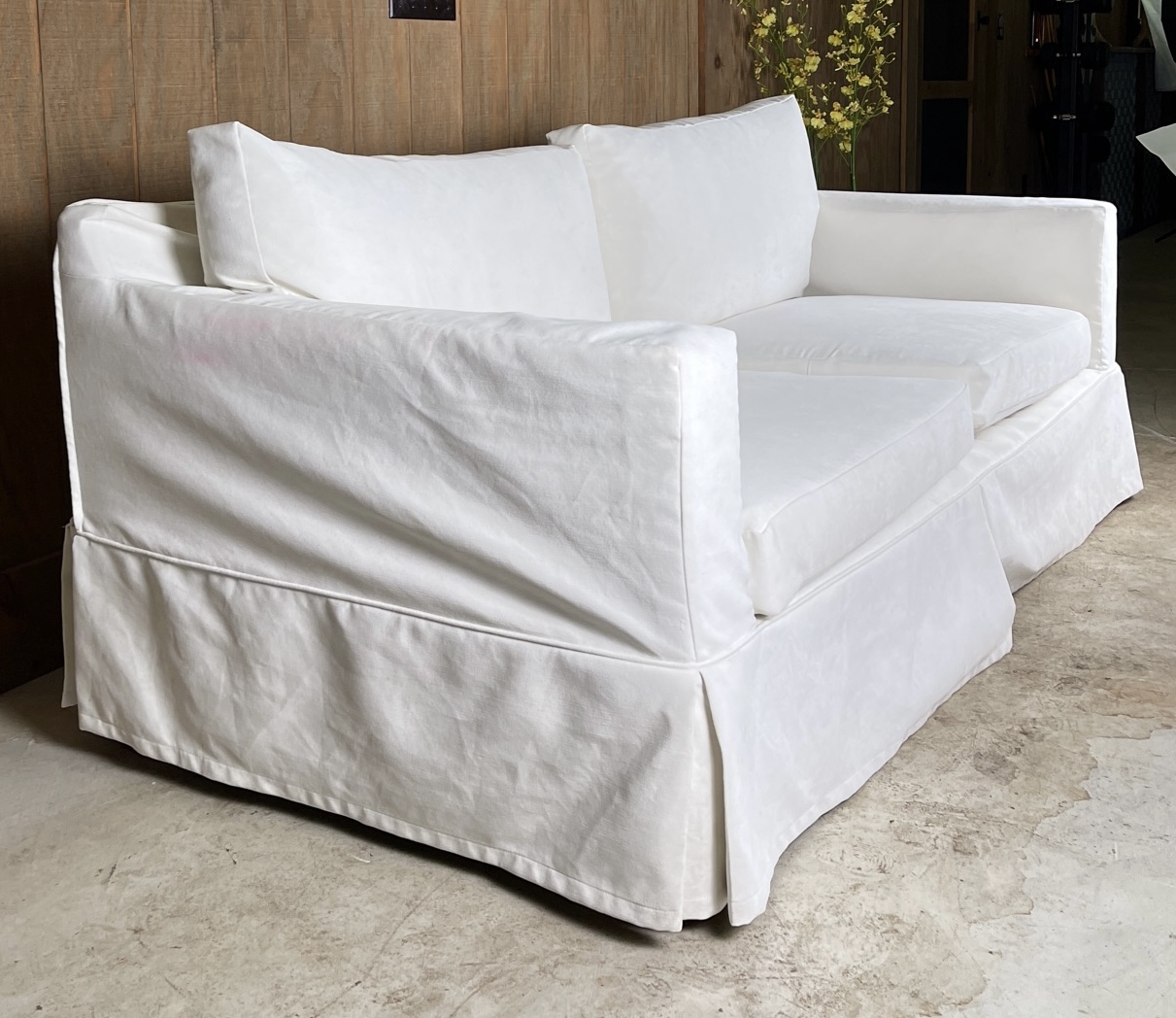 Removable back and seat cushions. Low wooden foot. Could use a cleaning.