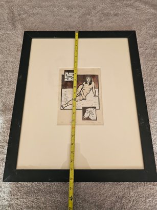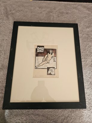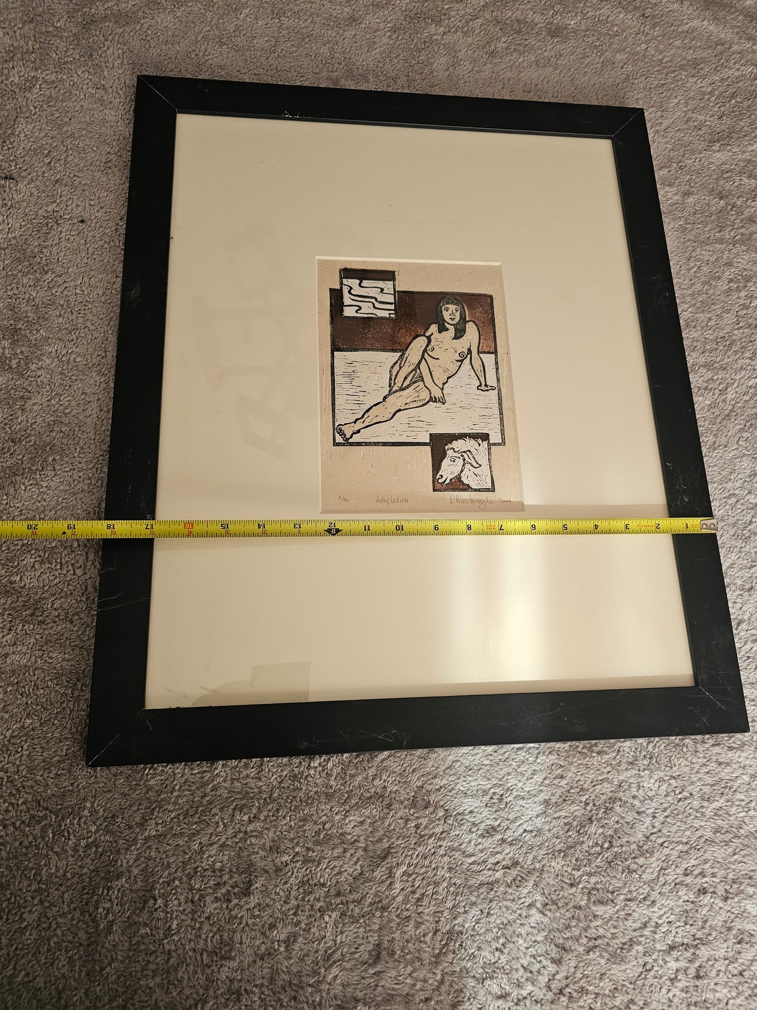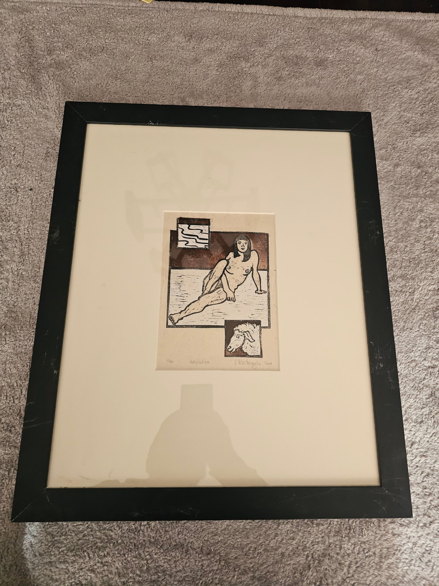 The print features a stylized nude female figure accompanied by an image of a sheep and abstract patterns.