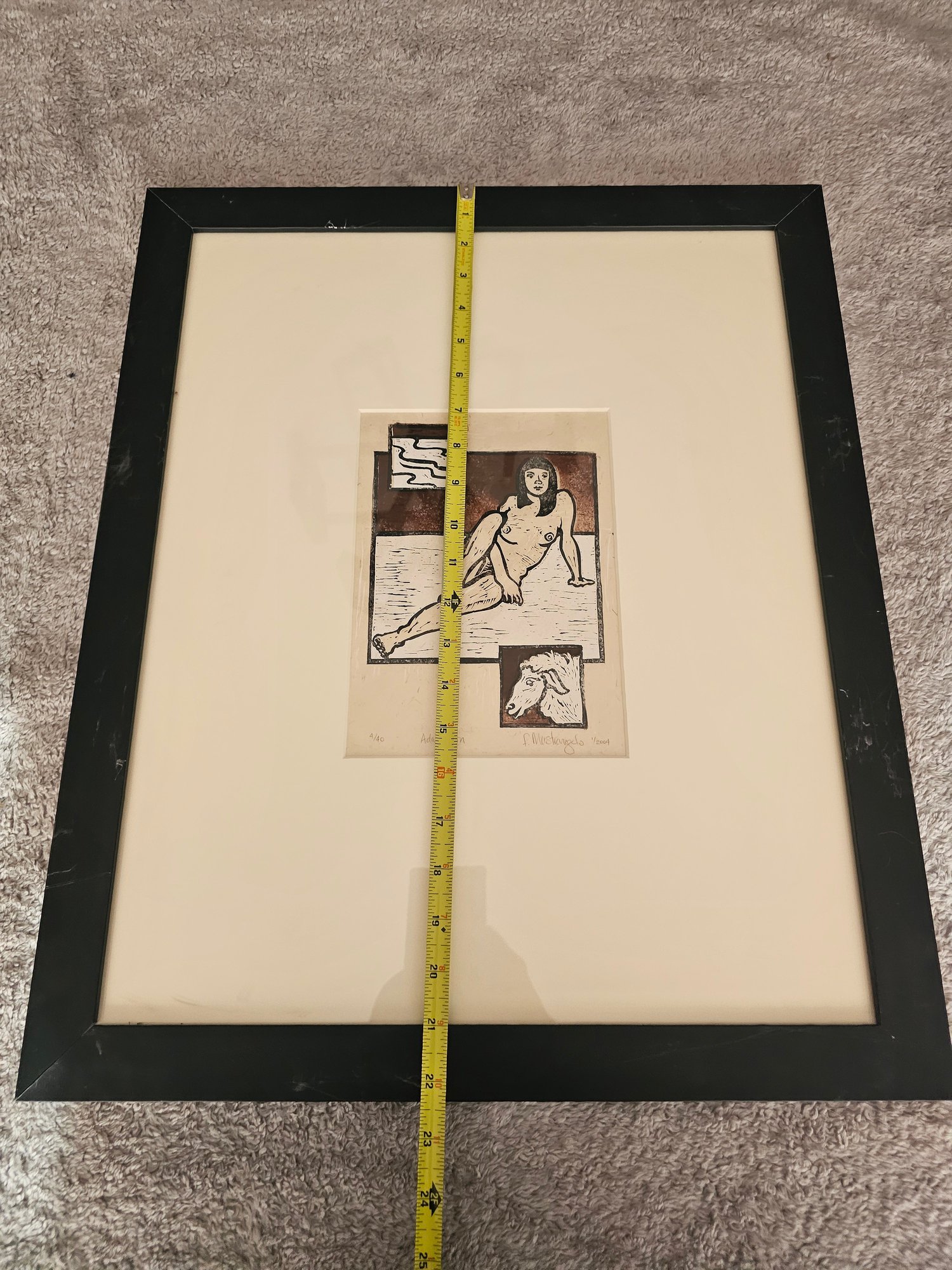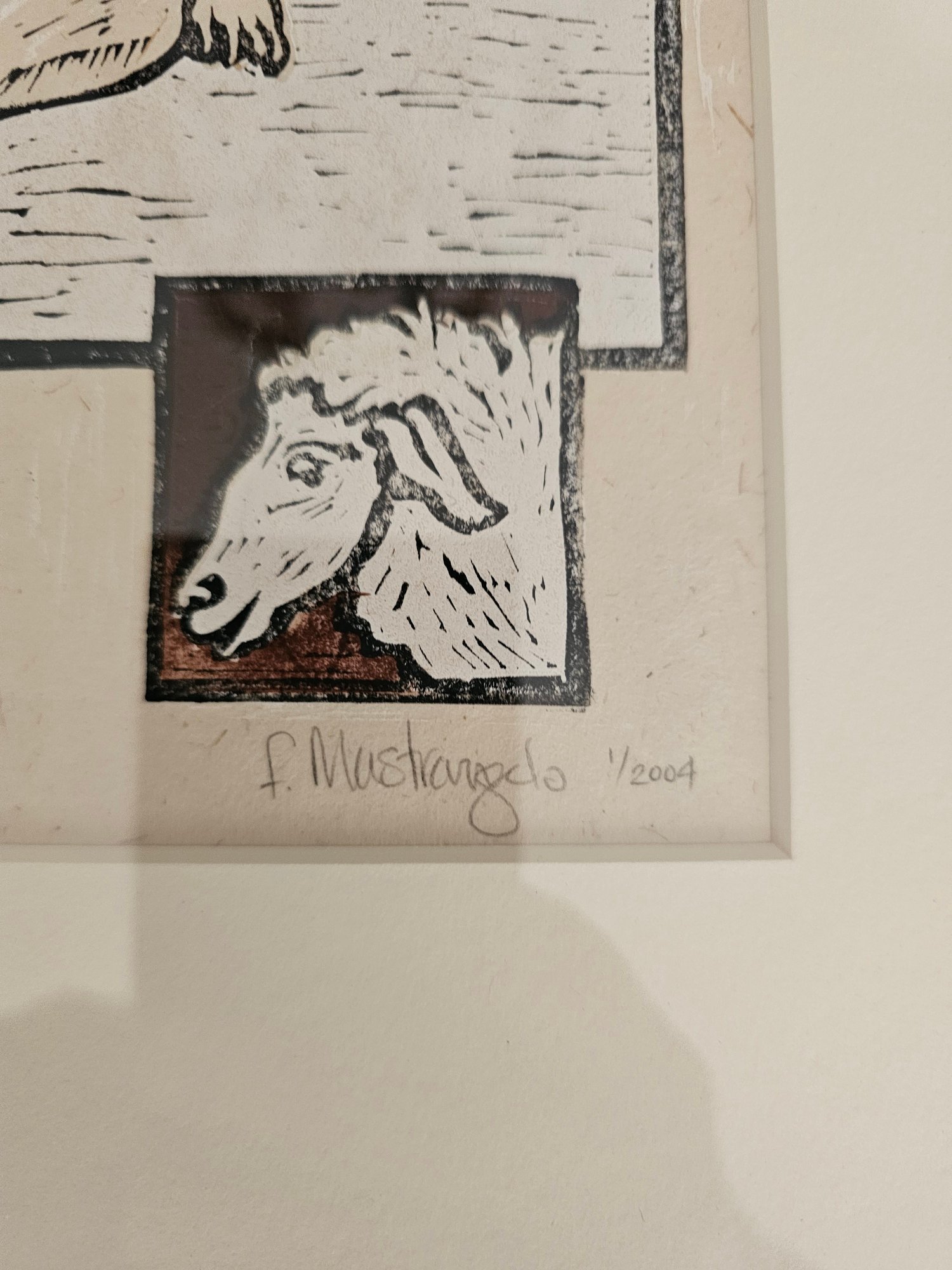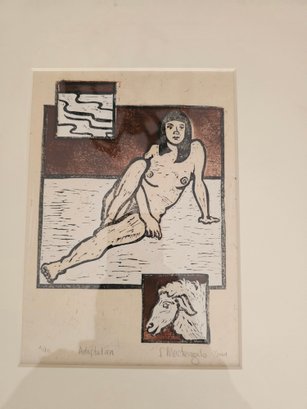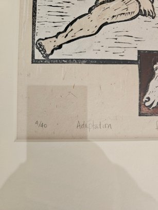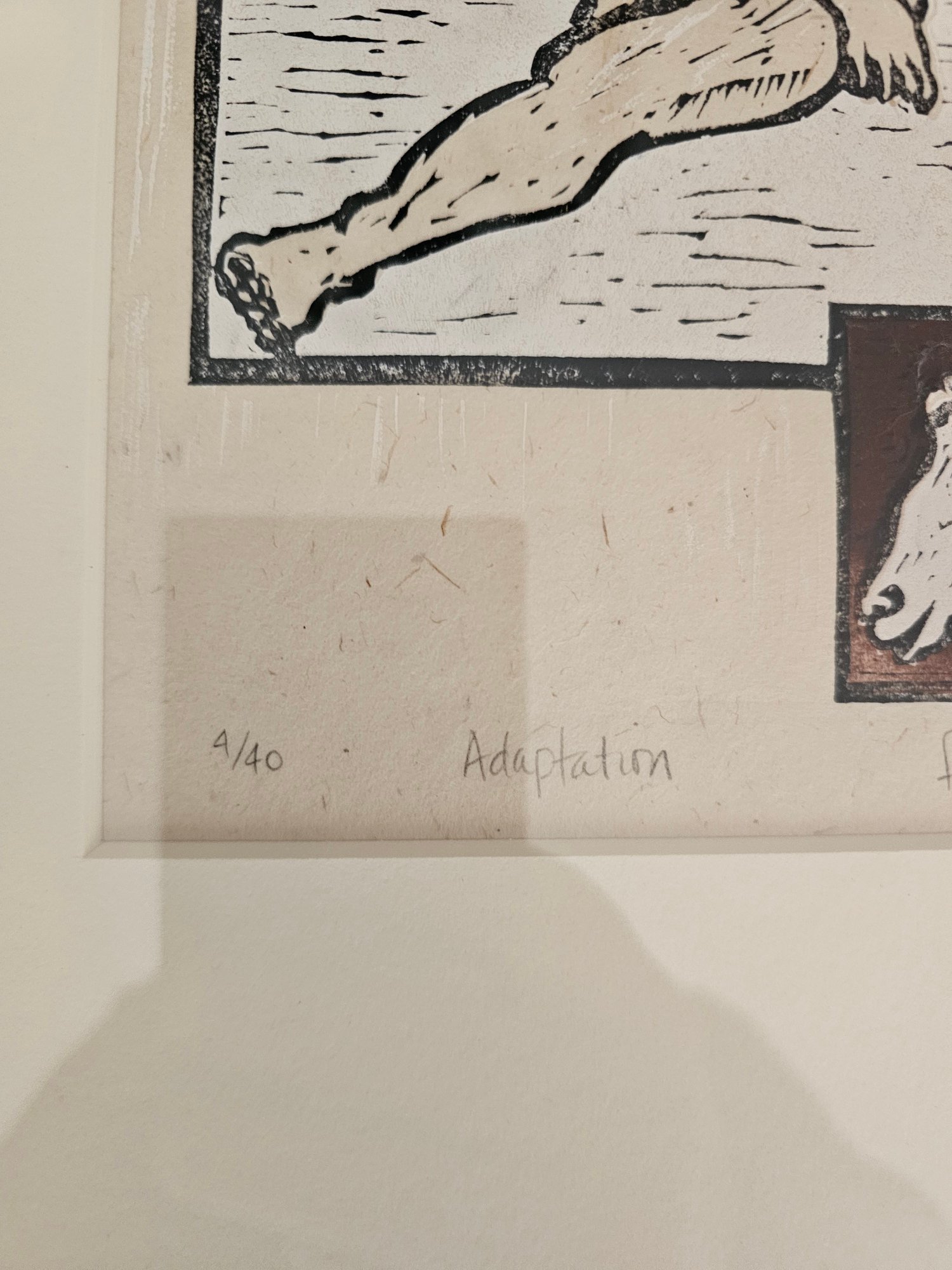 limited edition artwork, likely a woodcut print, titled "Adaptation" by the artist F. Mastrangelo from 2004, which is number 40 in an edition of 40.