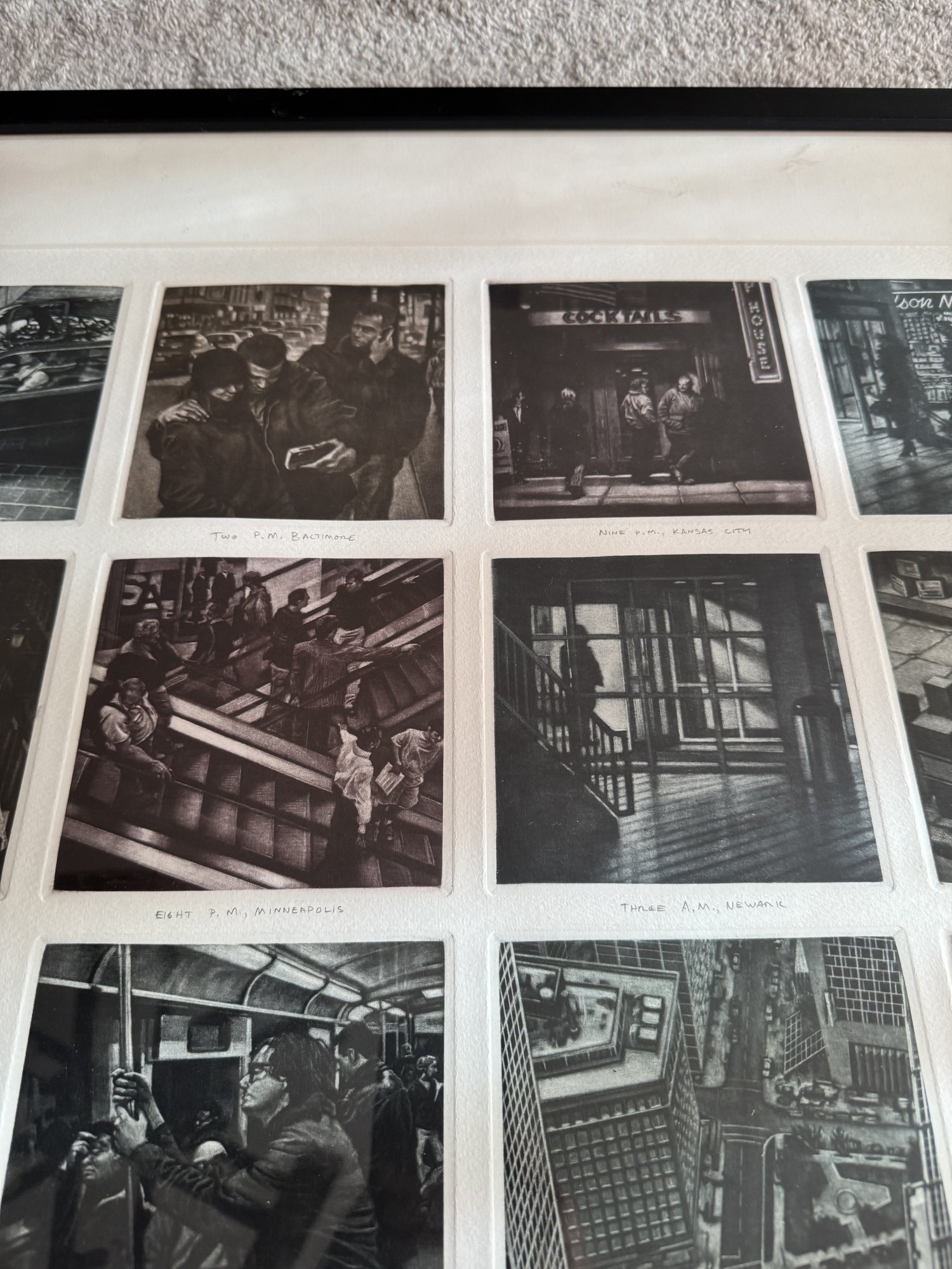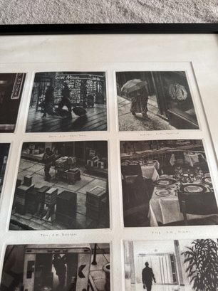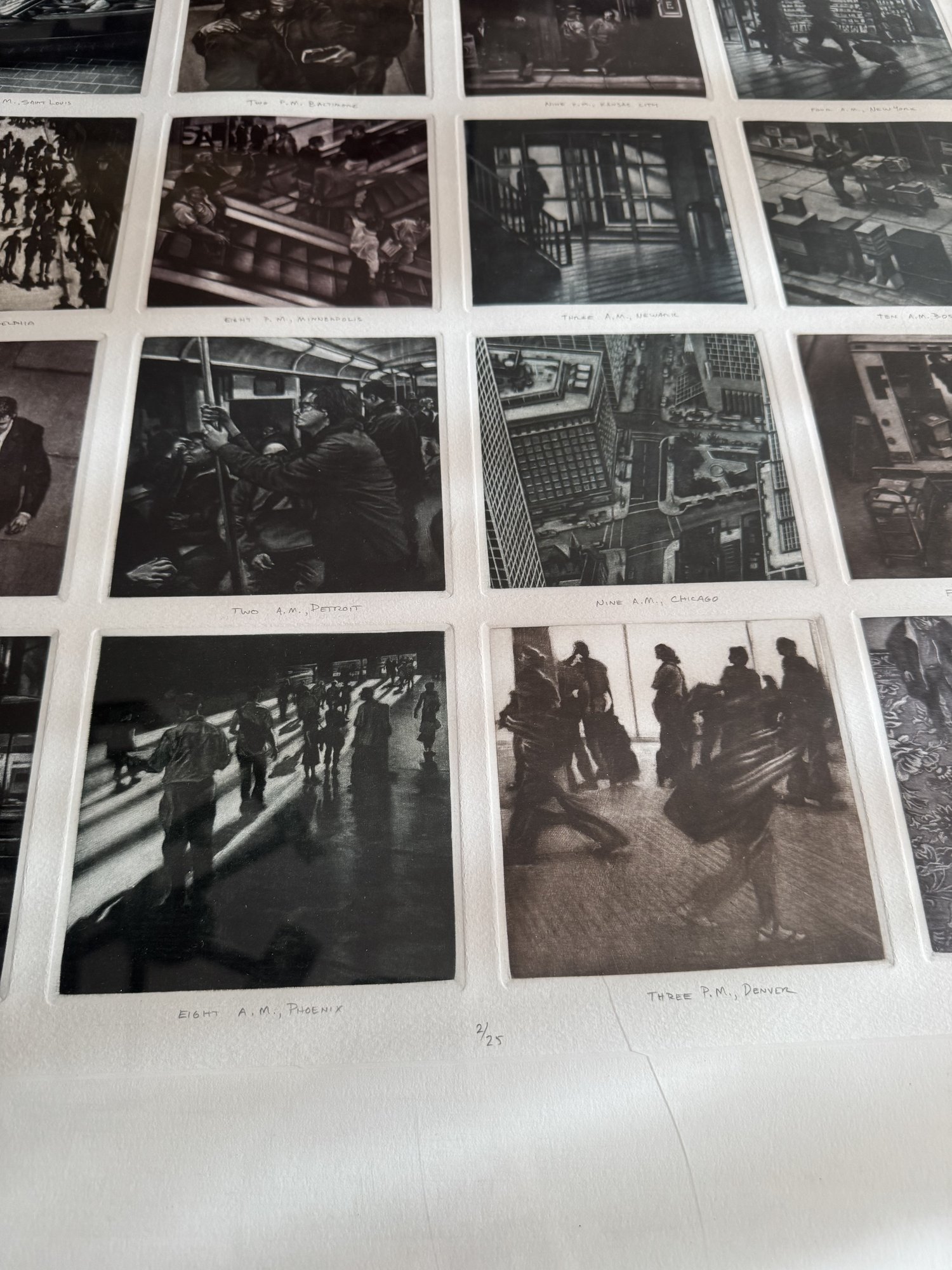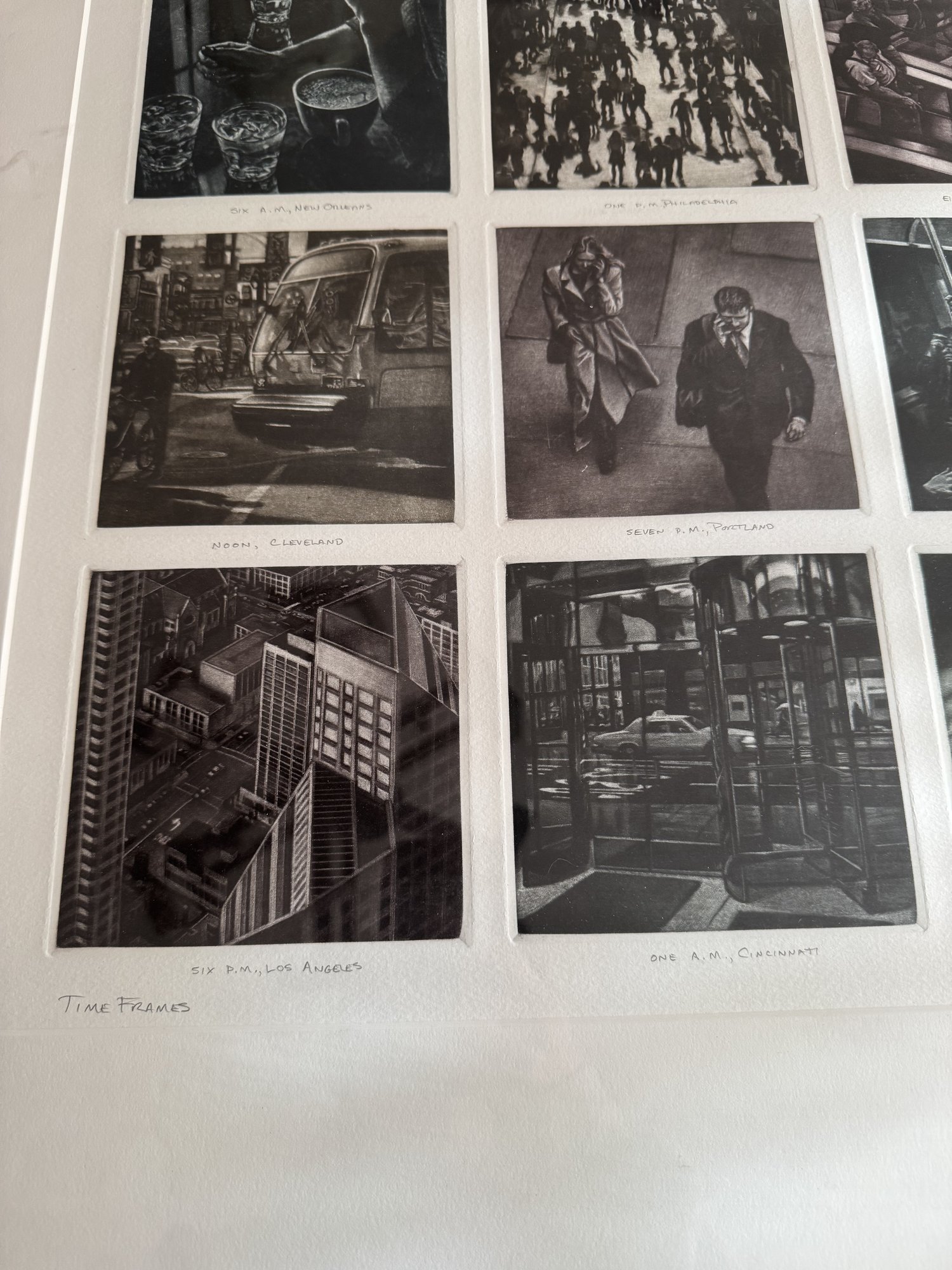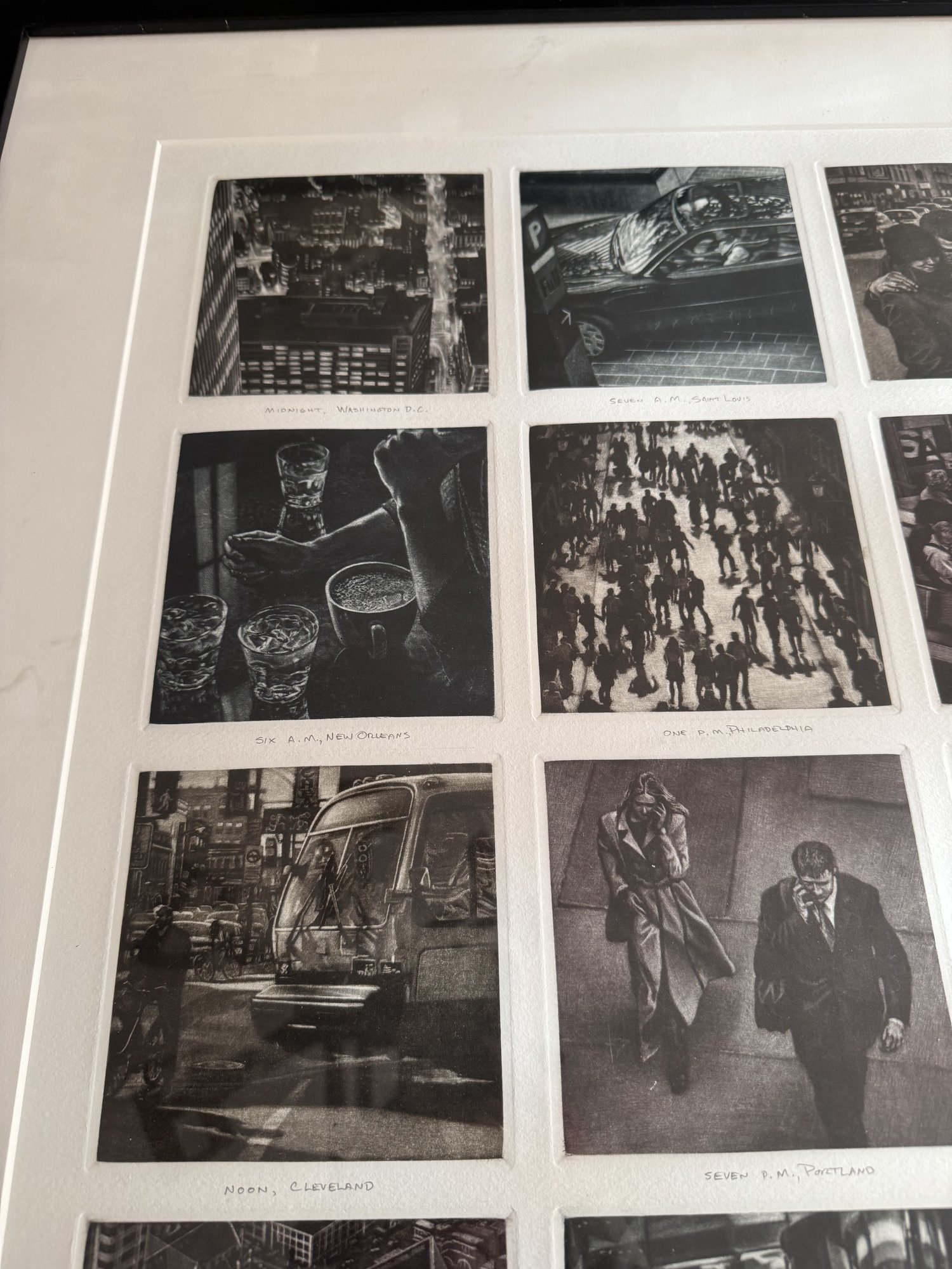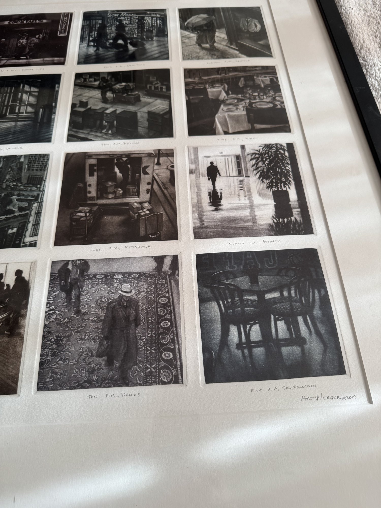 Art Werger (American, b. 1955), "Time Frames from Midnight to Midnight", 2002, mezzotint, titles inscribed in pencil under each of the twenty four images depicting a different location, lower margin at center has ed. 12/25, artist's signature and date 2002 in lower right margin, each impression 4 1/2" h. x 4 1/2" w., framed under glass, wear consistent with age, ss: 27" h. x 38 1/2" w.