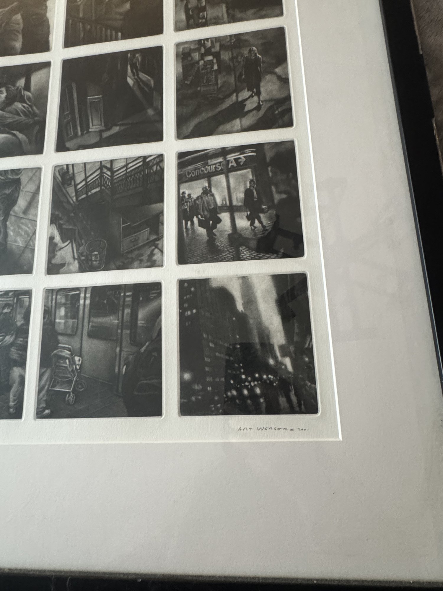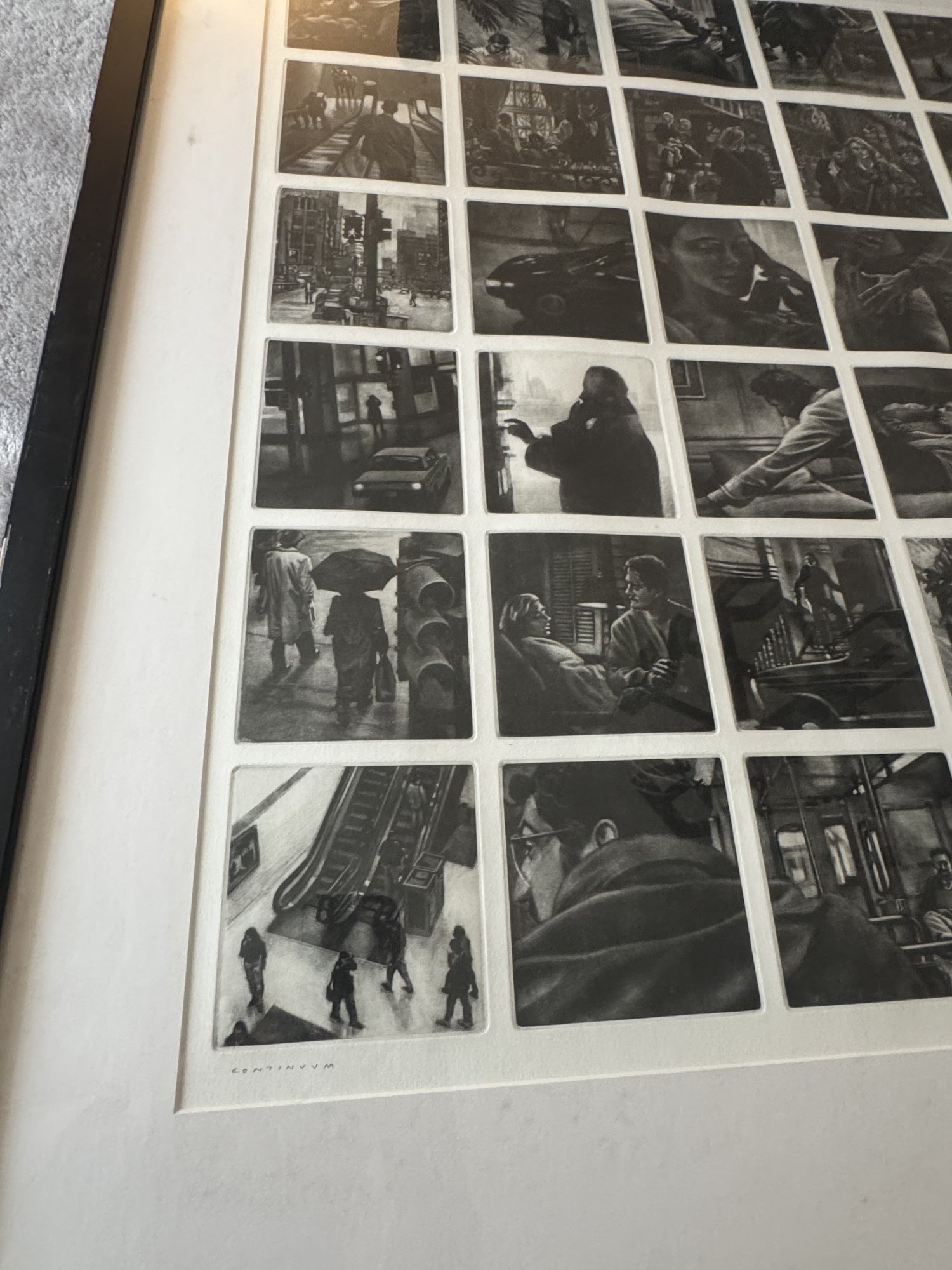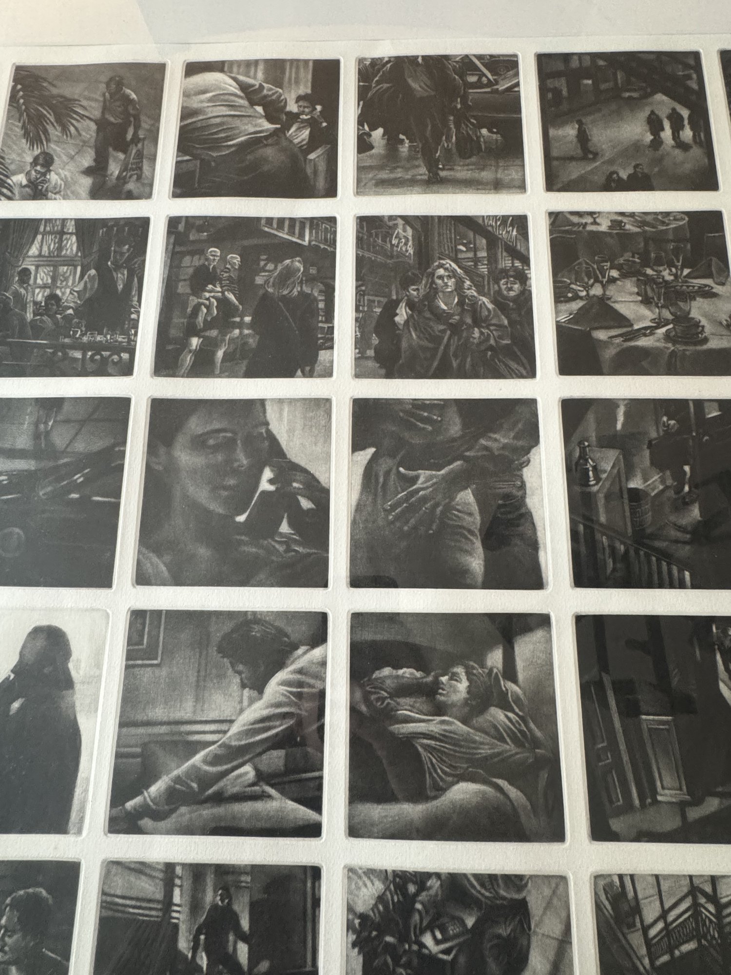 Signed. dated, and titled in pencil. Thirty-six individual plates. Row 1: "Prepared in Haste." "Even behind the Scenes." "She recognized His Voice." "Time Frame."" Almost Coincidence." "Especially Now." Row 2: "What had She said." " Although It Simplified Matters." Curious Indifference." "Their Singlemindedness." "The Setting." "Could go to Greater Lengths." Row 3: "Walk." "Pay Closer Attention." "Shifting Intentions." "An Obvious Question." "The Oddness of Your Home." 'Whatever Occurs" Row 4: "Vanishing." "Just a Reminder." "The Power of Concentration." "Fragmented Thoughts." "Through Corridors." "Late Afternoon." Row 5: "During His Absence." "Beyond a Basic Premise." "Events Pending." "An Eye for Meticulous Detail." "Barely a Month Had Elasped." "Central Nervous." Row 6: "Only a Community by Definition." "The Atrophy of Memory." "Within a Normal Life." "Forgotten Names." "Rising Expectation." "Obscured Goals."