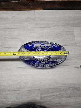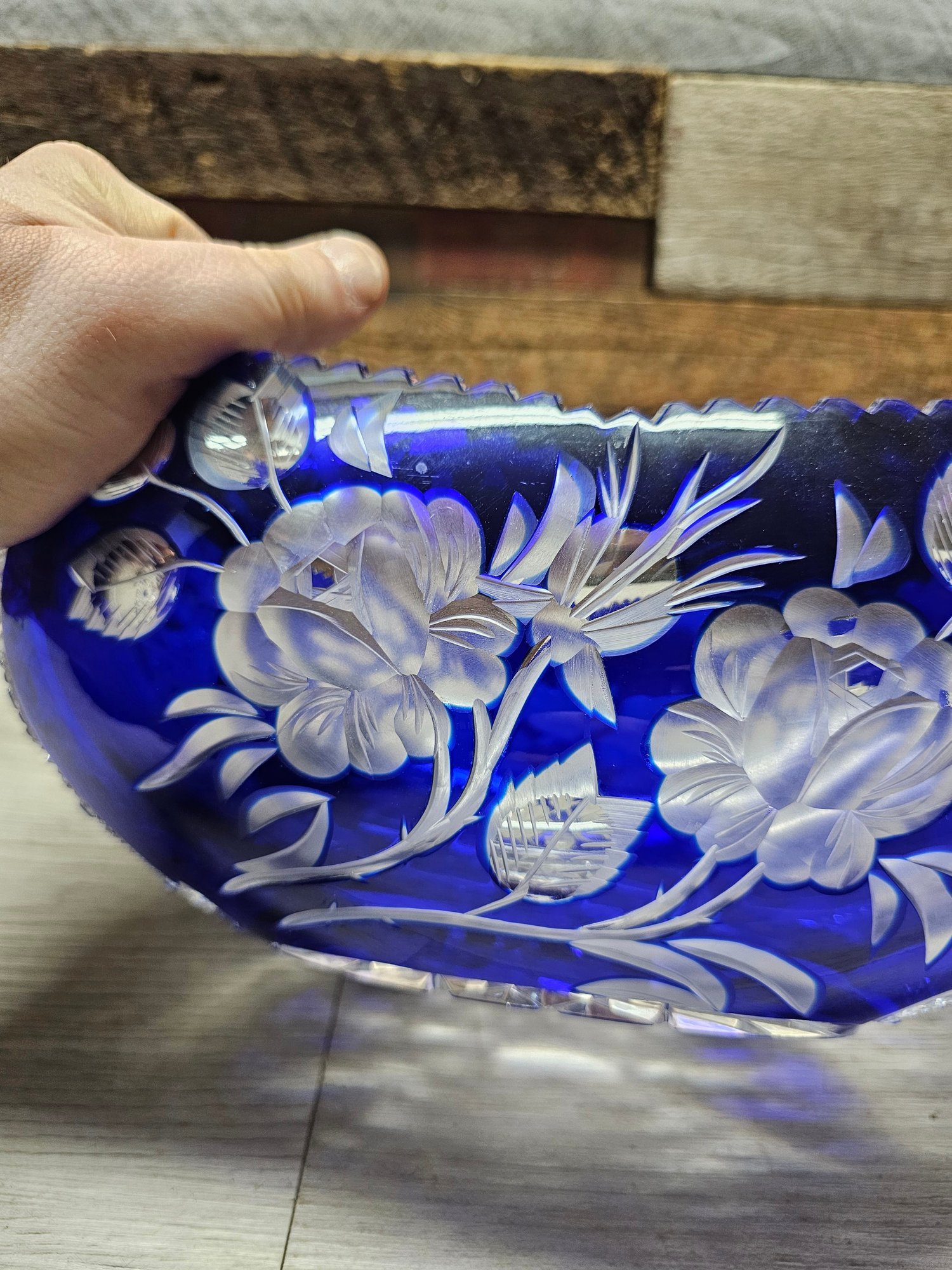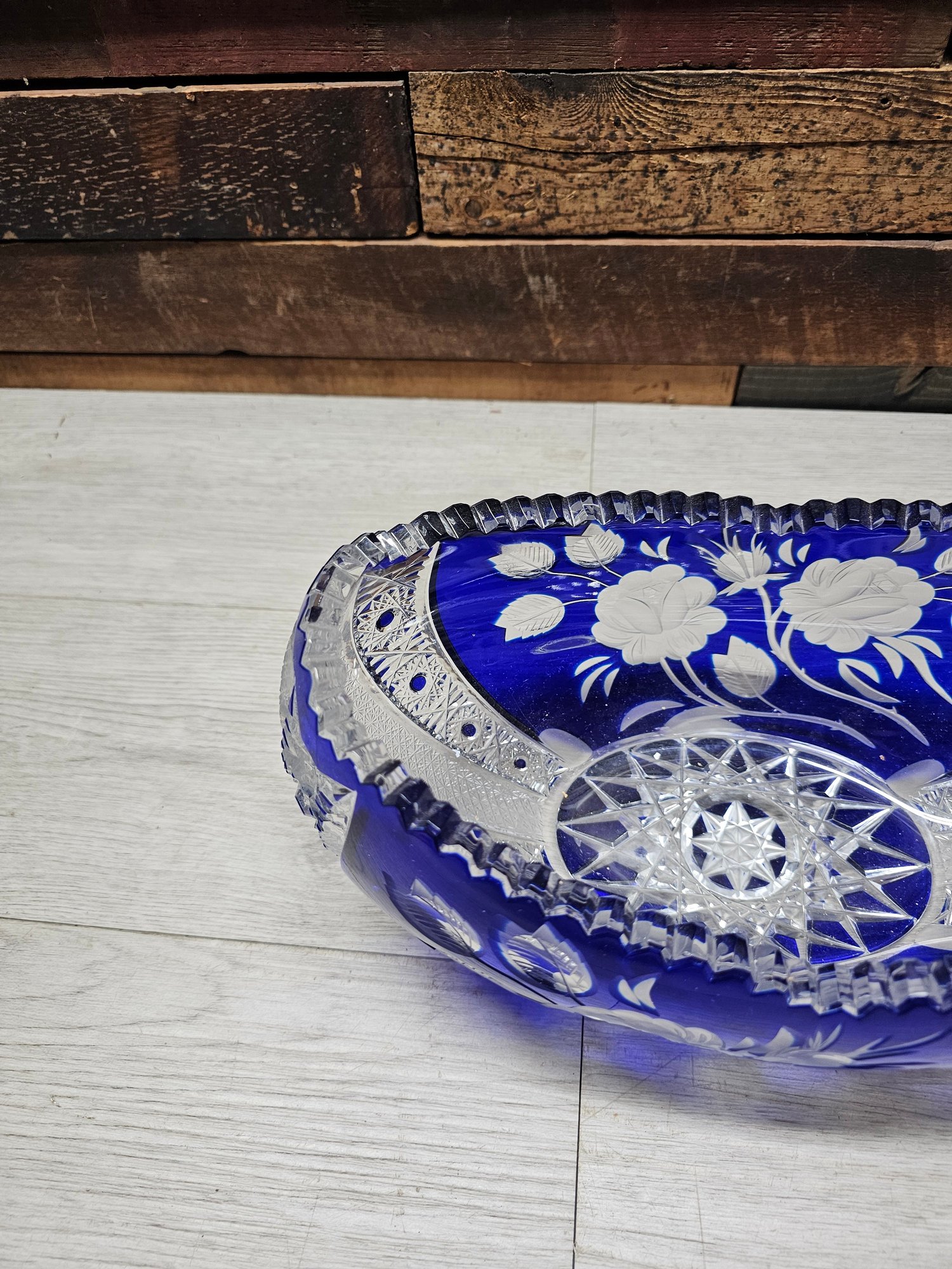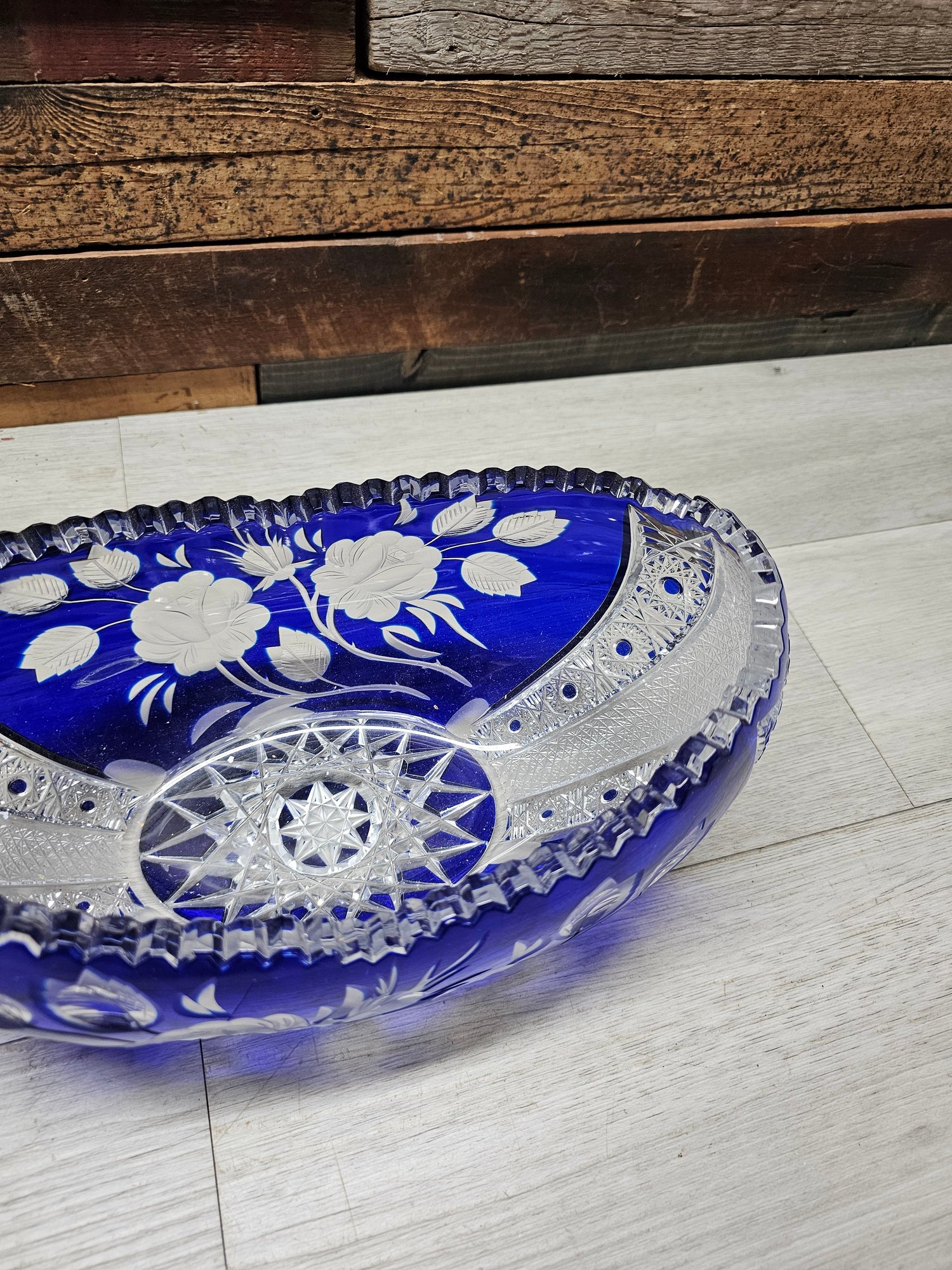 Awesome Ornate Cut Blue Glass Display Oval Bowl A6