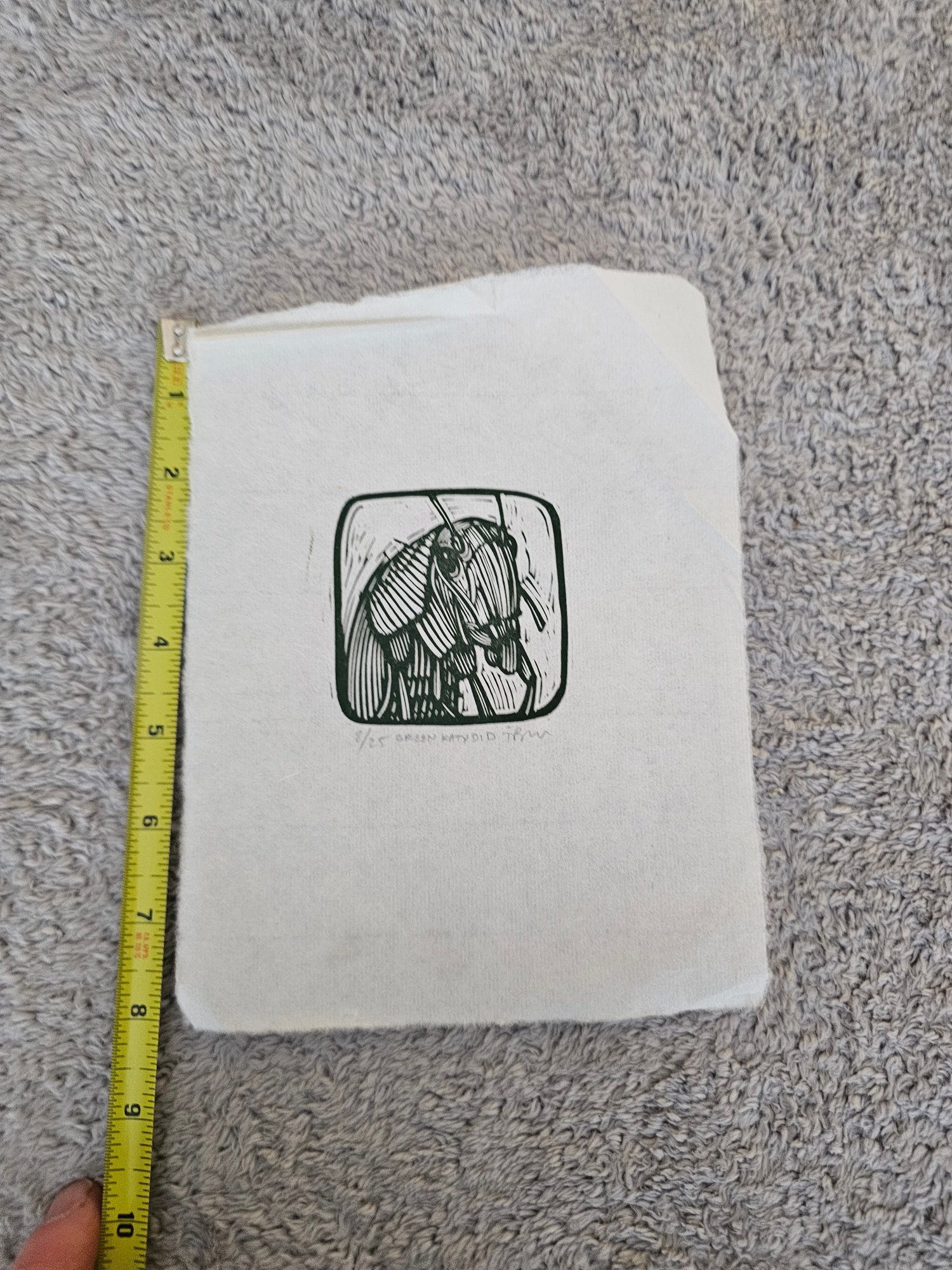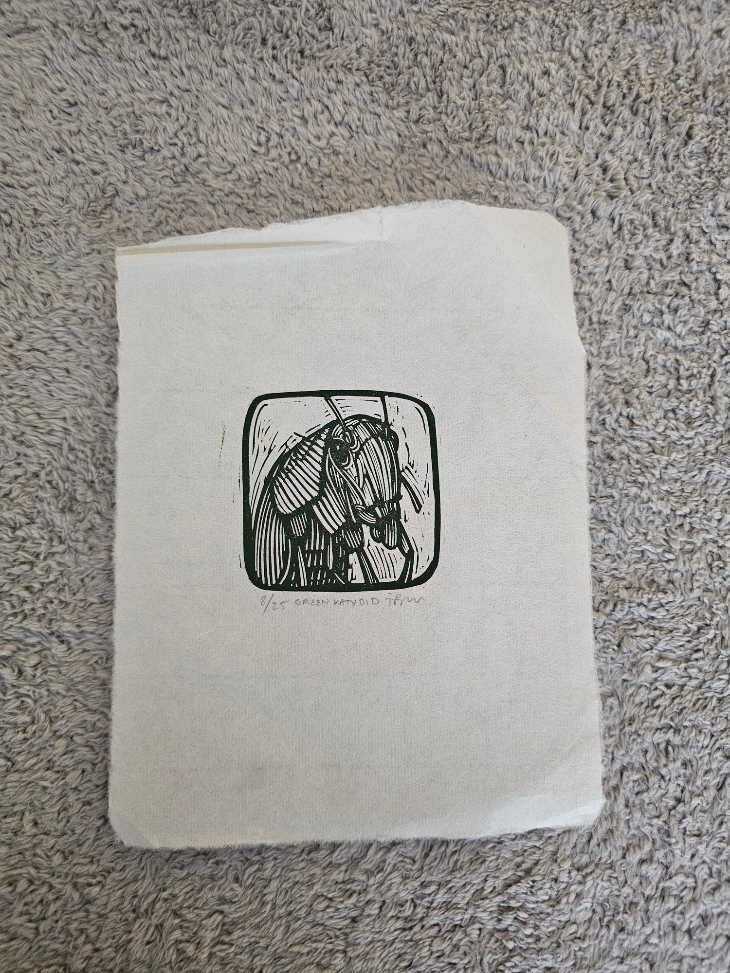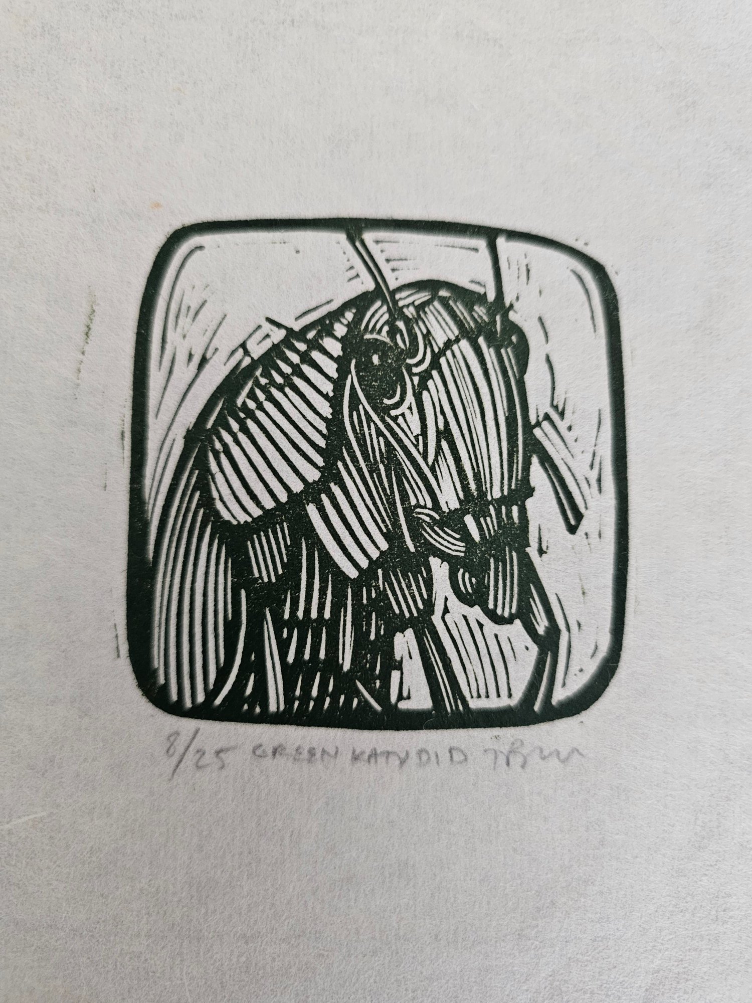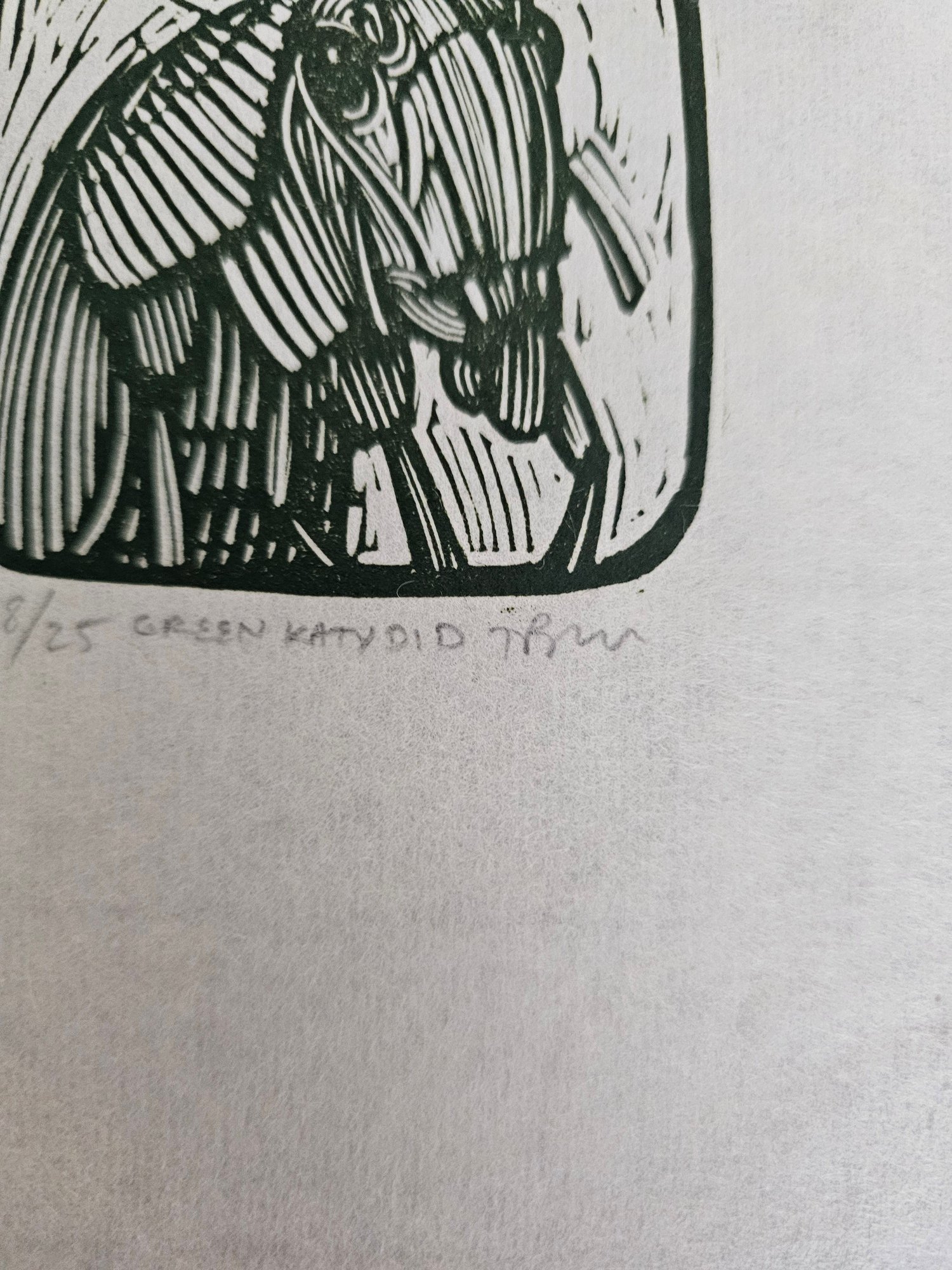 Limited Edition Signed Linocut Block Print Titled "Green Katydid 8/25 E43