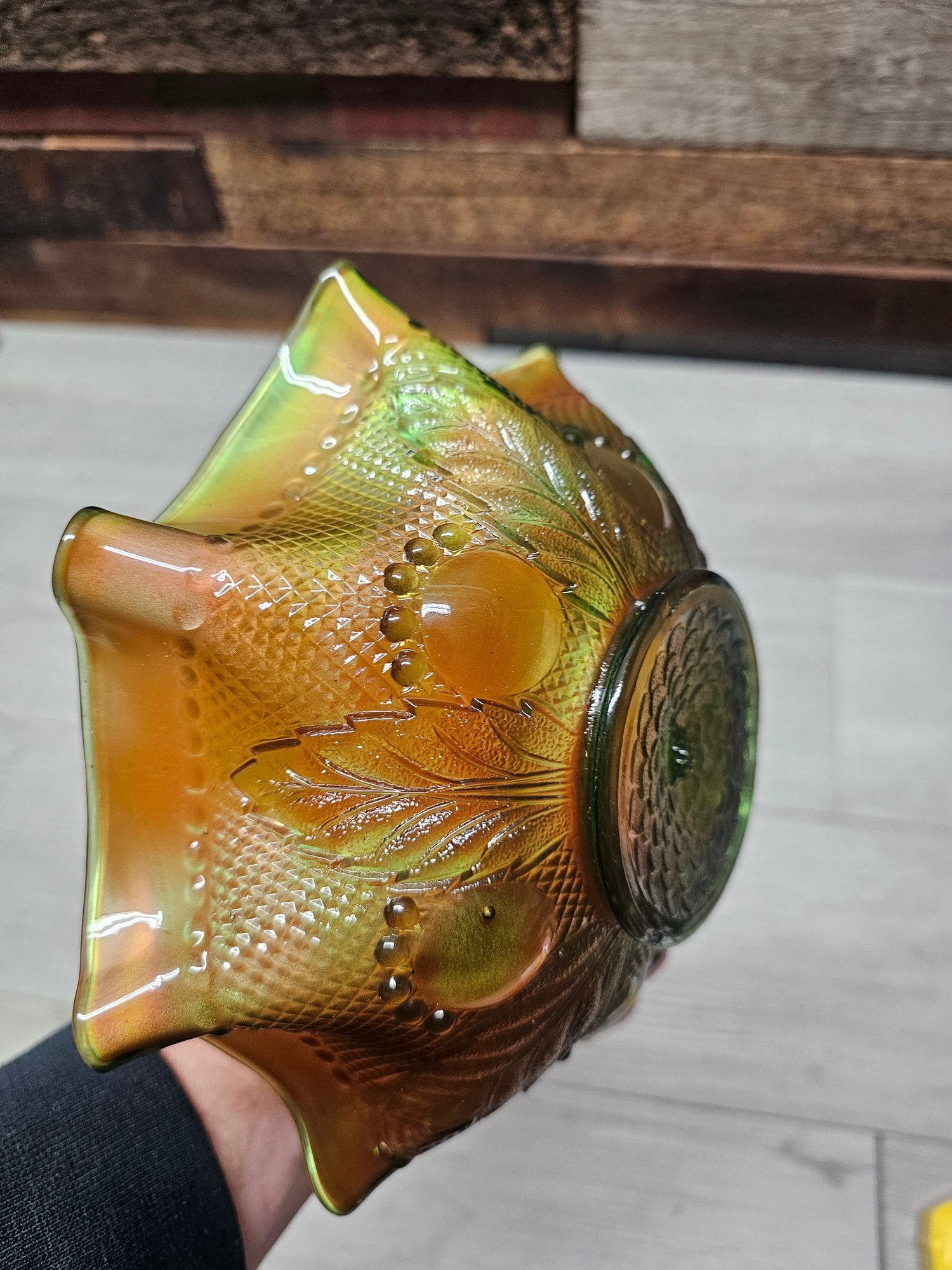 NORTHWOOD CARNIVAL GLASS "BULLSEYE AND LEAVES" GREEN RUFFLED BOWL A2