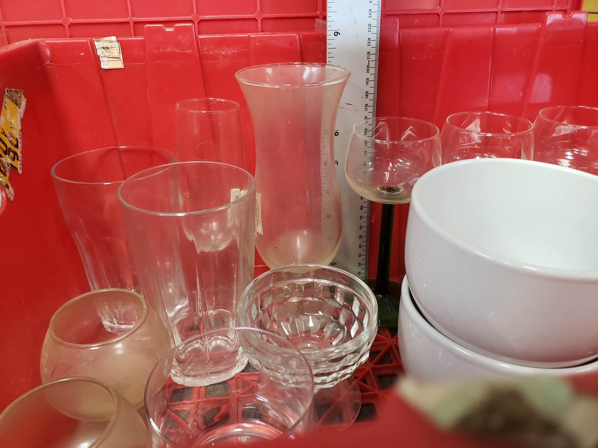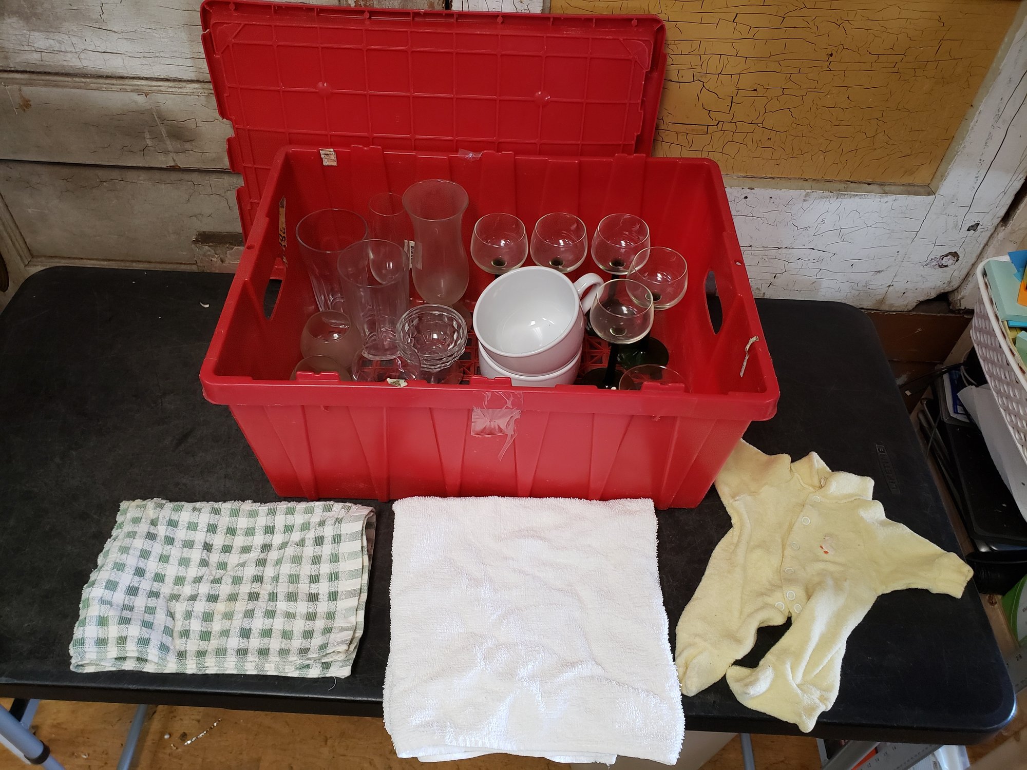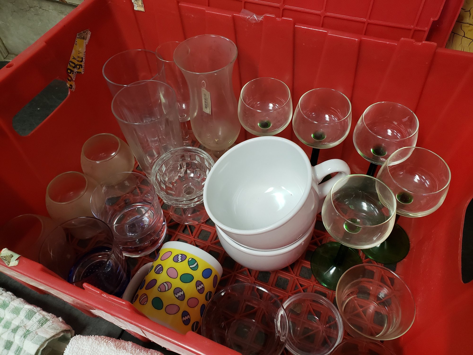 Red Bin Of Glassware And Towels Lot B4
