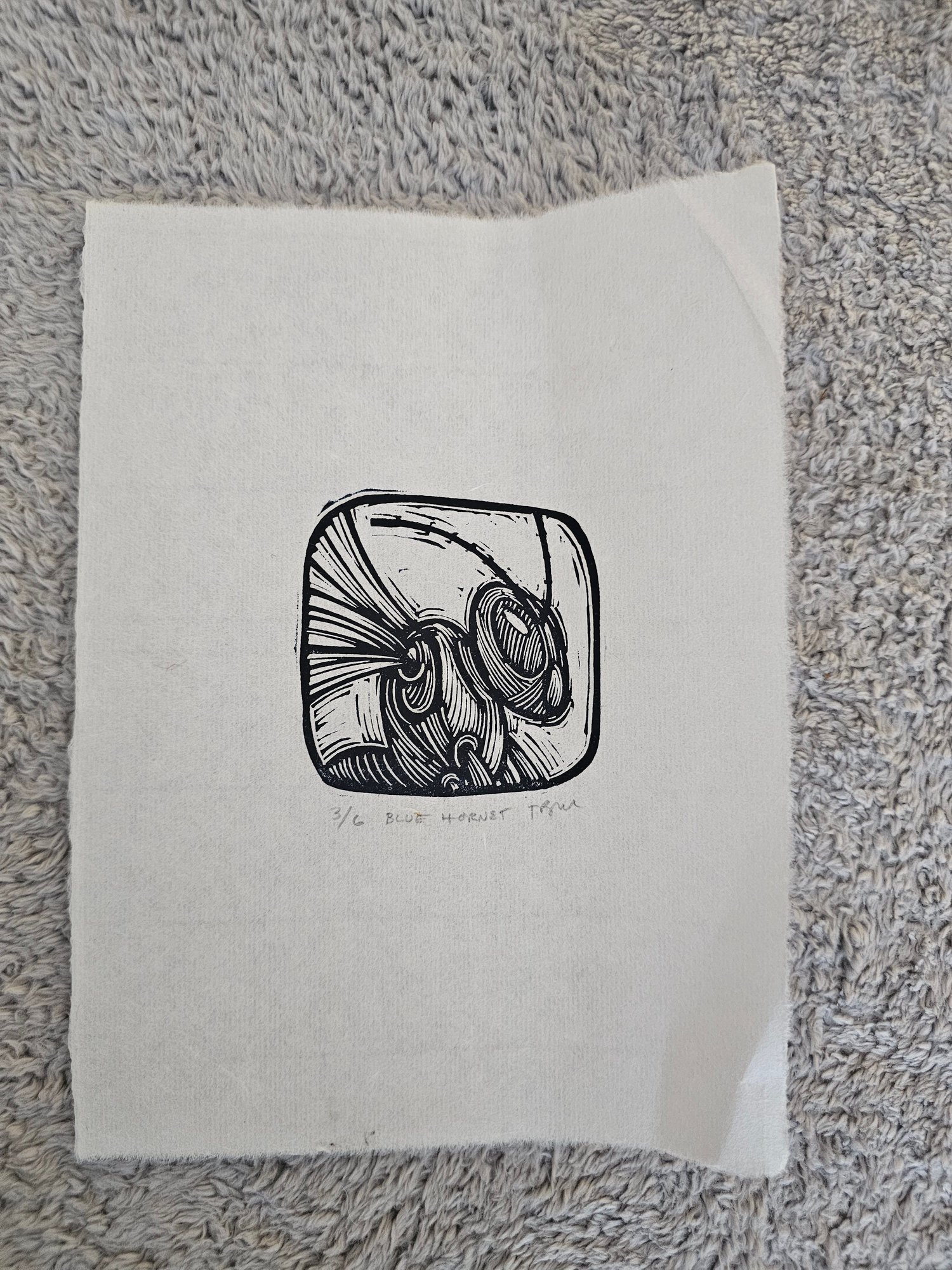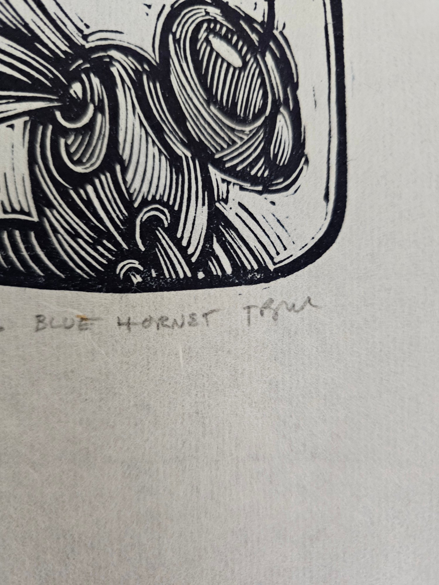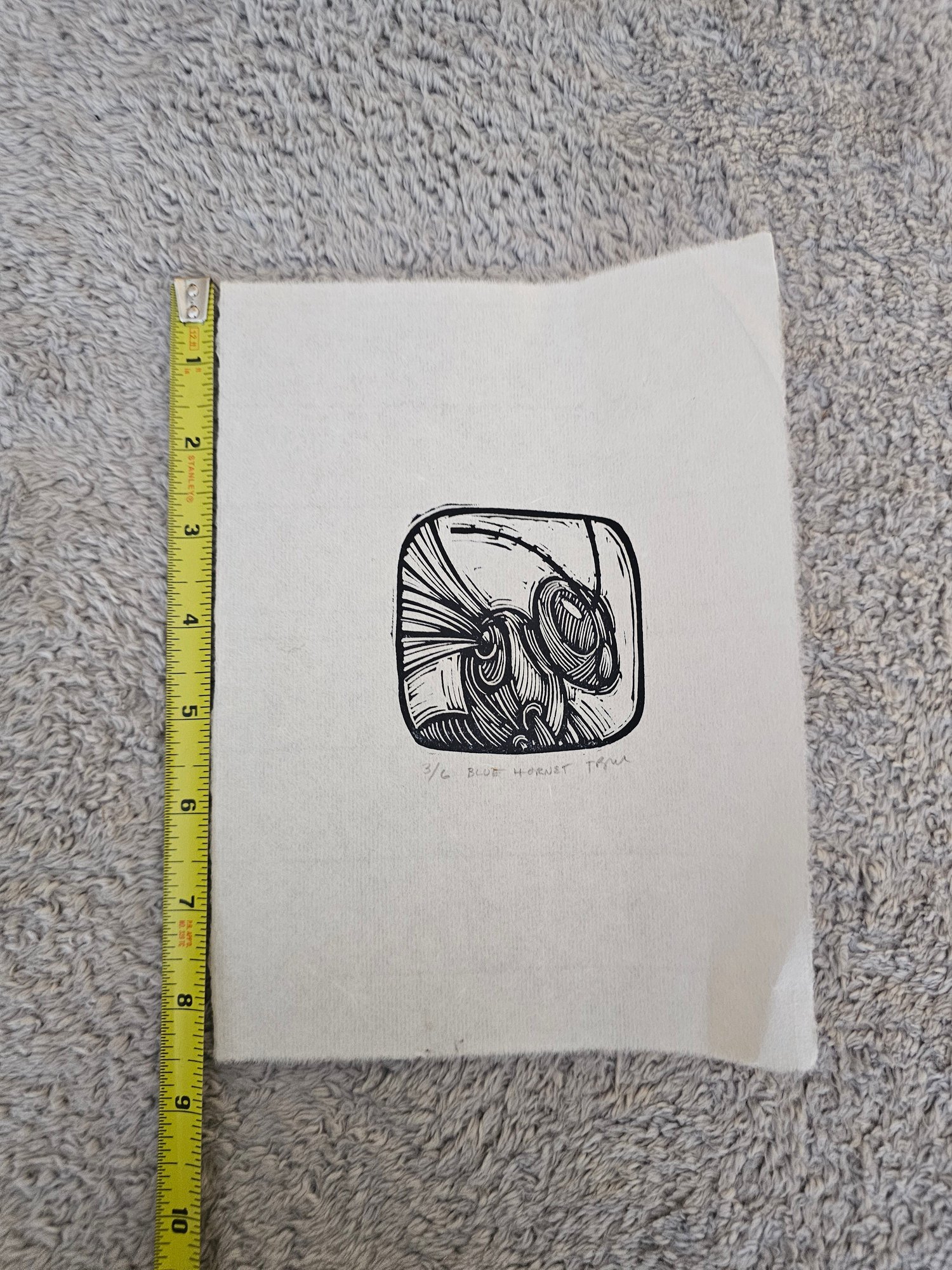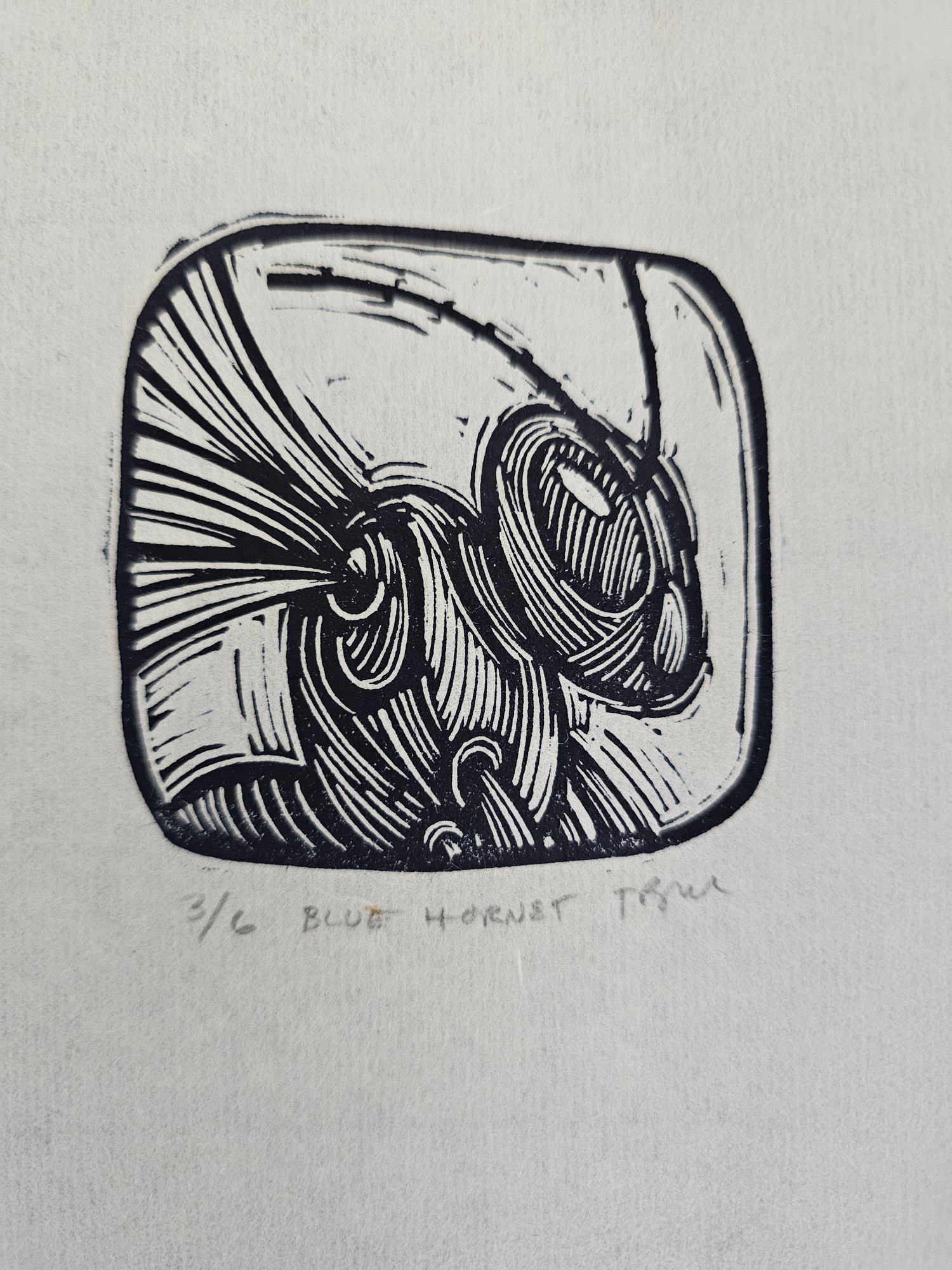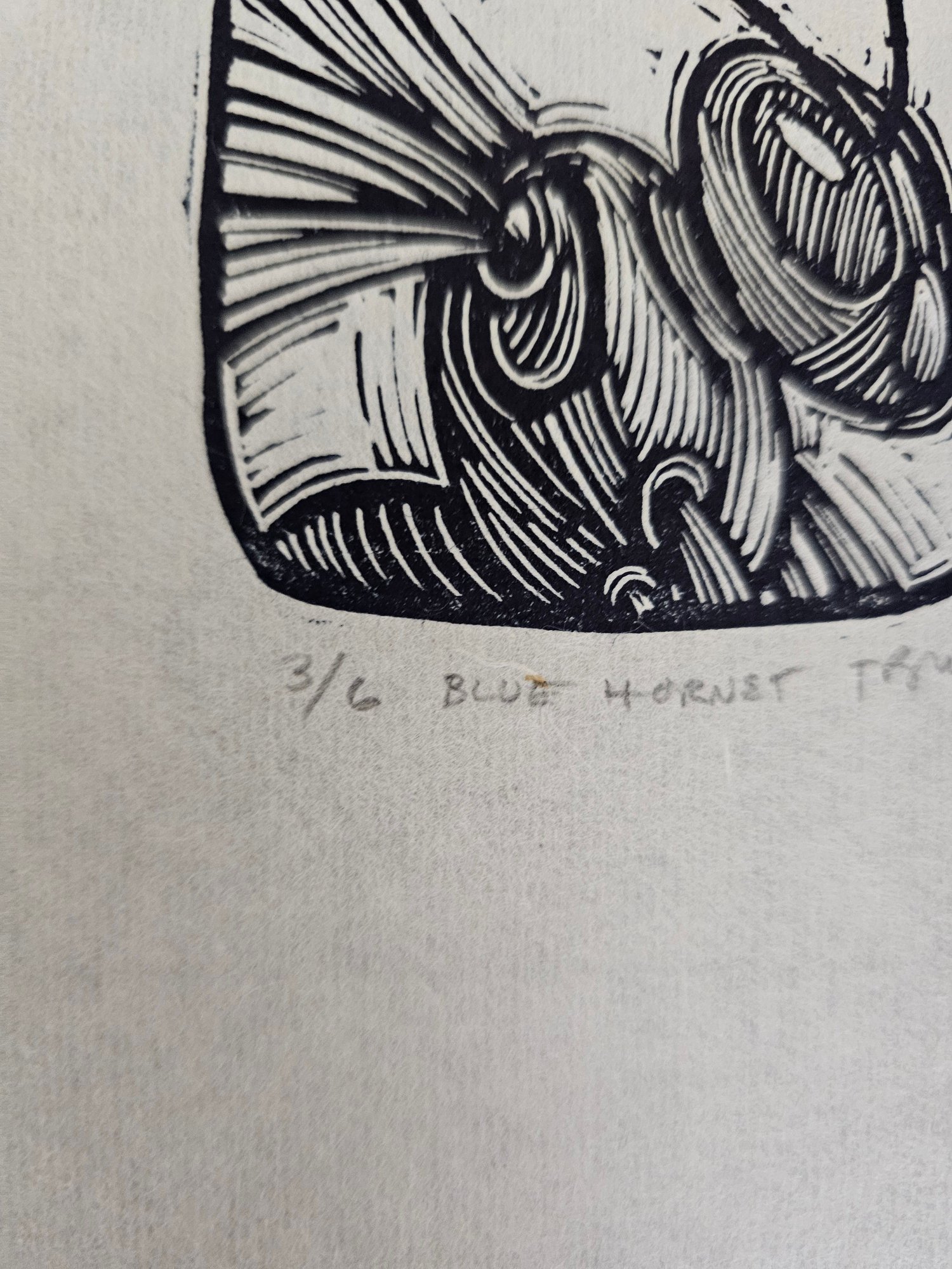 Signed Linocut Print Titled "BLUE HORNET", Numbered 3 Of 6. E40