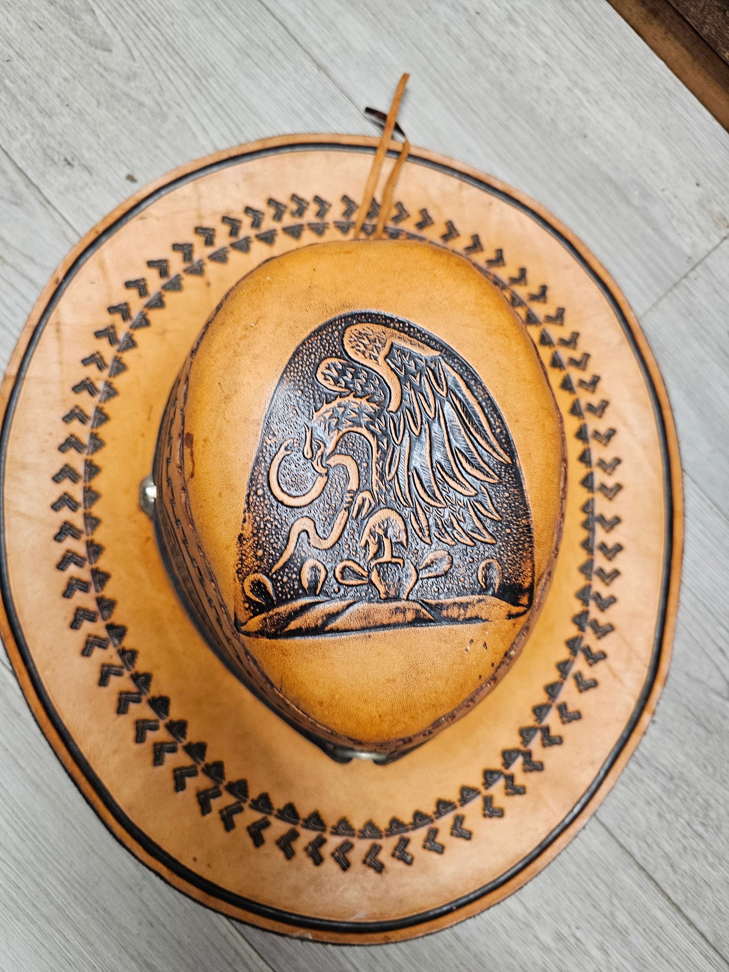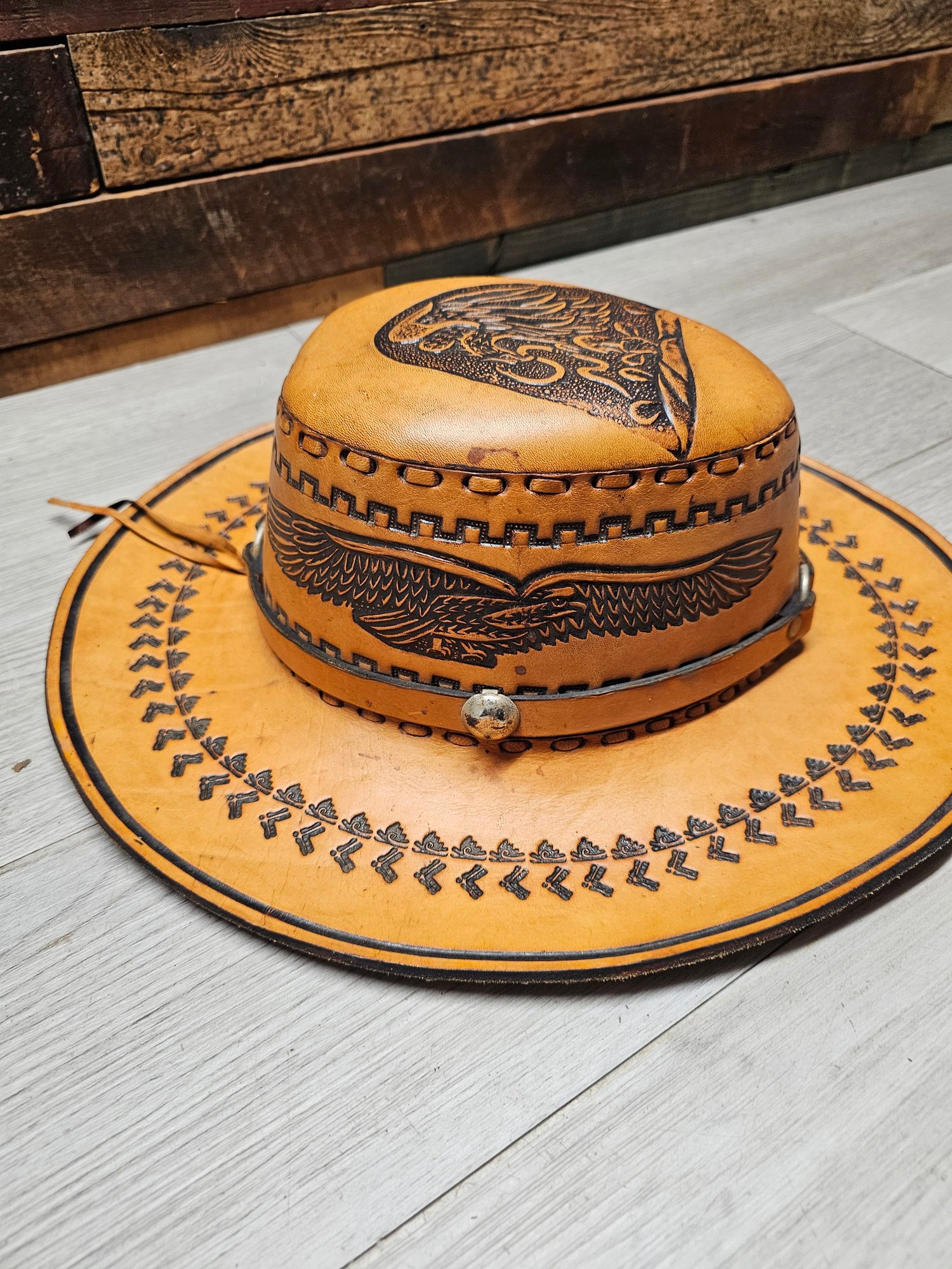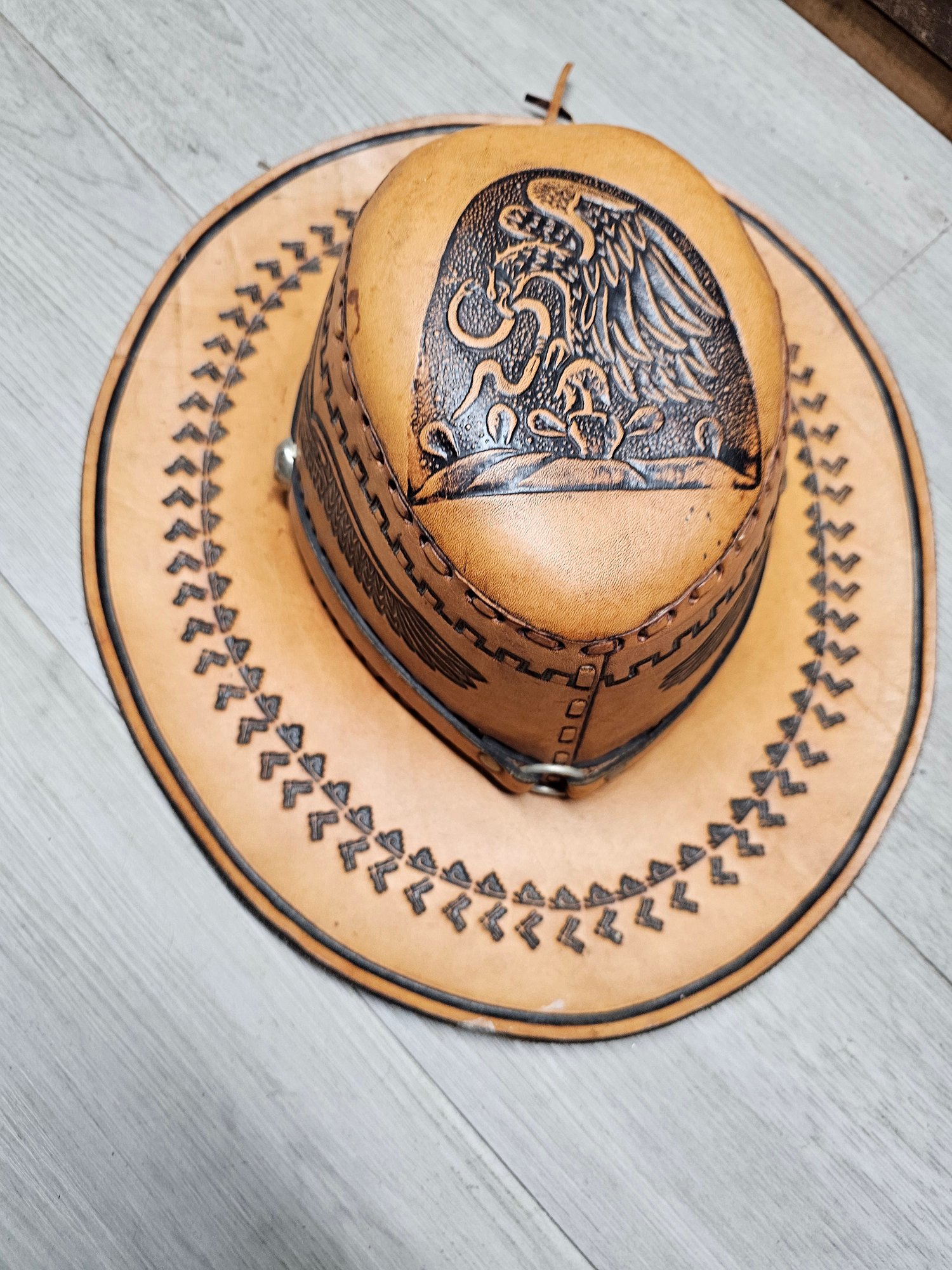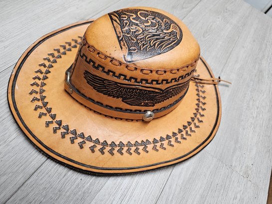 Vintage Leather Cowboy Hat Hand Tooled Brown Aztec Eagle Mexican Western A6