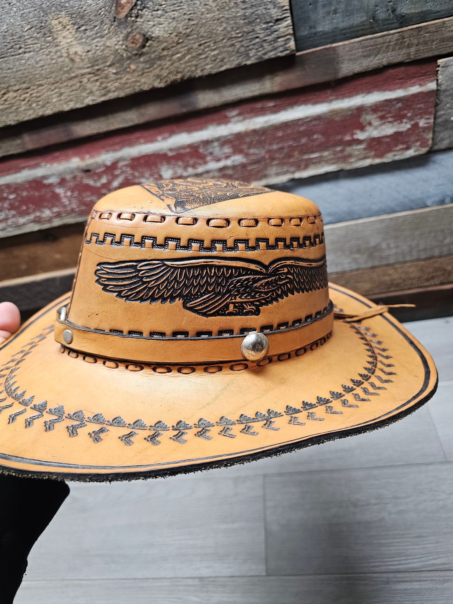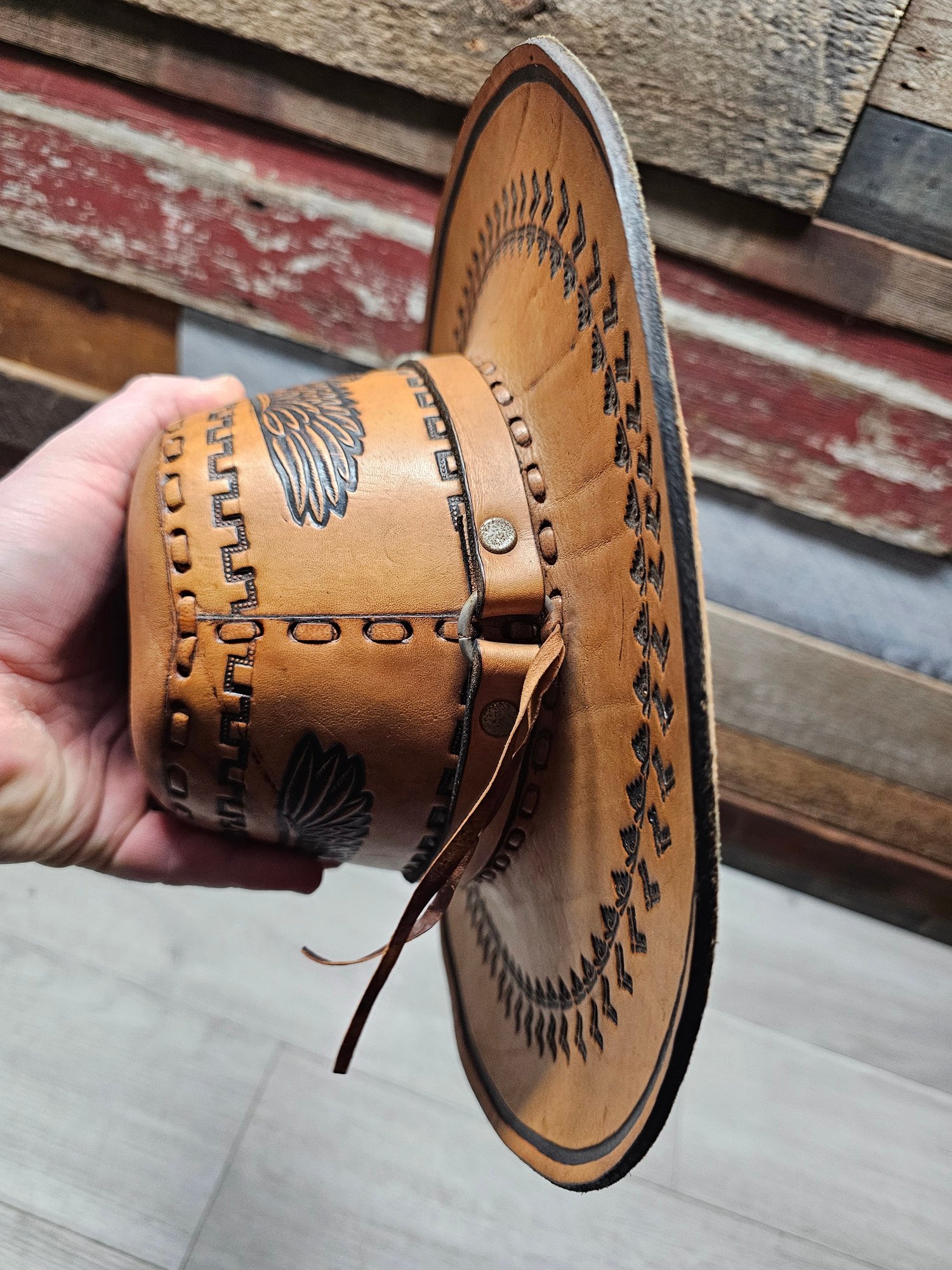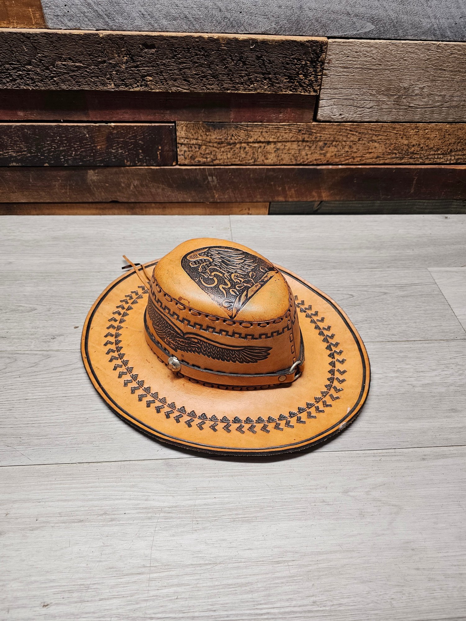 Vintage Leather Cowboy Hat Hand Tooled Brown Aztec Eagle Mexican Western A6