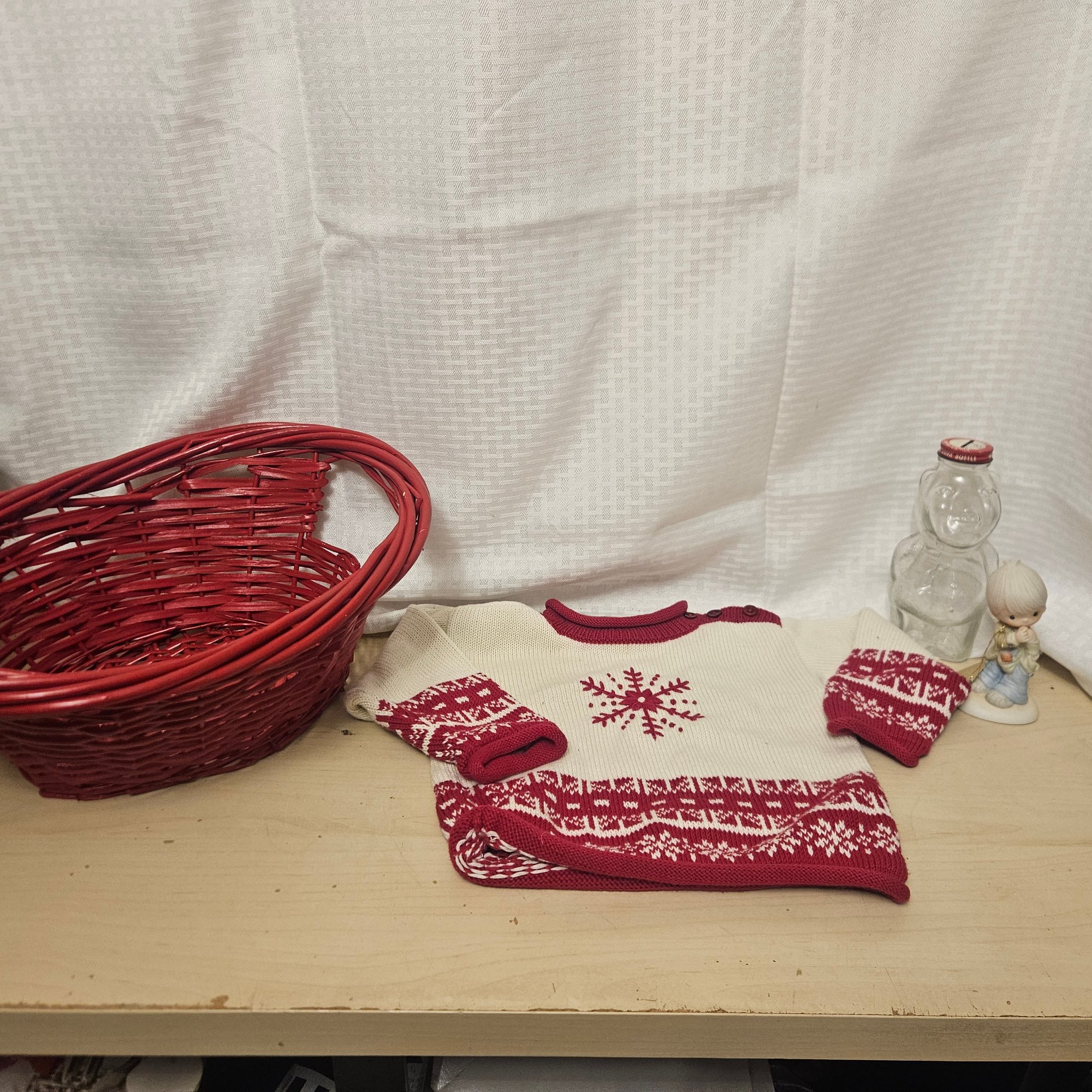 This sweet and thoughtfully assorted lot features a red decorative basket filled with a cozy kids’ sweater, a classic Precious Moments figurine beloved for its heartfelt charm, and a glass bear-shaped bottle that adds a touch of whimsy. A delightful mix of warmth, nostalgia, and decorative appeal, this bundle would make a lovely gift or a charming addition to a child’s room, nursery, or collectible display.