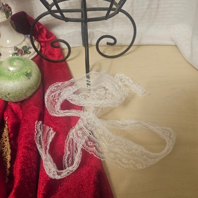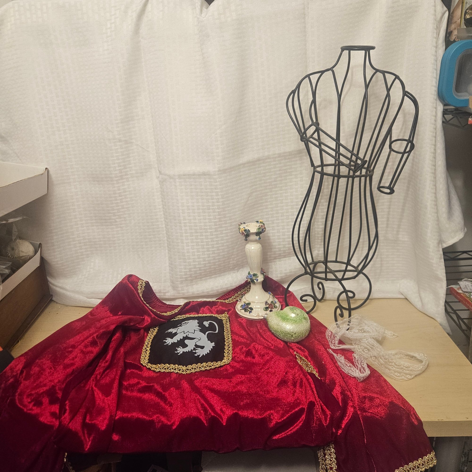 This elegant and artistic lot includes a wire metal mannequin perfect for display or jewelry, a red Renaissance-style accent piece featuring a lion pattern on the back top, a decorative candlestick, a shell ornament that adds a coastal note, and a white ribbon for styling or crafting. Blending classic, artistic, and natural elements, this collection offers a refined yet eclectic look ideal for decorators, crafters, or anyone who enjoys unique and expressive décor pieces.