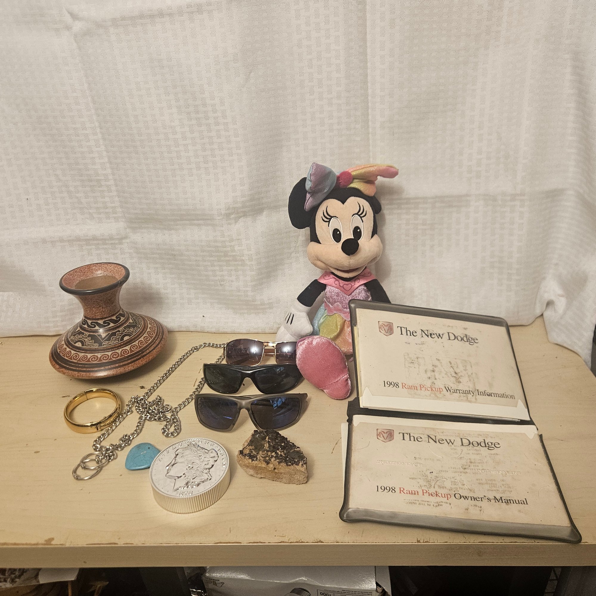 This diverse lot includes The New Dodge Papers, a Minnie Mouse stuffed animal, three pairs of sunglasses, a coin purse, a bracelet, a pottery vase, and additional assorted items. Blending literature, whimsical collectibles, fashion accessories, and decorative pieces, this assortment offers something for everyone. Perfect for collectors, gift-givers, or anyone who enjoys unique and eclectic household treasures.