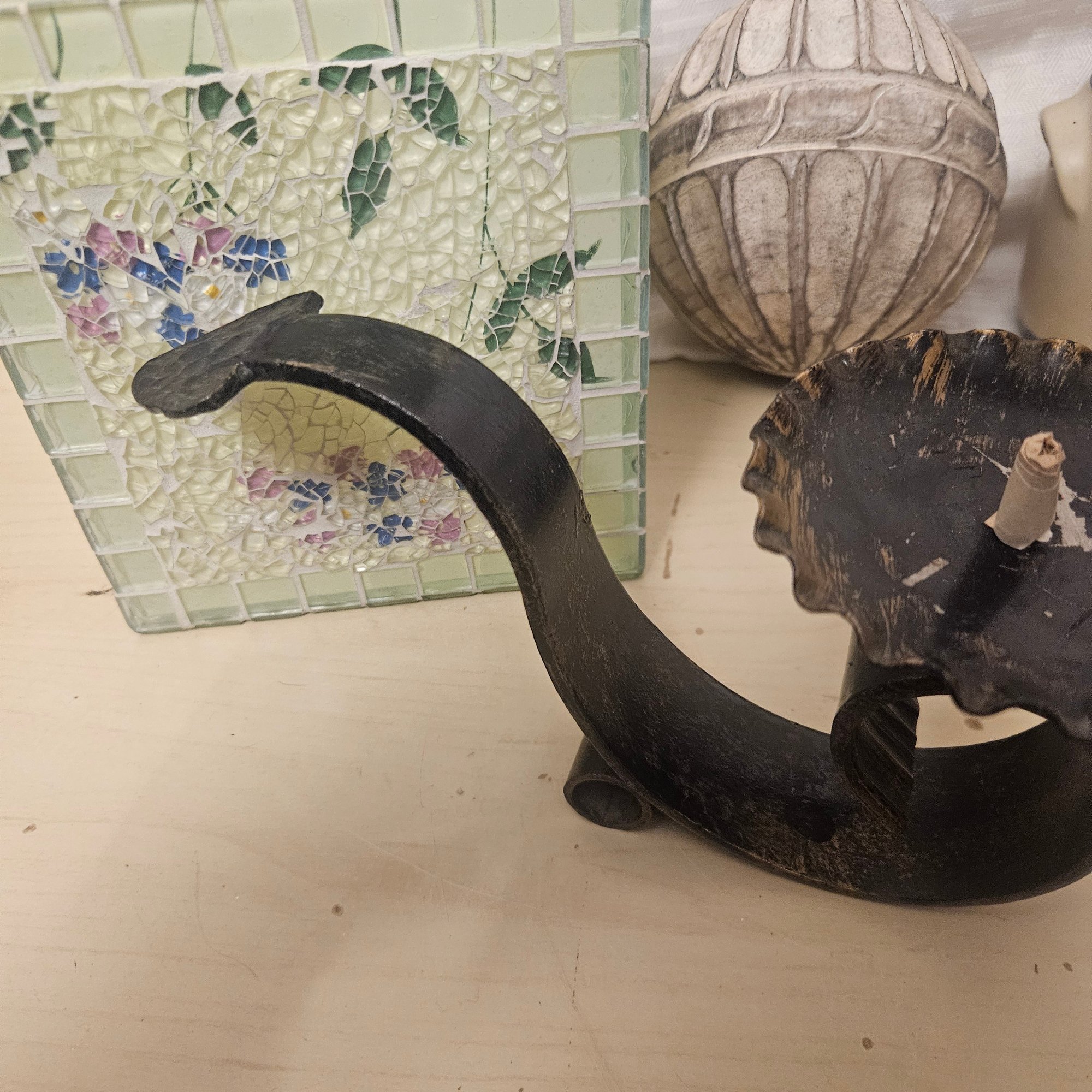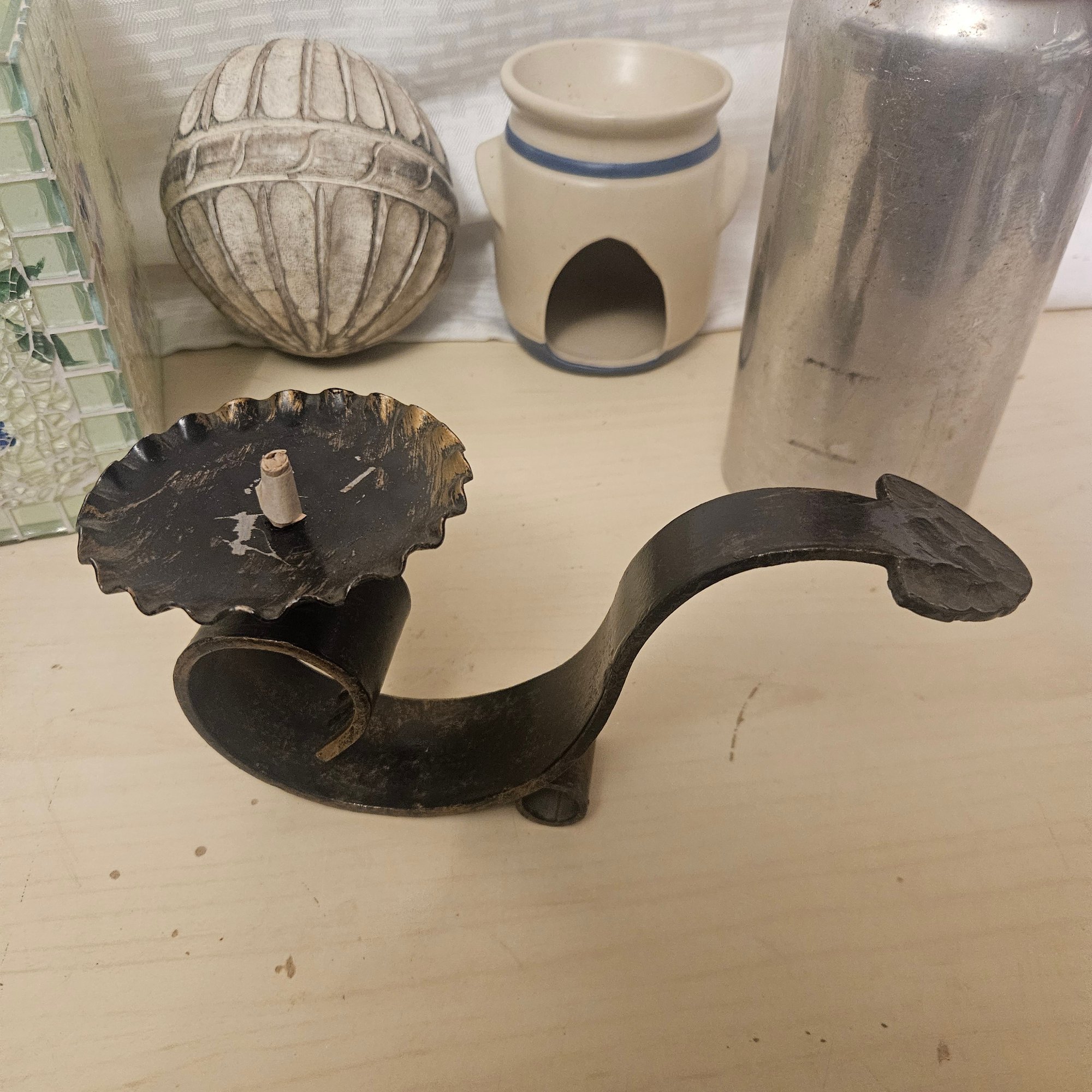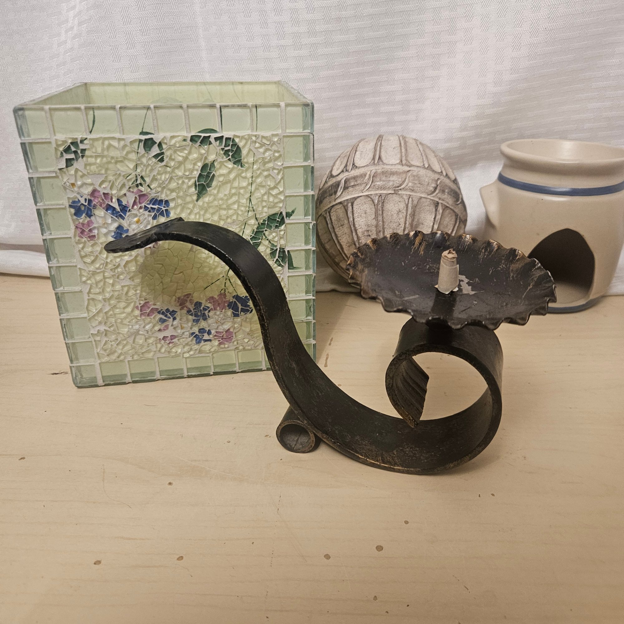 This distinctive decorative lot includes a glass display box, a black metal candle holder, a decorative accent ball, a candle melter, and an old Sparklets soda syphon that adds vintage character and charm. Blending modern accents with nostalgic appeal, this set is perfect for creating an eye-catching display on a shelf, table, or mantel. A great collection for décor enthusiasts who appreciate unique pieces with personality and history.