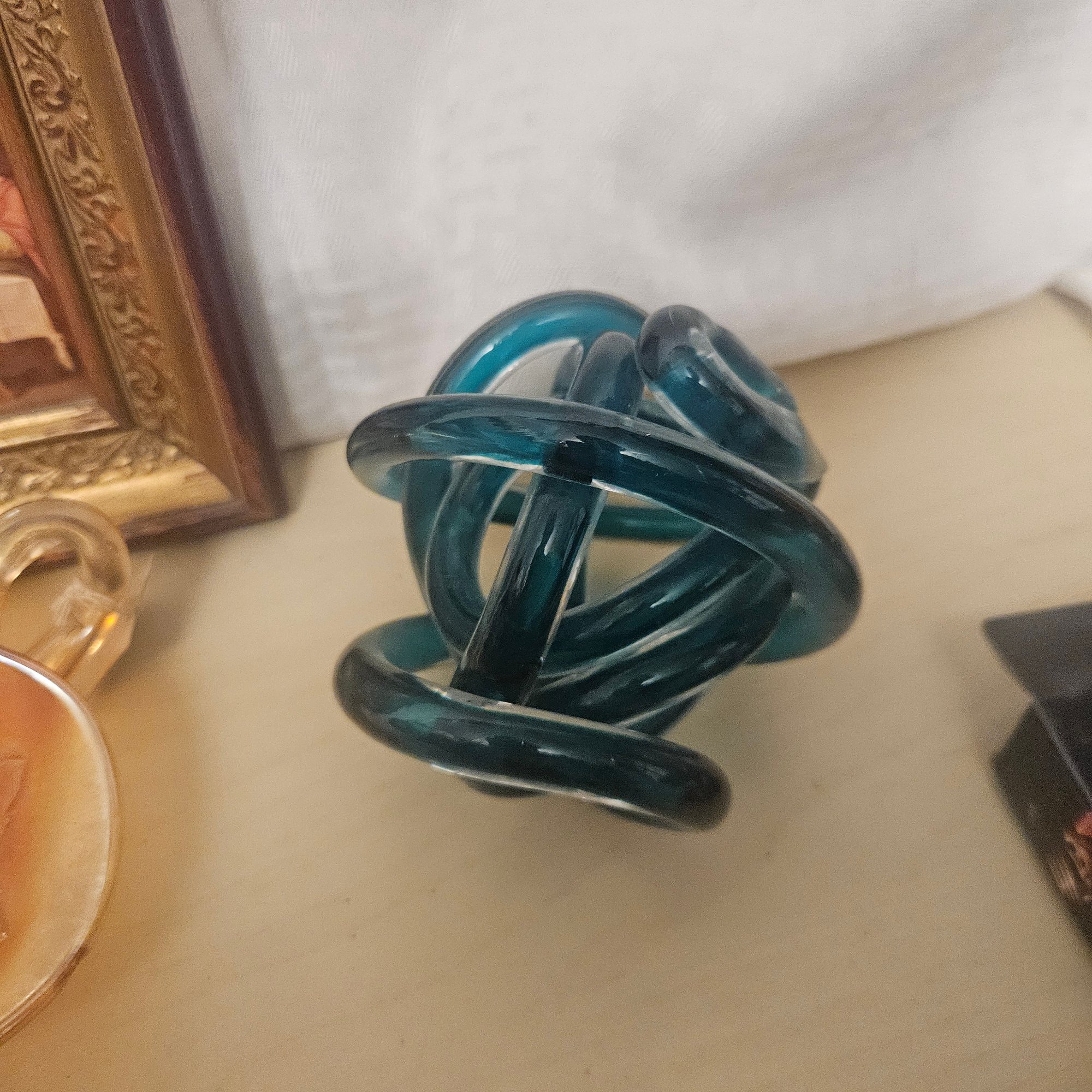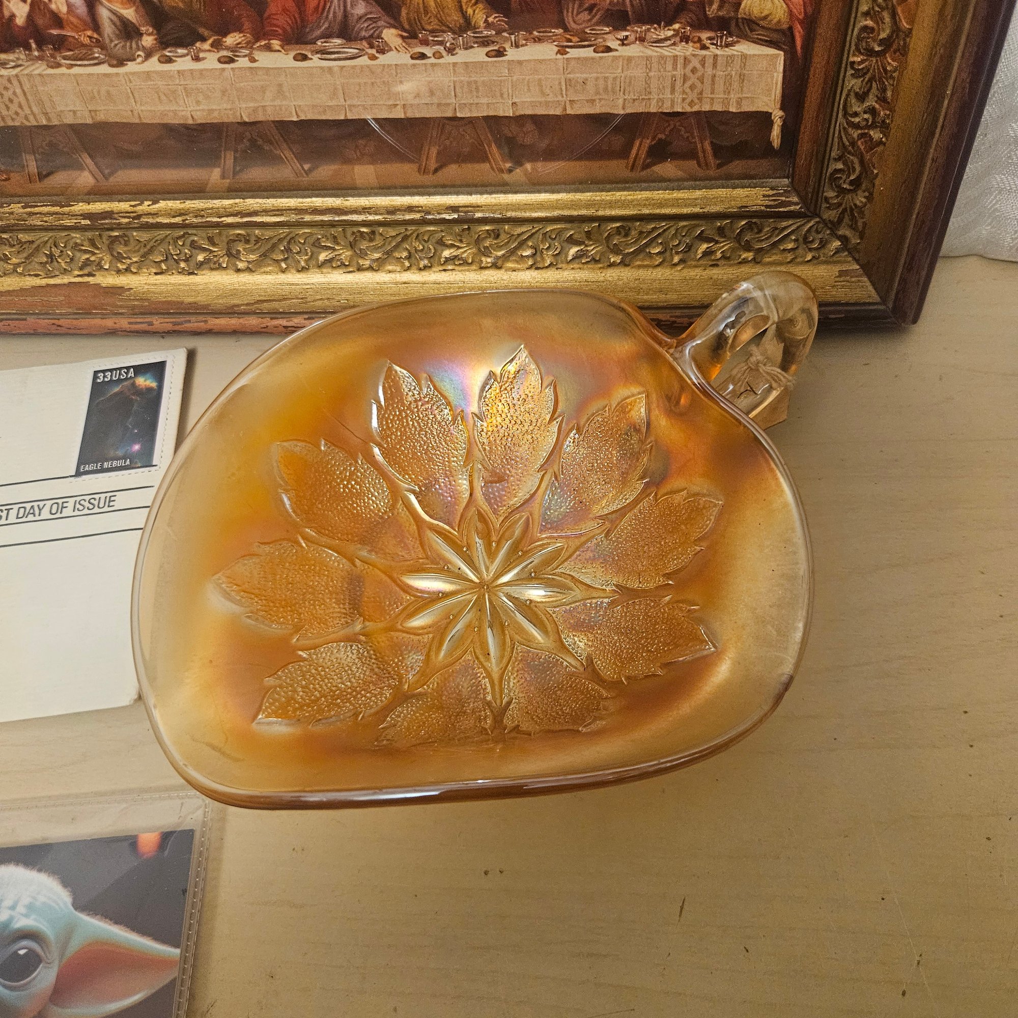 This diverse lot includes a framed Last Supper print, a cross, a Grogu (Baby Yoda) picture, an orange glass bowl, an impossible knot sculpture, a Star Wars gift set, and additional assorted items. Blending spiritual décor with whimsical and pop culture elements, this collection is perfect for collectors, decorators, or anyone who enjoys unique and conversation-starting pieces with both visual appeal and character.