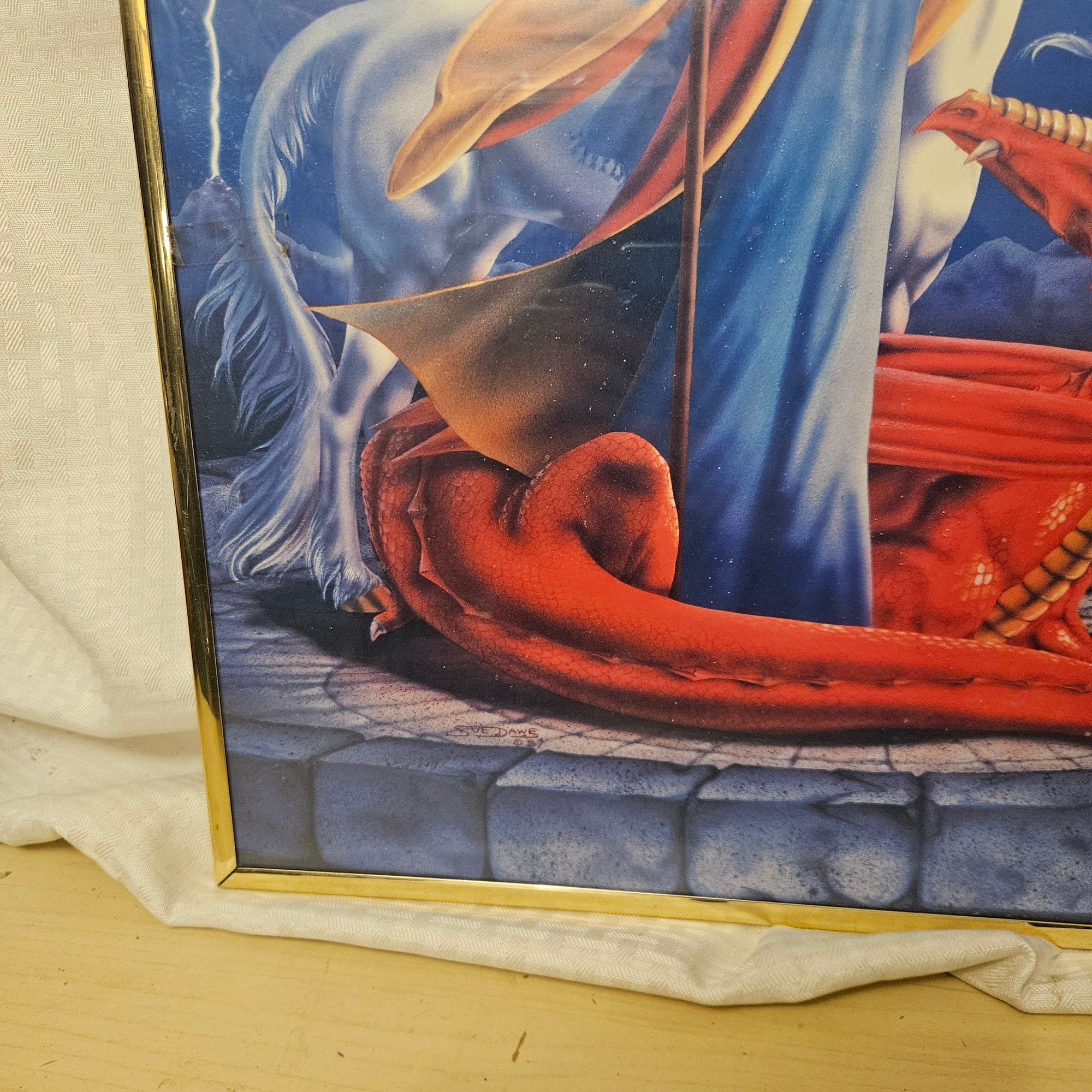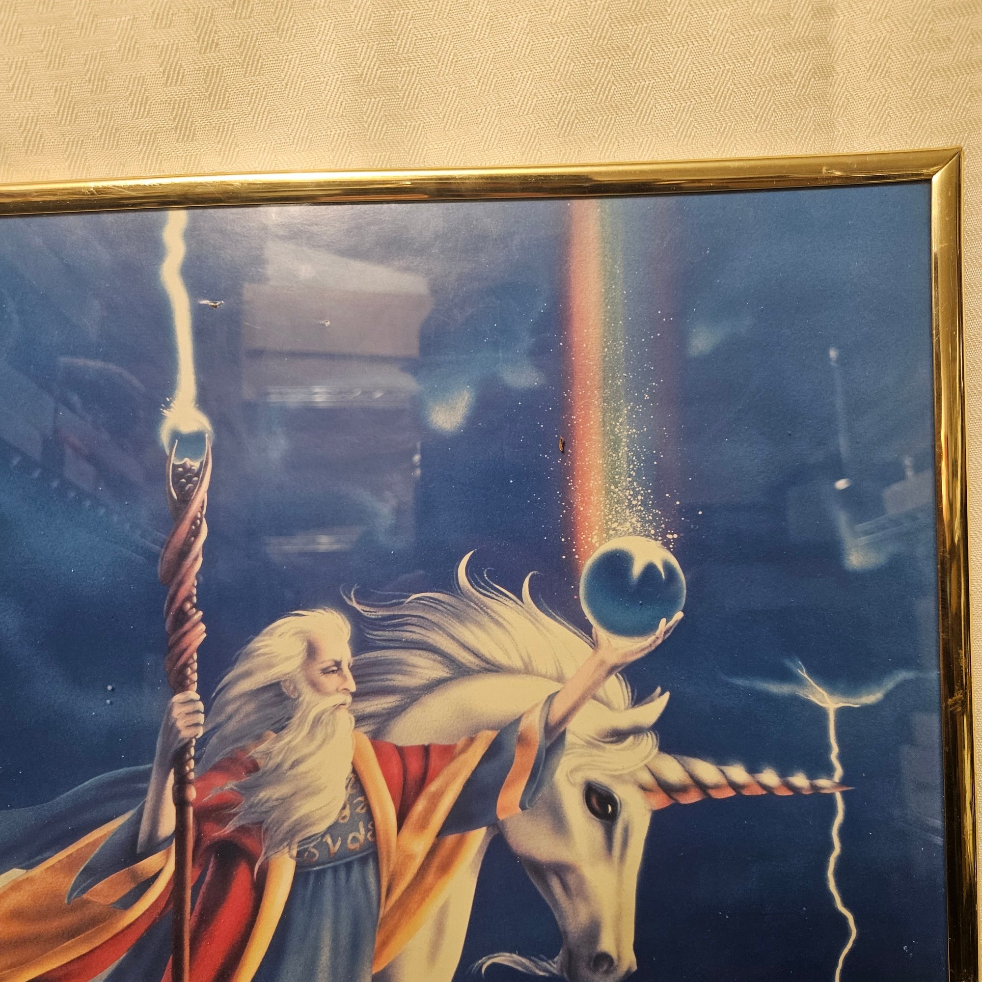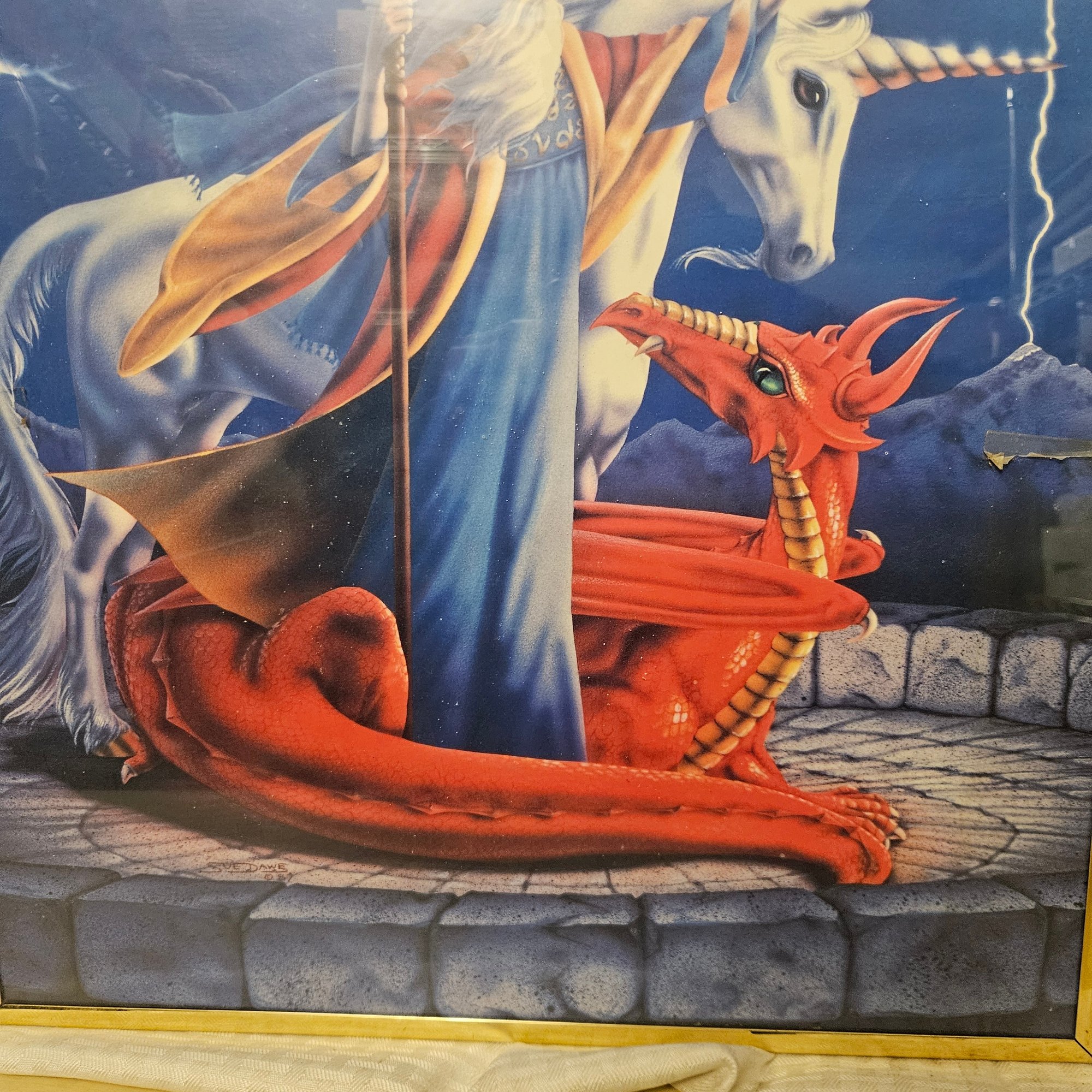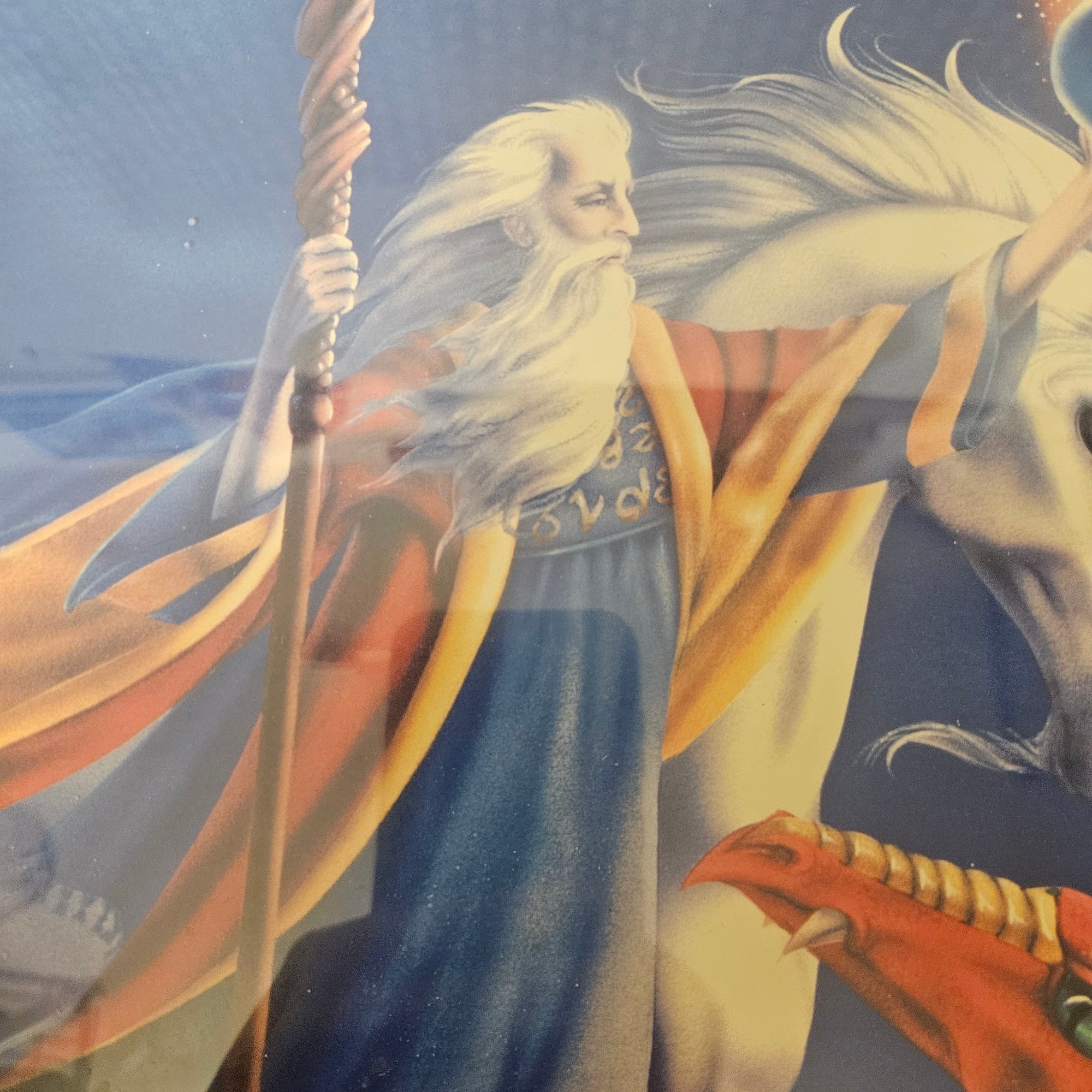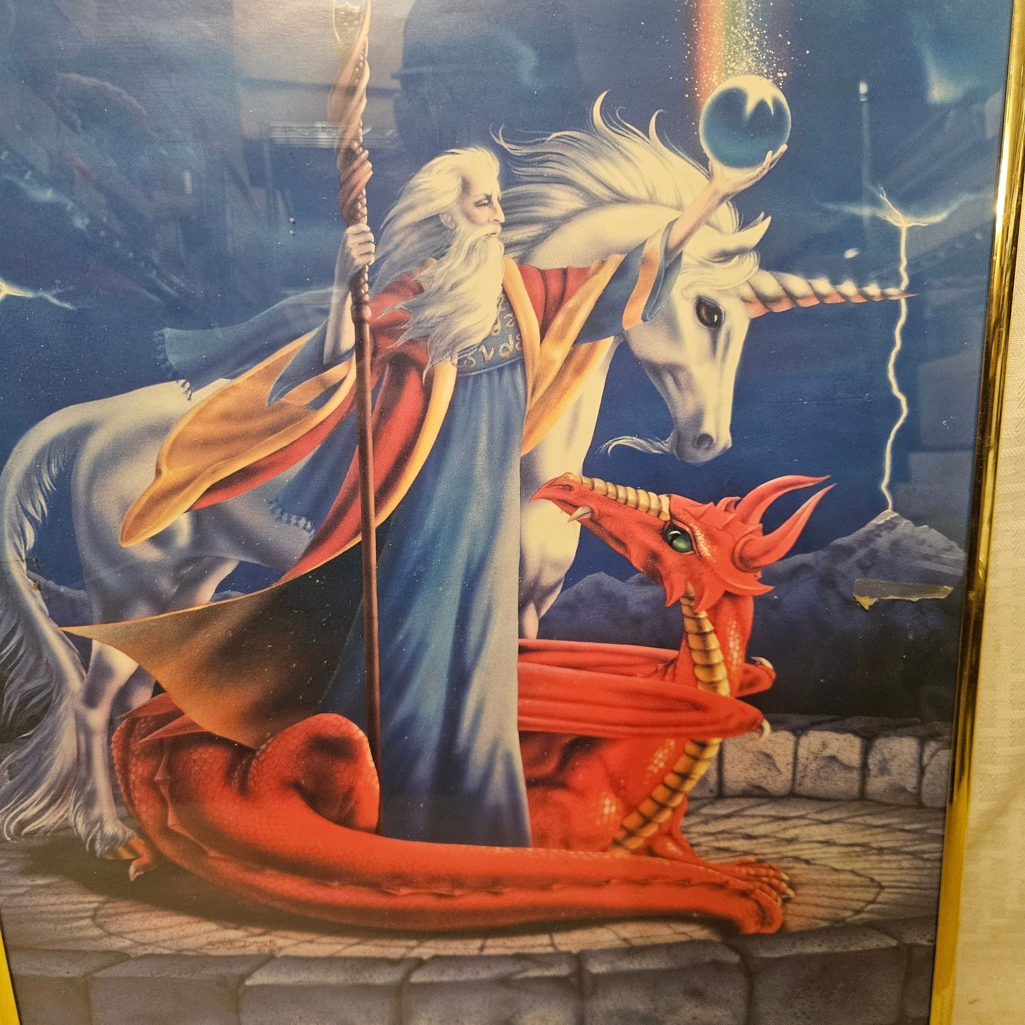 This framed picture features a captivating fantasy scene with a wizard, a Pegasus, and a dragon. Perfect for fans of mythology, fantasy art, or imaginative décor, this artwork adds a magical and adventurous touch to any room or collection. Ideal for display in bedrooms, offices, or as a unique gift for fantasy enthusiasts.