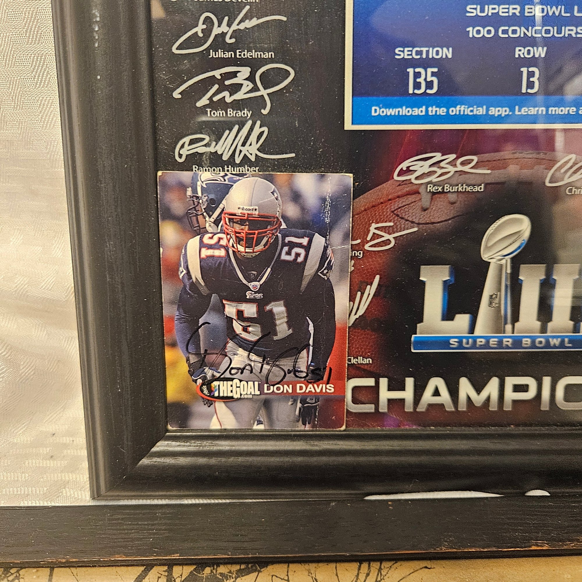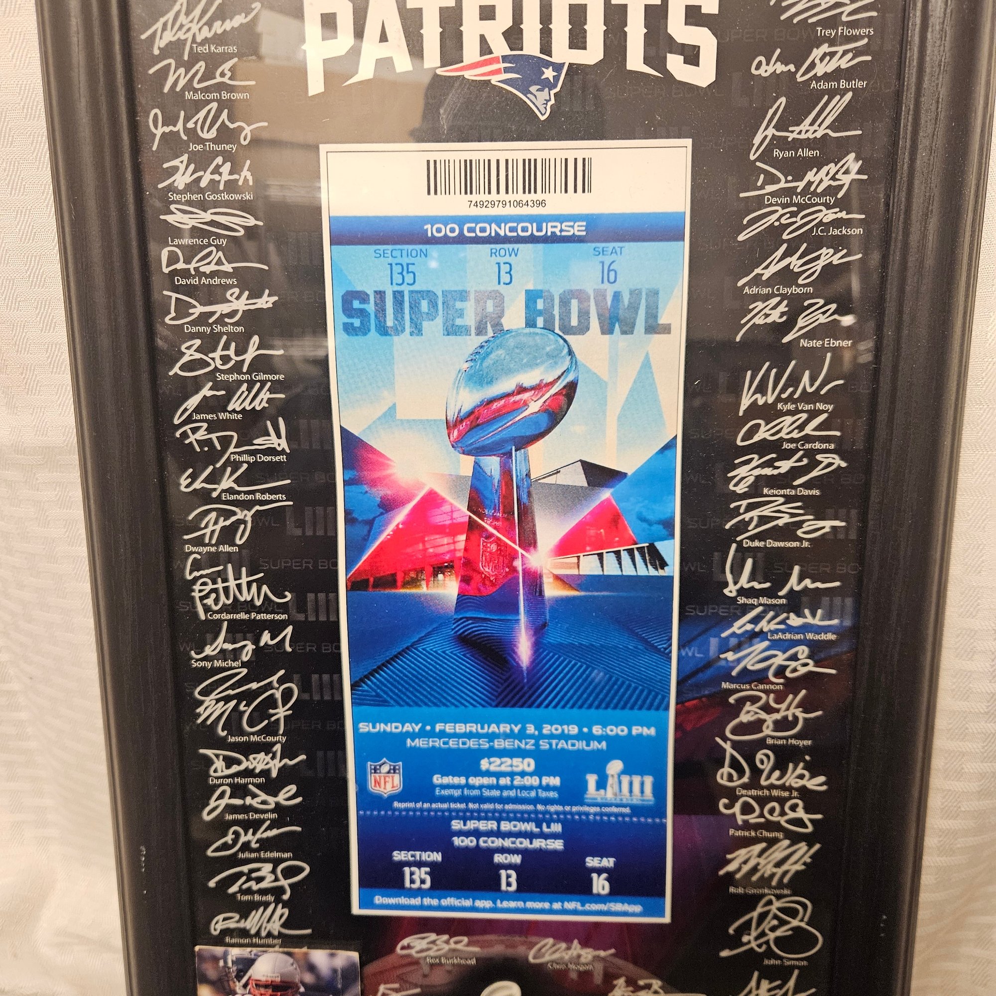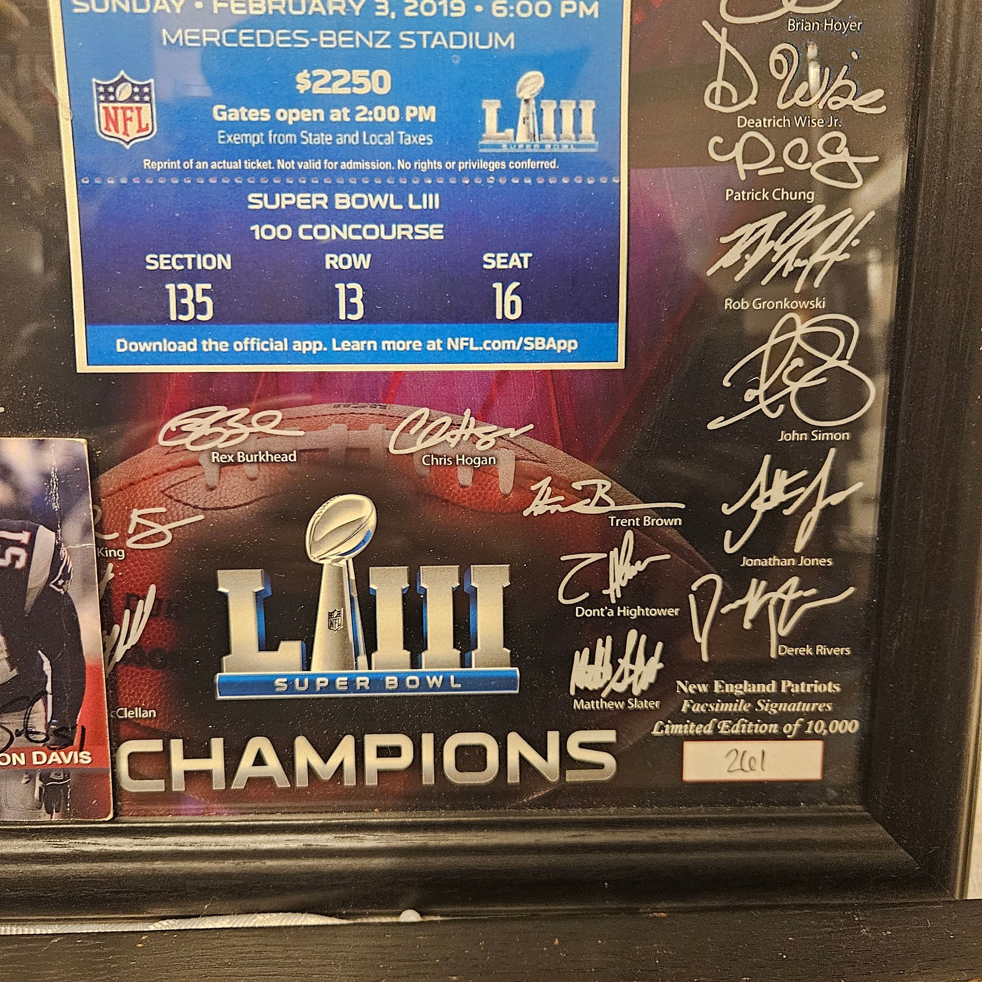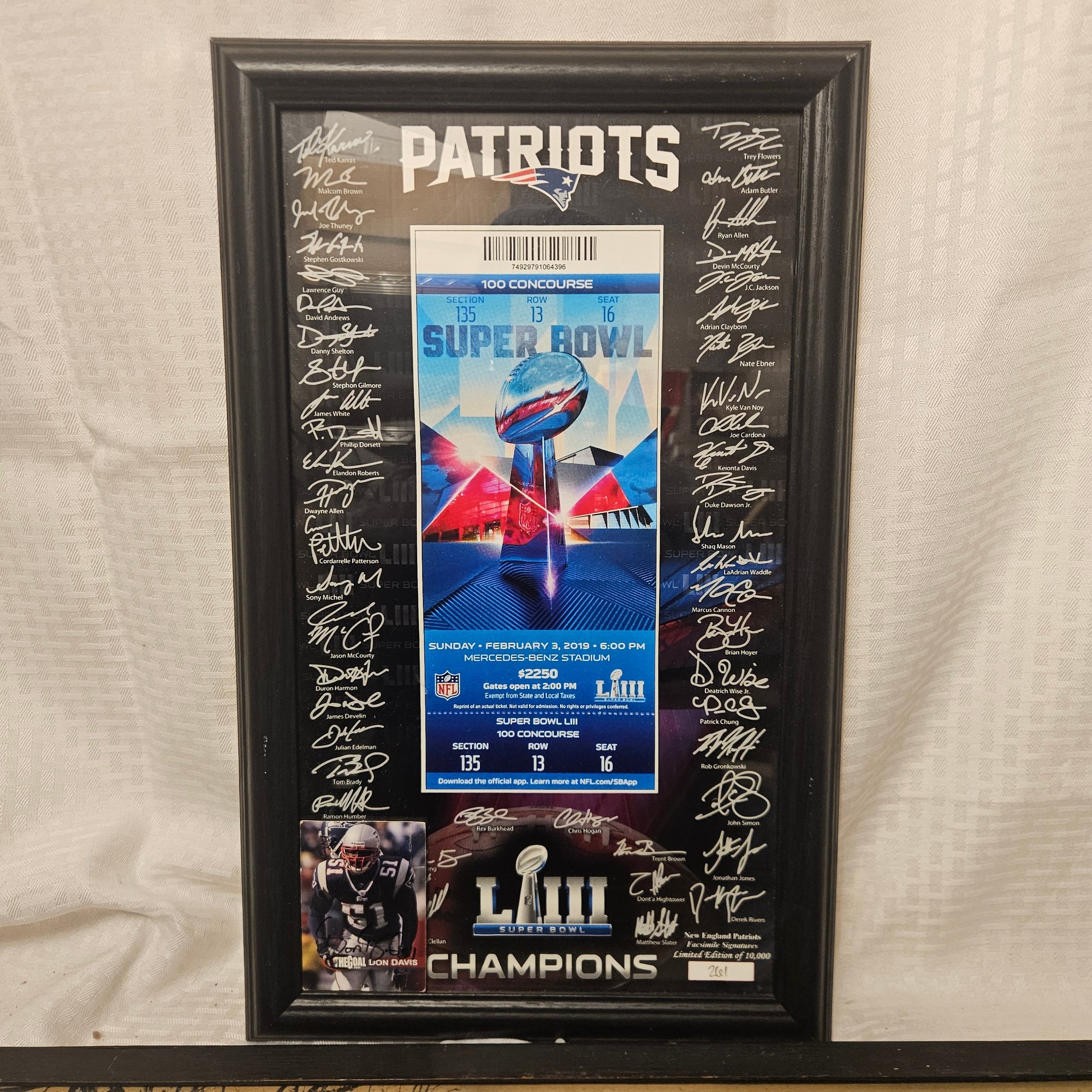 This lot includes two framed pictures: one commemorating the New England Patriots LIII Championship and one featuring a black-and-white cityscape. Perfect for sports fans, art enthusiasts, or collectors, this assortment offers a mix of memorable sports history and classic urban décor for display in homes, offices, or man caves.