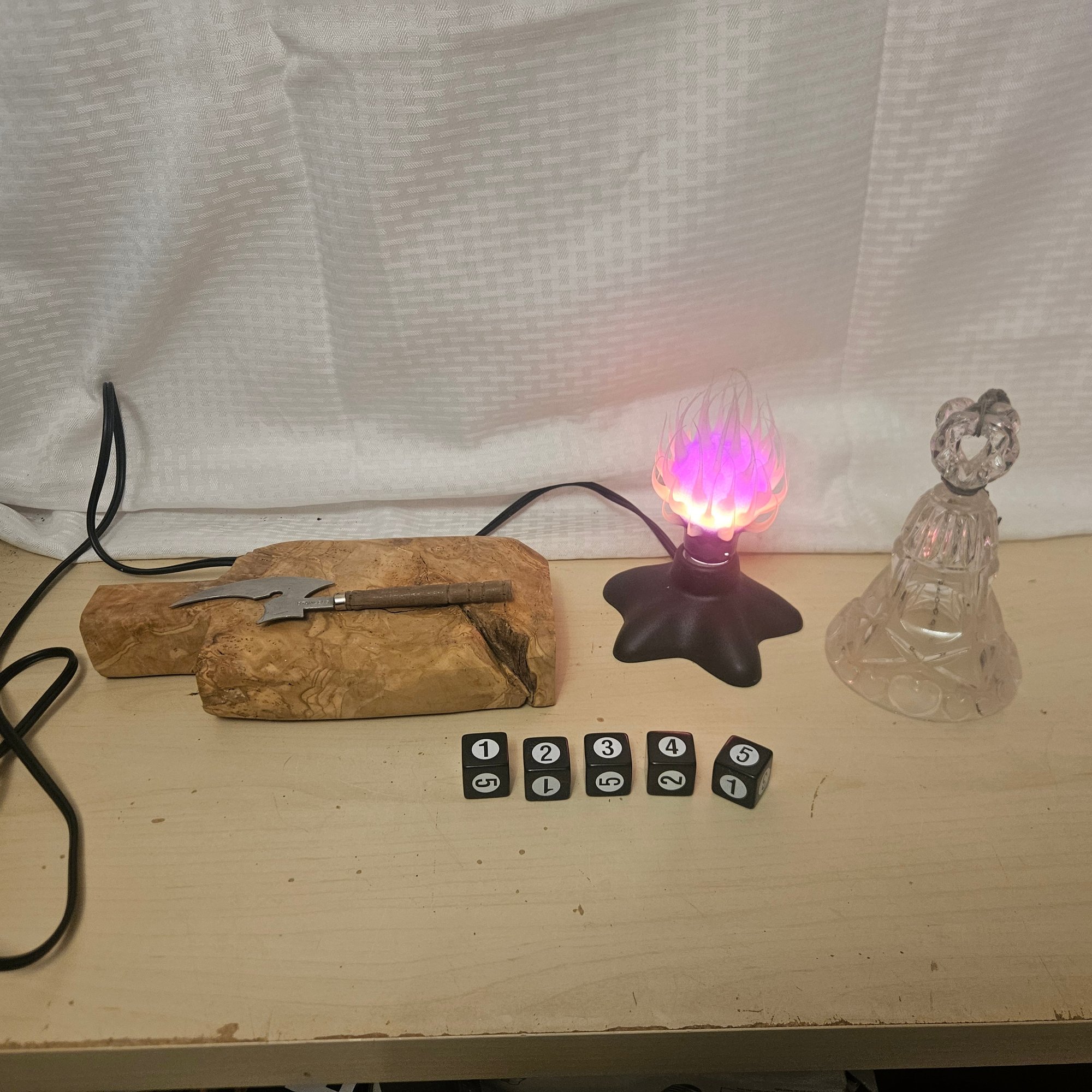 This charming and functional lot features an interesting night light, a cheese knife with a wooden stand for stylish serving, five dice for games or display, and a delicate glass bell that adds a touch of elegance. Blending practicality with decorative appeal, this assortment is perfect for a kitchen, game room, or cozy living space. A versatile and appealing bundle with something for everyone.
