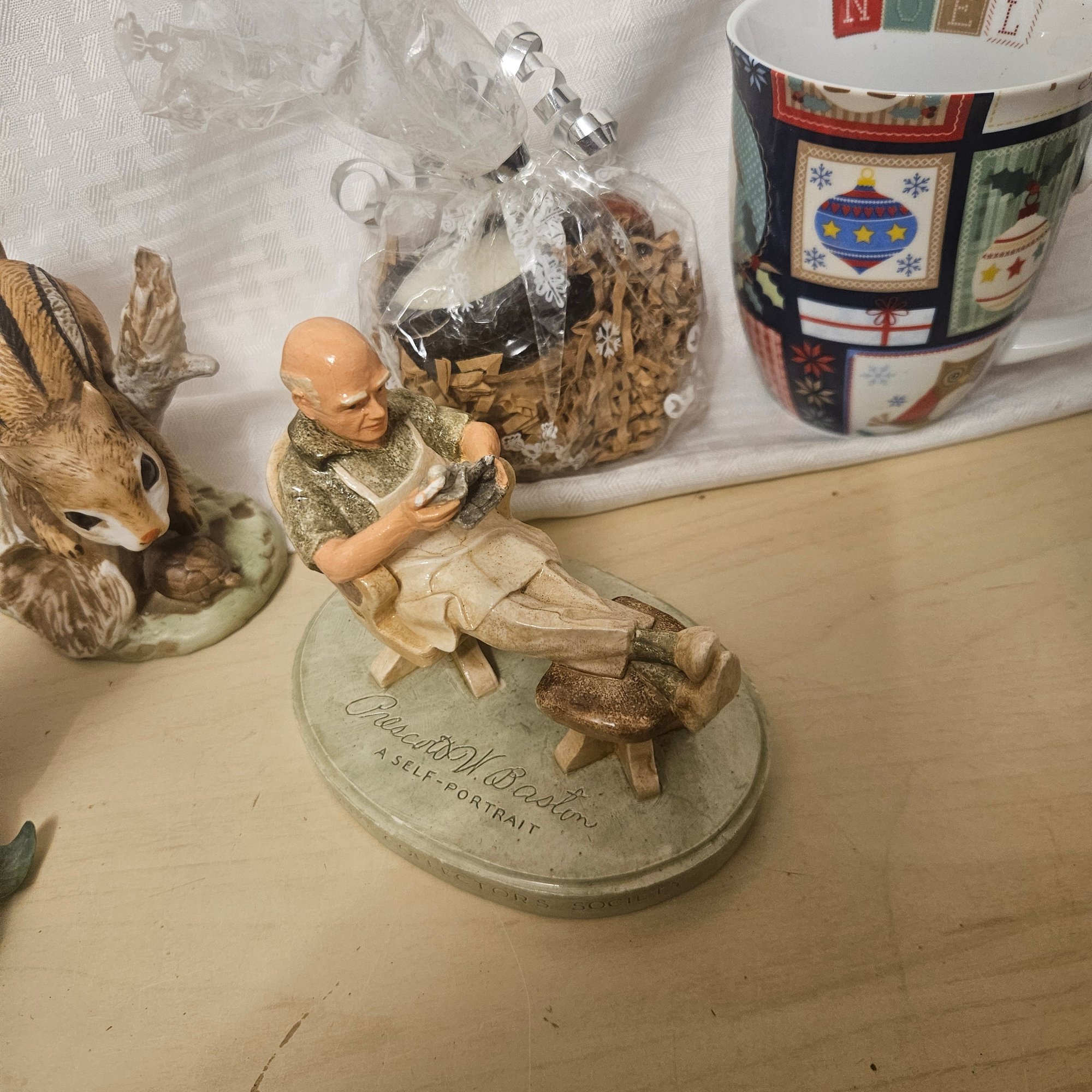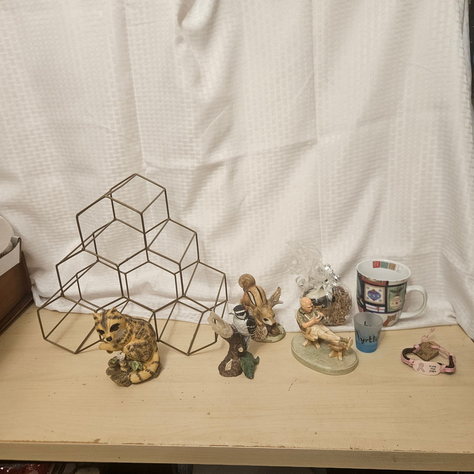 This eclectic lot features a metal honeycomb storage structure, a variety of porcelain animal figurines, a cup, a bracelet, and a figurine of a man sitting. Perfect for collectors, crafters, or decorators, this assortment offers a mix of decorative, functional, and unique items, adding charm and versatility to any collection or display.