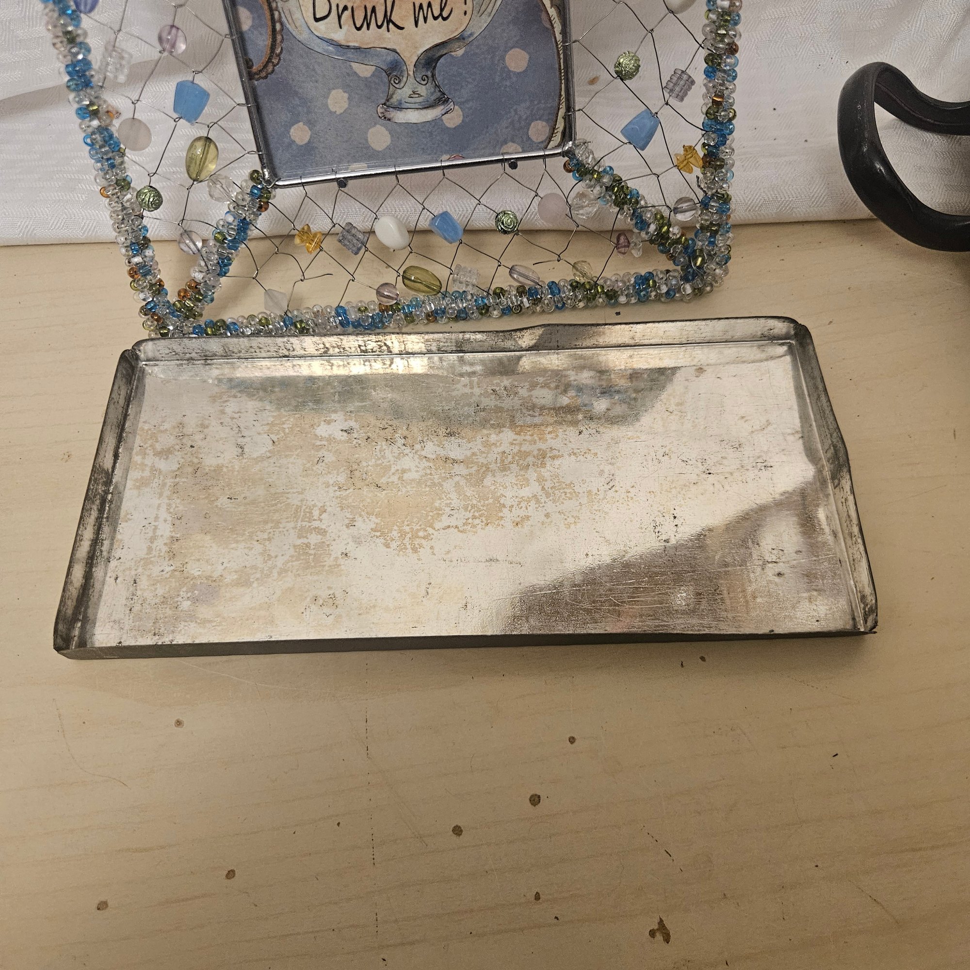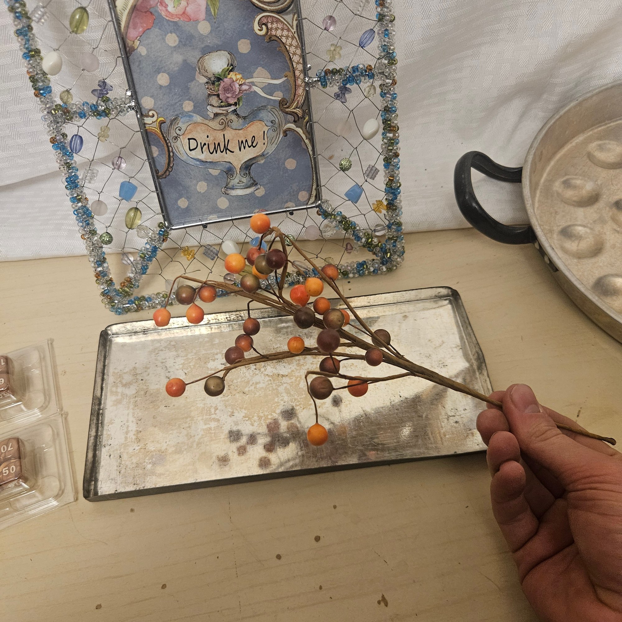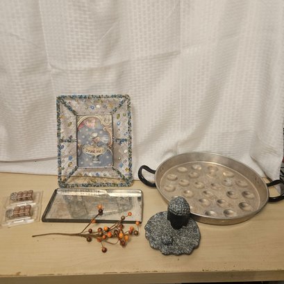 This eclectic lot includes a “Drink Me” picture frame, a fall branch decoration, a large metal tray, several dice, and additional assorted items. Perfect for collectors, crafters, or home decorators, this assortment offers a mix of seasonal décor, playful gaming elements, and versatile display pieces all in one unique collection.