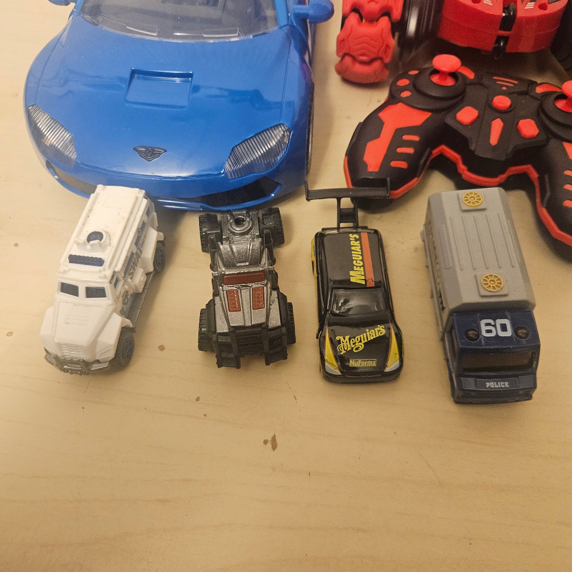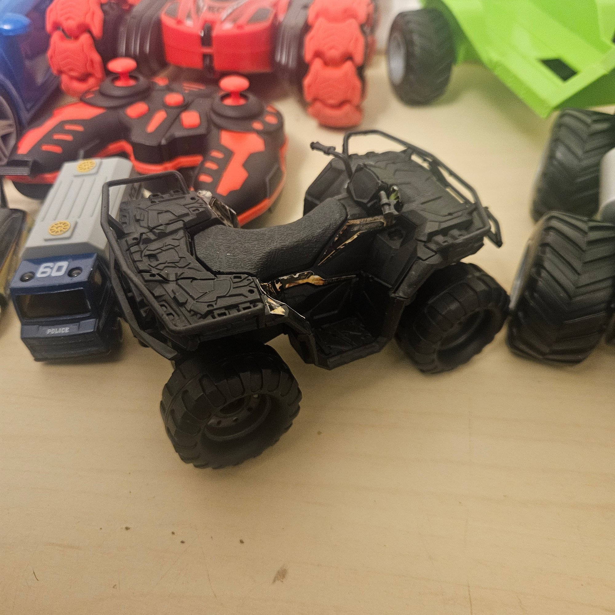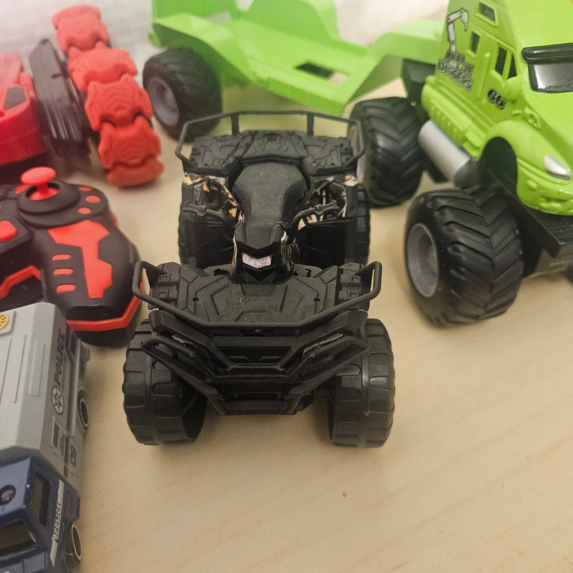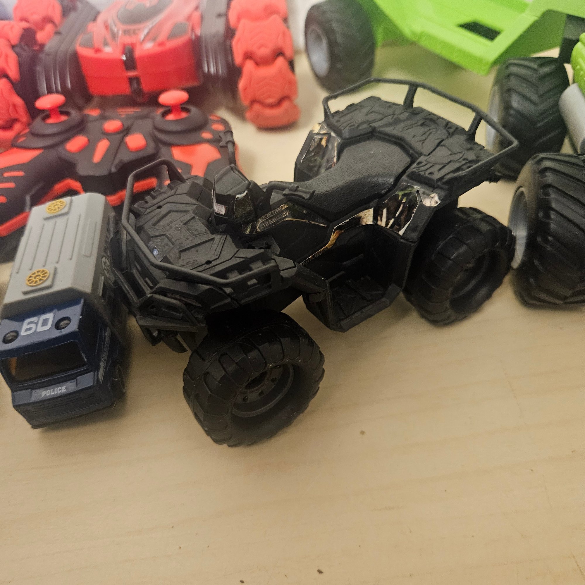 This exciting lot includes a double-sided remote control car, four die-cast cars, one large metal blue car, a four-wheeler, and a toy truck. Perfect for children or collectors, this assortment offers a mix of interactive play, display-worthy vehicles, and durable fun. A dynamic set for imaginative play and vehicle enthusiasts of all ages.