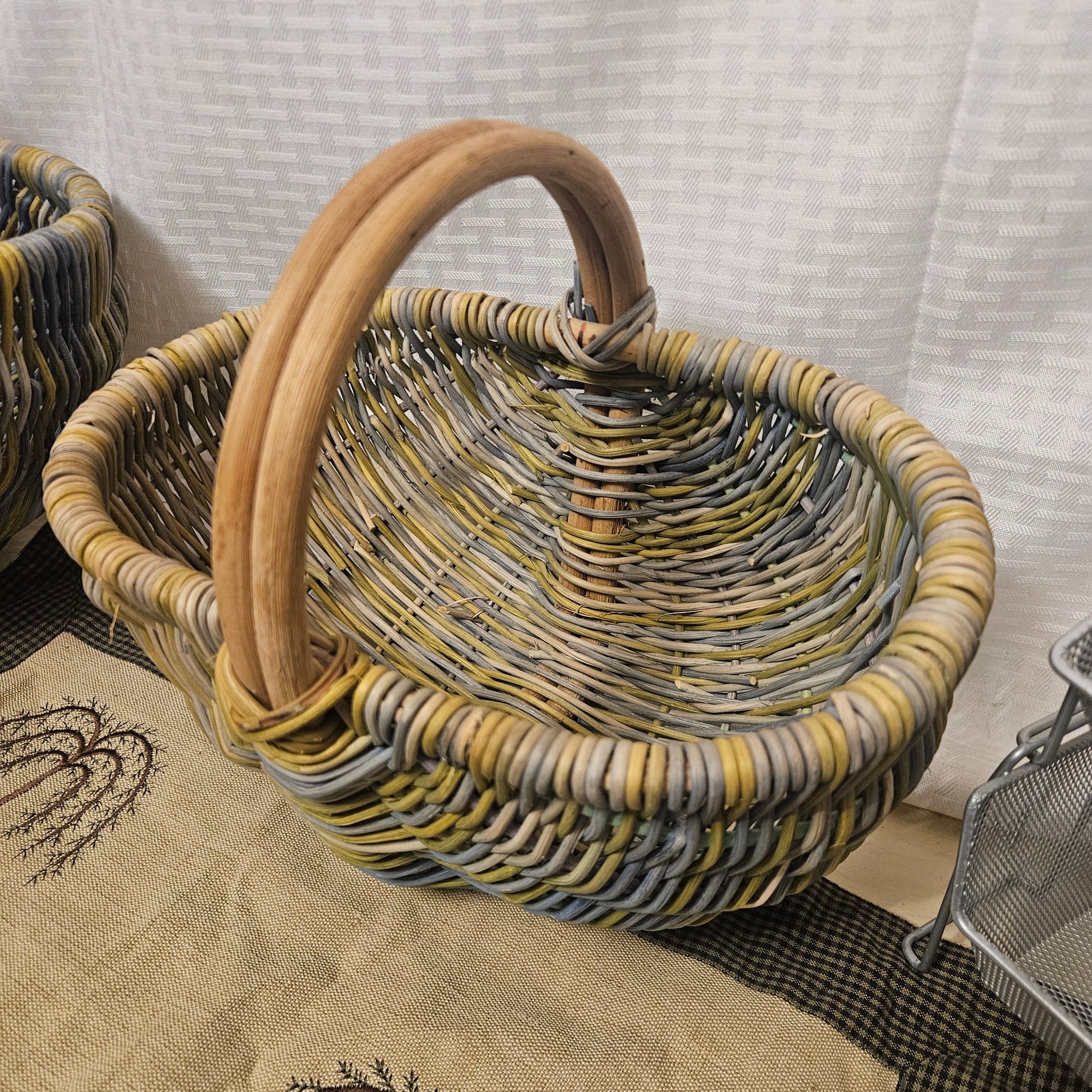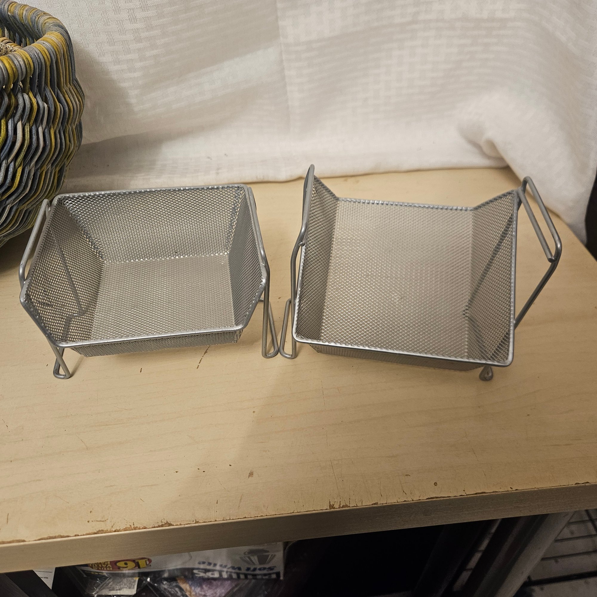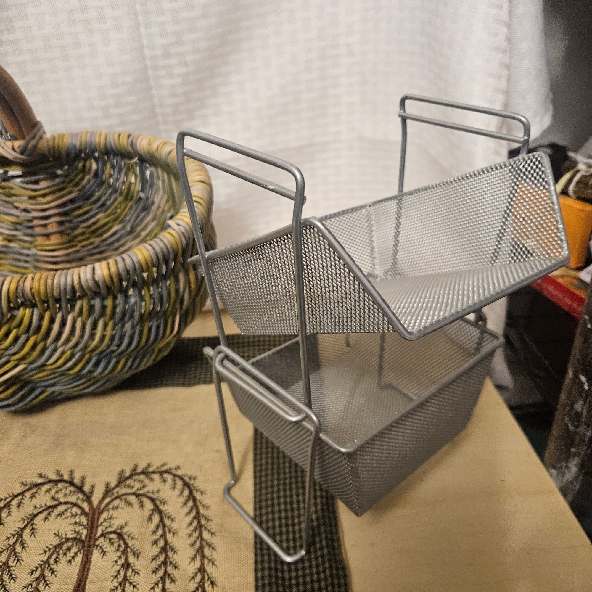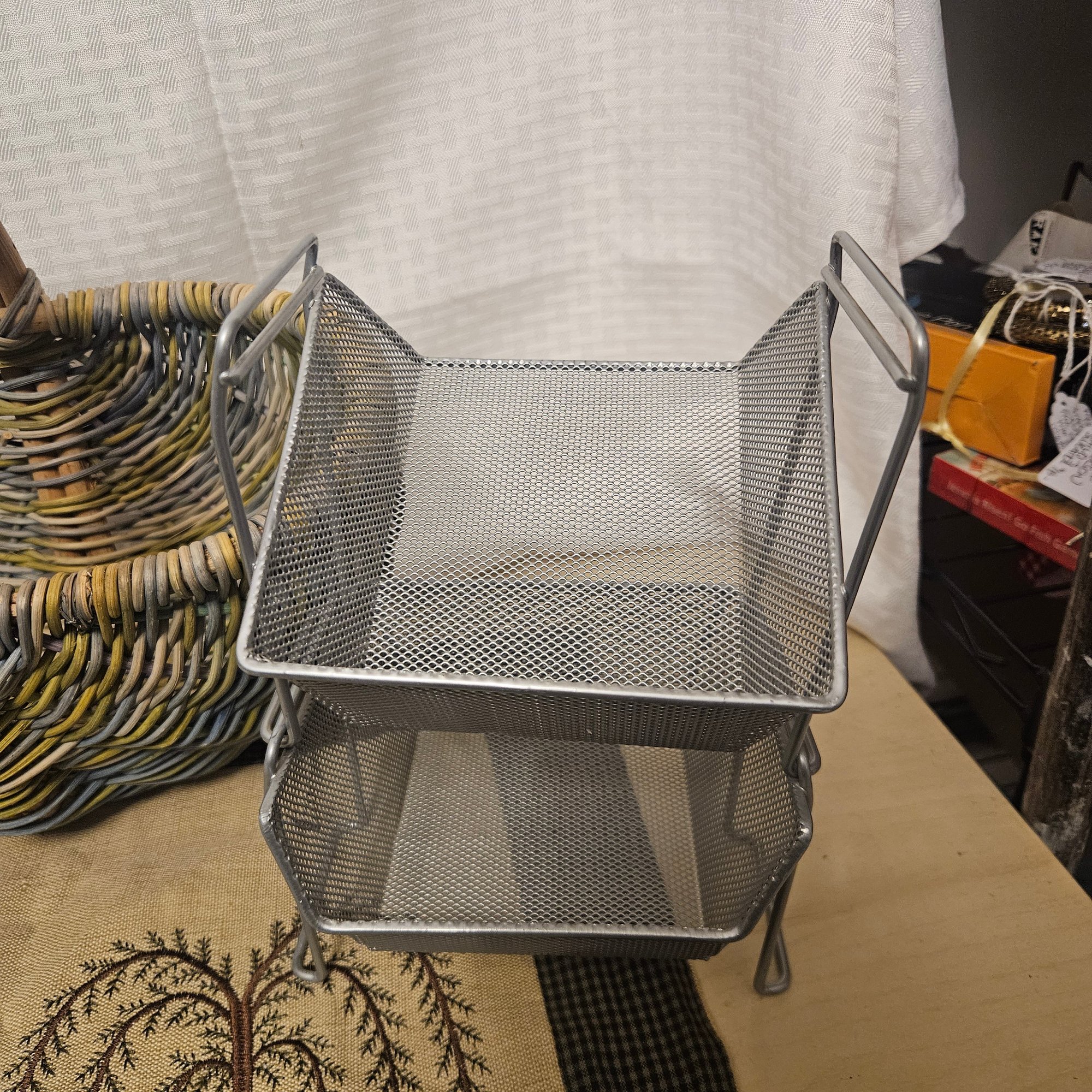 This useful and stylish lot includes two wooden baskets with a warm rustic charm, two metal stacking storage containers ideal for organizing a variety of household items, and one coordinating mat to complete the set. Blending natural wood with durable metal, this versatile group is perfect for adding both function and decorative appeal to a kitchen, entryway, bathroom, or craft space. A great organization solution with timeless style.